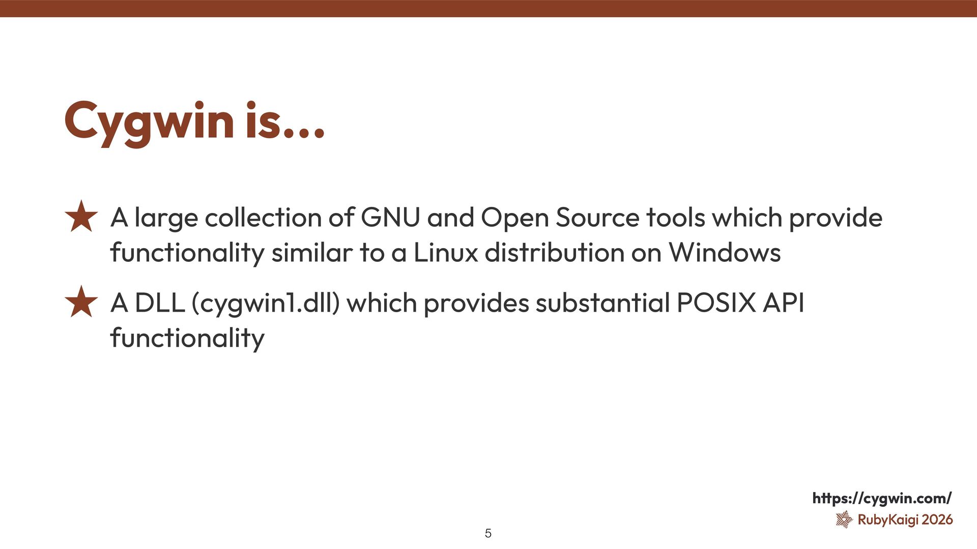 which provide functionality similar to a Linux distribution on Windows ˒ A DLL (cygwin1.dll) which provides substantial POSIX API functionality Cygwin is... 5 h tt ps://cygwin.com/