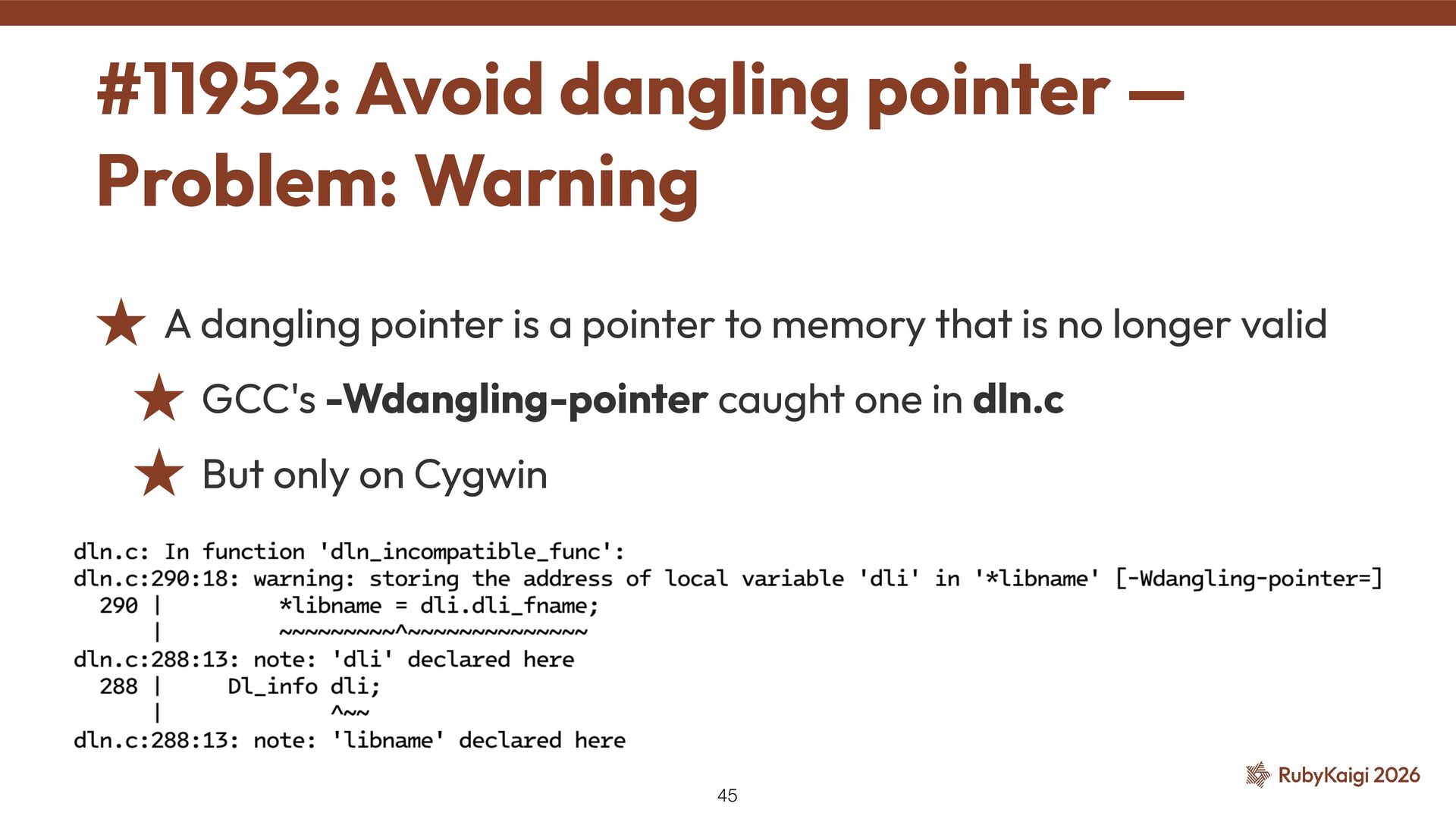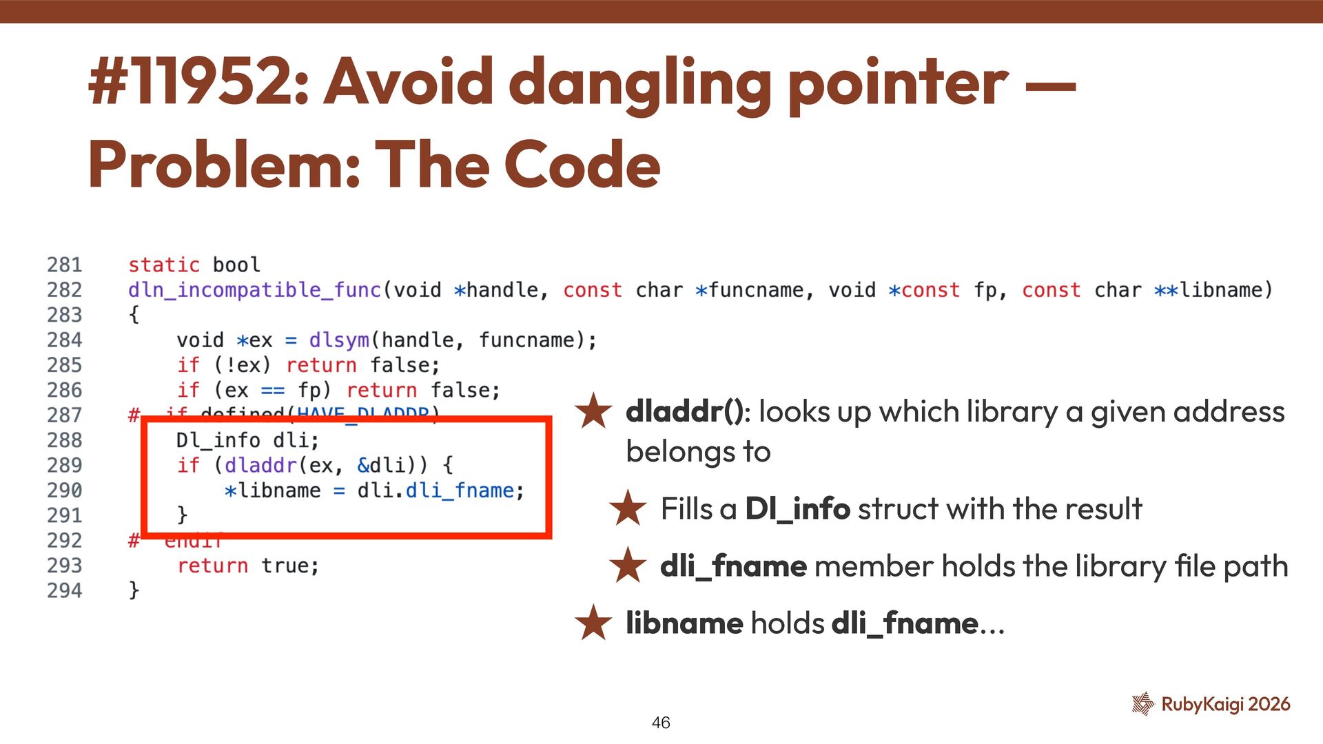 to ˒ Fills a Dl_info struct with the result ˒ dli_fname member holds the library fi le path ˒ libname holds dli_fname... #11952: Avoid dangling pointer — Problem: The Code 46