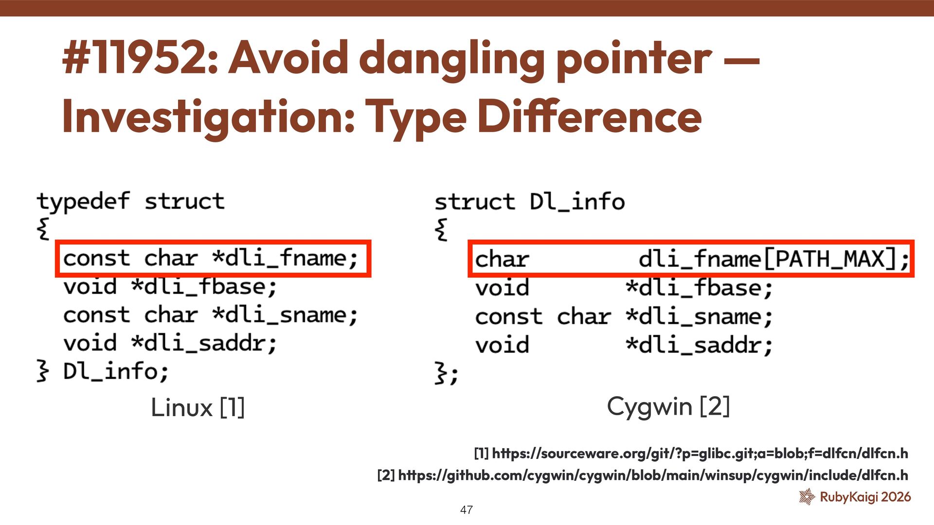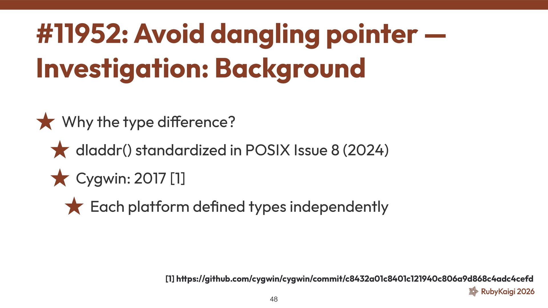 in POSIX Issue 8 (2024) ˒ Cygwin: 2017 [1] ˒ Each platform de fi ned types independently #11952: Avoid dangling pointer — Investigation: Background 48 [1] h tt ps://github.com/cygwin/cygwin/commit/c8432a01c8401c121940c806a9d868c4adc4cefd