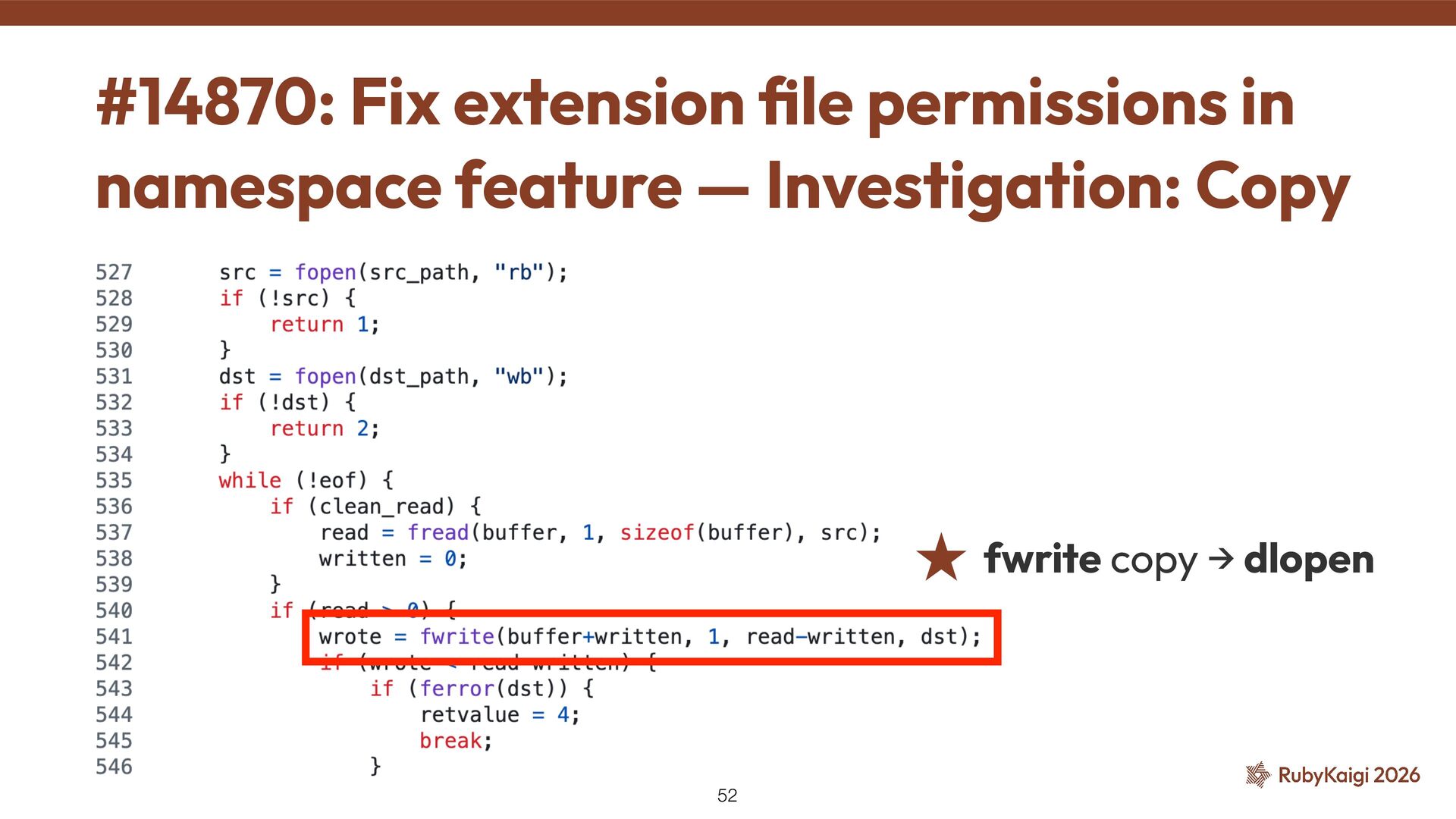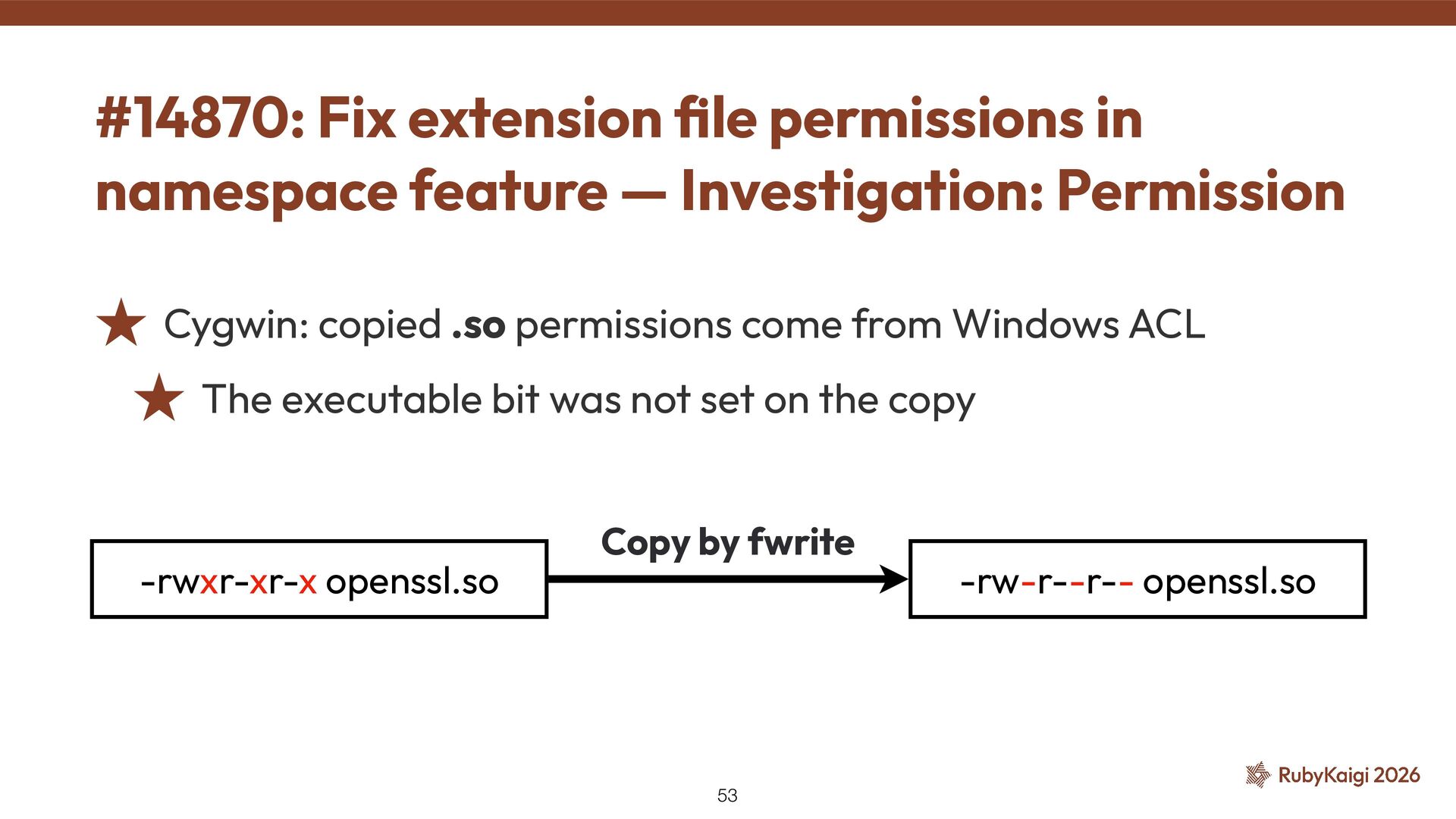 The executable bit was not set on the copy #14870: Fix extension fi le permissions in namespace feature — Investigation: Permission 53 -rwxr-xr-x openssl.so -rw-r--r-- openssl.so Copy by fwrite