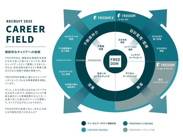 注文住宅の 施工管理 住宅展示場の 相談窓口 SaaSモデルの 開発 FC加盟募集の 法人営業 SaaSモデルの 法人営業 客 集 業 営 設 計 監 理 ・監 修 不 動 産 仲 介 注文住宅 設計 リノベーション 設計 インテリア コーディネート 住まいの コンサルティ ング 不動産 流通 デジタル マーケティ ング RECRUIT 2025 FREEDOMは、 建築設計事務所を経営 する中で培った様々なノウハウを、 長年 ナレッジデータとして蓄積してきました。 それは、 安定成長を続けるコア事業に裏 付けされた知識や経験の情報です。 FREEDOMの事業は、 確かなナレッジデ ータによって、 さらなる事業展開を実施し ています。 そして、 これらの肝となるのはノウハウを 生み出す人材です。 右図のようにコア事 業を基点とした事業展開だからこそ、 一 企 業で 培った能 力 はグ ル ープ を横 断し て、 キャリアを広げることができます。 F R E E D O M の 成 長と共 に、 あなたの 新 たな可能性を見つけませんか? CAREER FIELD 横断的なキャリアへの挑戦 フリーダムアーキテクツ事業本部 FREEDOM X株式会社 FREEDOMマーケティ ング部 FREEDOMビルド株式会社