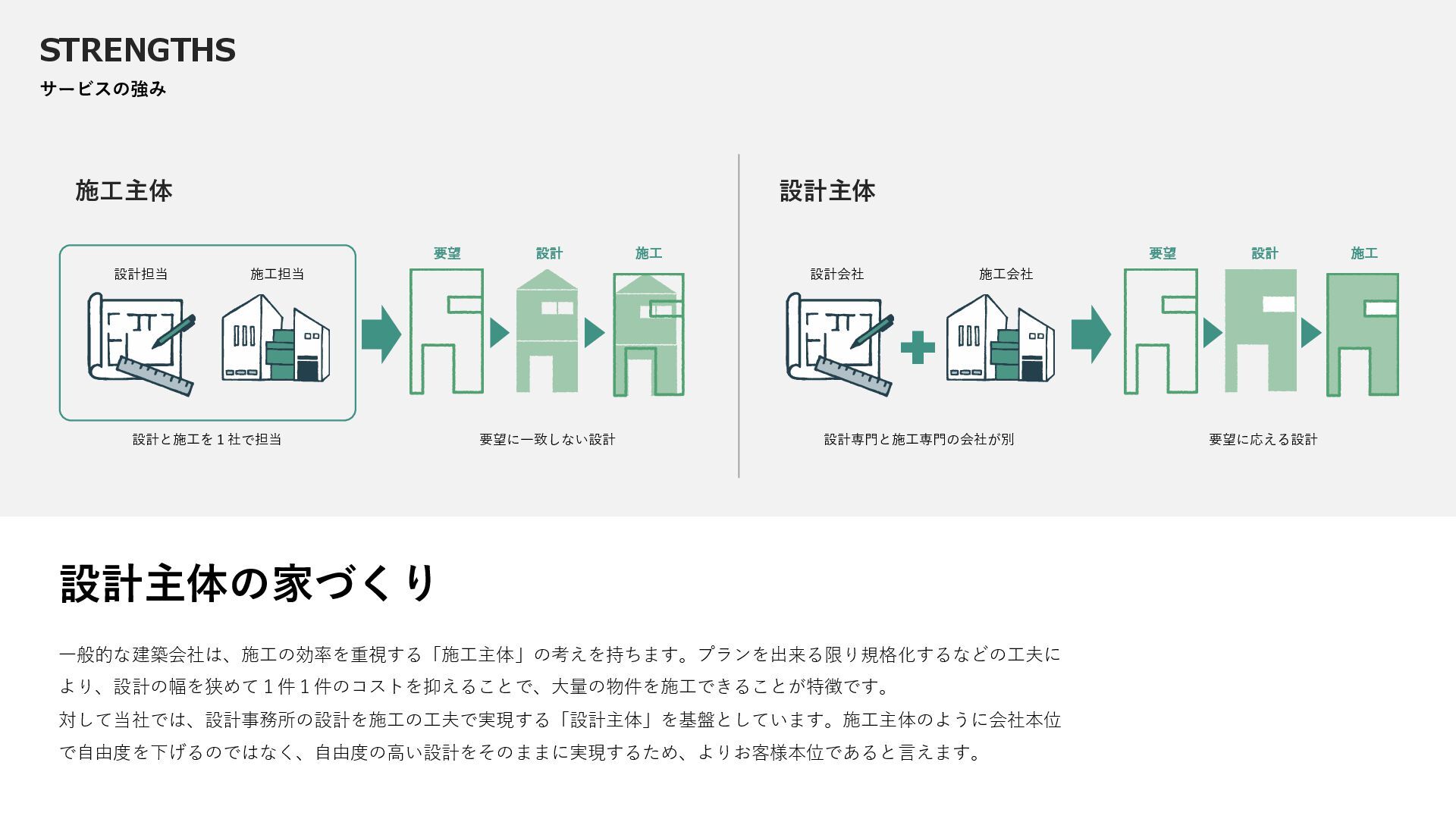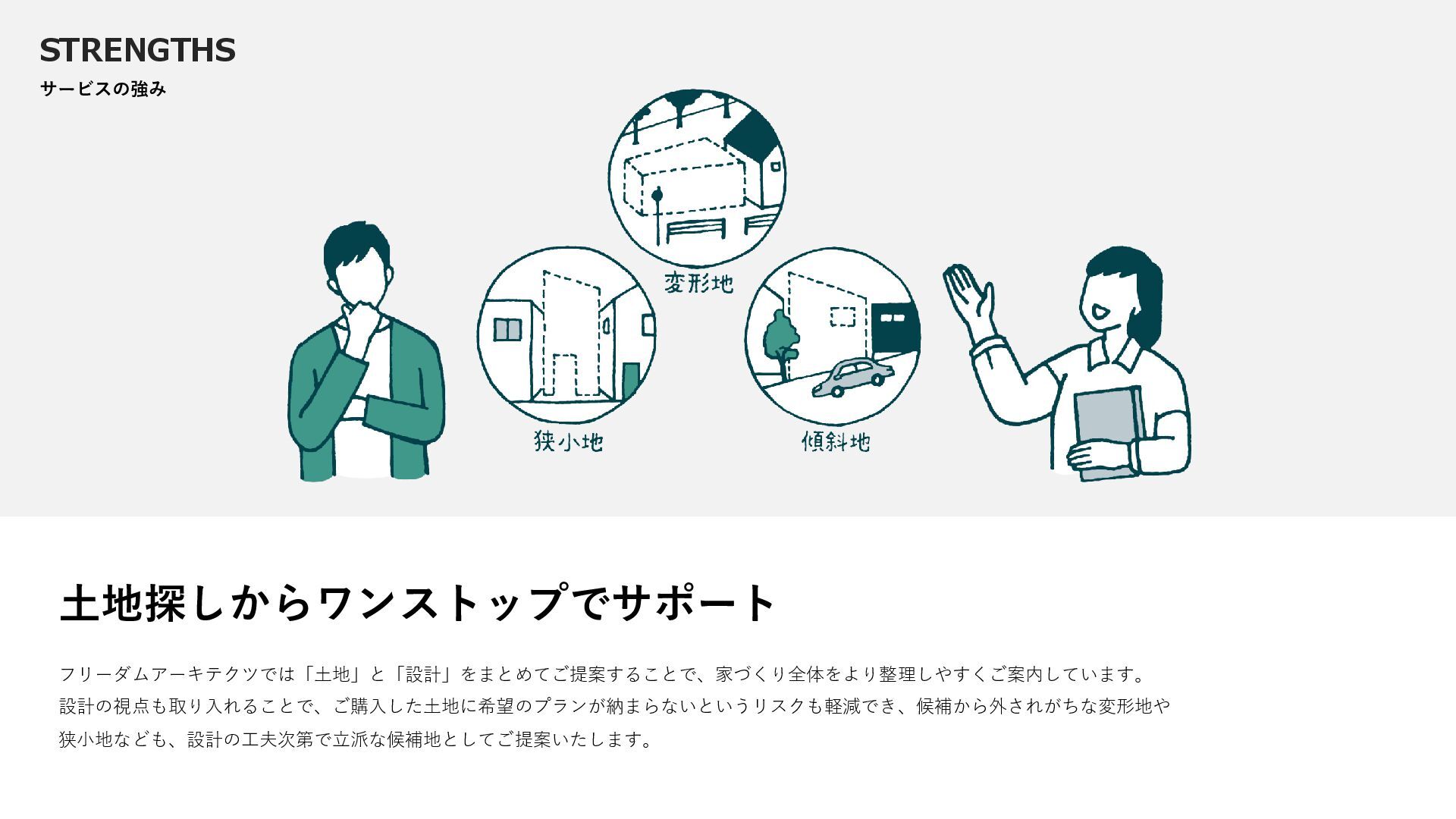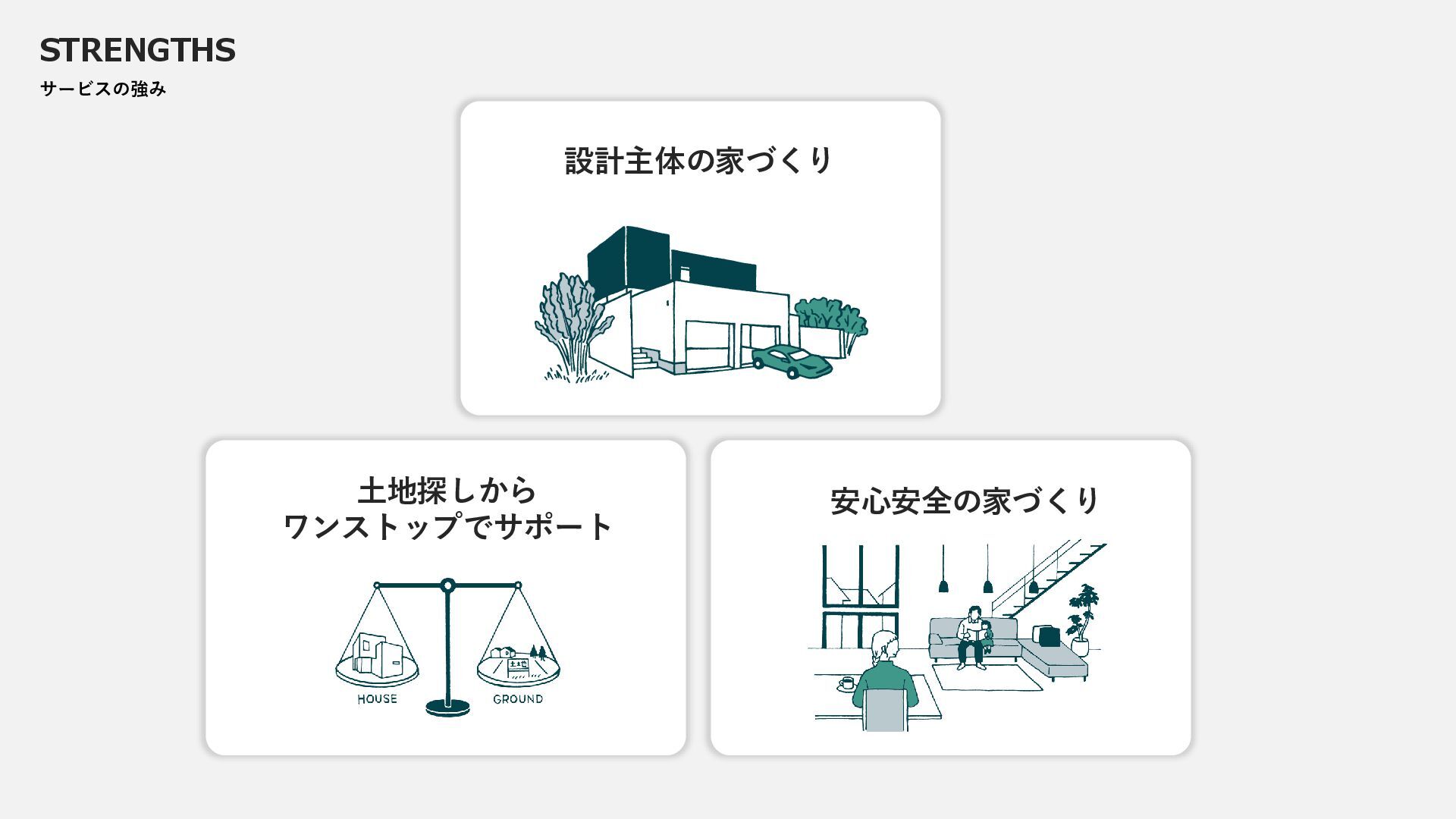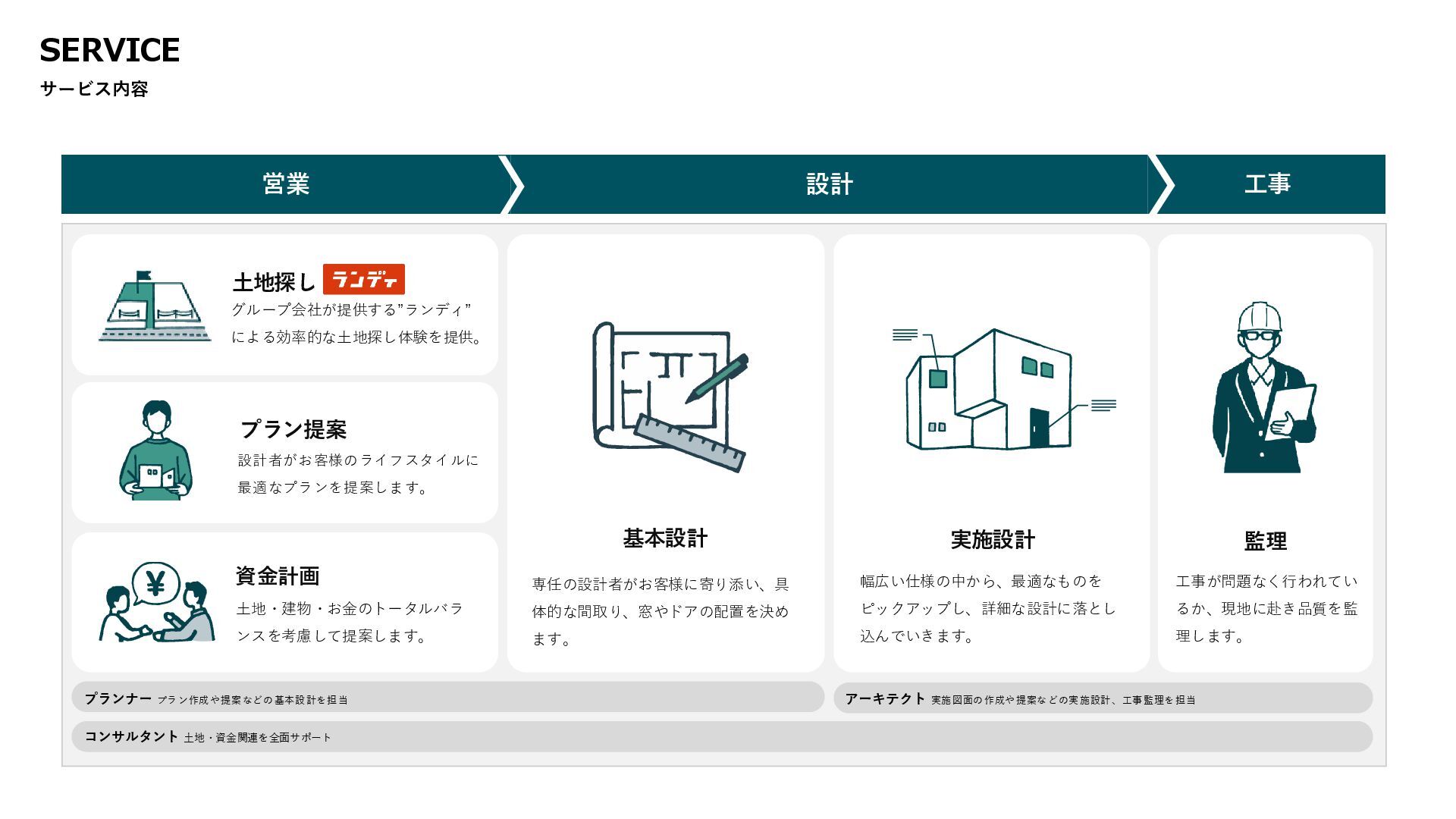 SERVICE 専任の設計者がお客様に寄り添い、具 体的な間取り、窓やドアの配置を決め ます。 グループ会社が提供する”ランディ” による効率的な土地探し体験を提供。 土地・建物・お金のトータルバラ ンスを考慮して提案します。 設計者がお客様のライフスタイルに 最適なプランを提案します。 工事が問題なく行われてい るか、現地に赴き品質を監 理します。 幅広い仕様の中から、最適なものを ピックアップし、詳細な設計に落とし 込んでいきます。 コンサルタント 土地・資金関連を全面サポート プランナー プラン作成や提案などの基本設計を担当 アーキテクト 実施図面の作成や提案などの実施設計、工事監理を担当