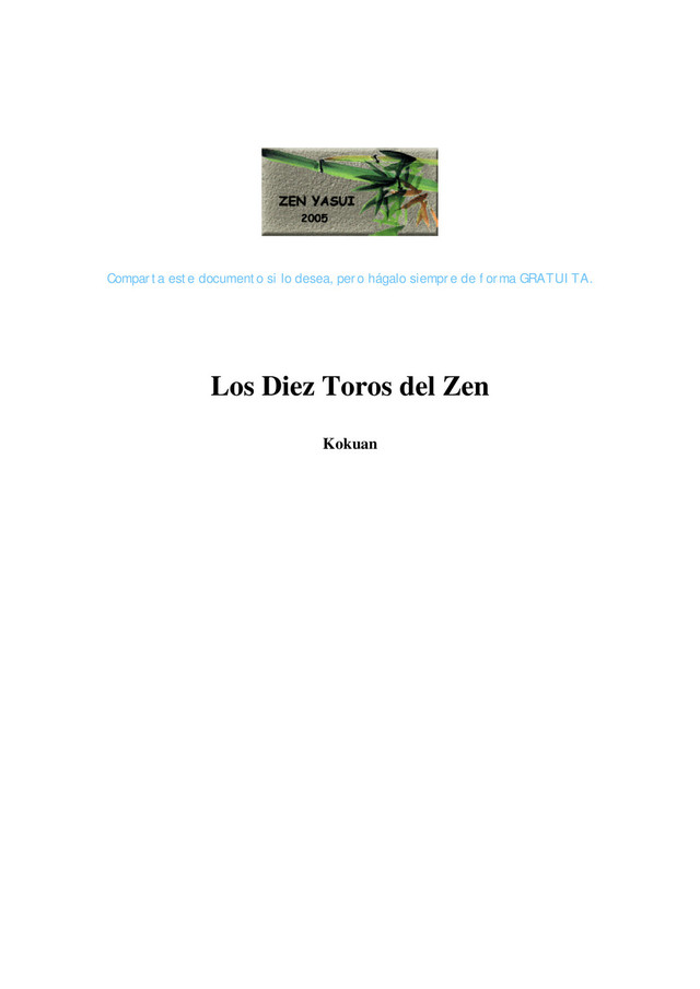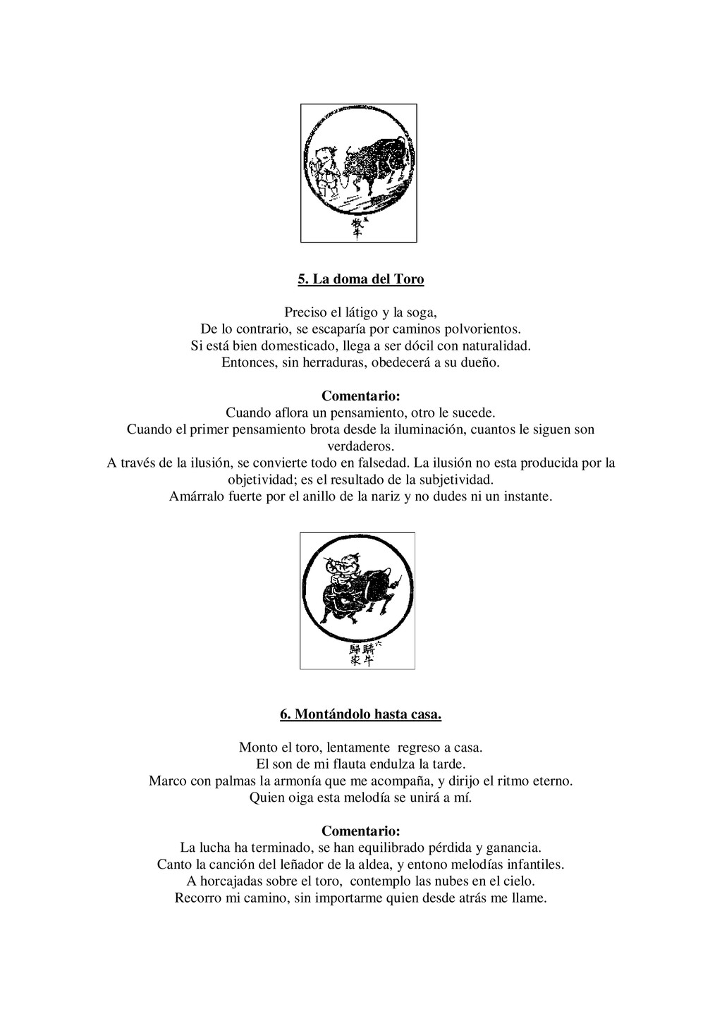soga, De lo contrario, se escaparía por caminos polvorientos. Si está bien domesticado, llega a ser dócil con naturalidad. Entonces, sin herraduras, obedecerá a su dueño. Comentario: Cuando aflora un pensamiento, otro le sucede. Cuando el primer pensamiento brota desde la iluminación, cuantos le siguen son verdaderos. A través de la ilusión, se convierte todo en falsedad. La ilusión no esta producida por la objetividad; es el resultado de la subjetividad. Amárralo fuerte por el anillo de la nariz y no dudes ni un instante. 6. Montándolo hasta casa. Monto el toro, lentamente regreso a casa. El son de mi flauta endulza la tarde. Marco con palmas la armonía que me acompaña, y dirijo el ritmo eterno. Quien oiga esta melodía se unirá a mí. Comentario: La lucha ha terminado, se han equilibrado pérdida y ganancia. Canto la canción del leñador de la aldea, y entono melodías infantiles. A horcajadas sobre el toro, contemplo las nubes en el cielo. Recorro mi camino, sin importarme quien desde atrás me llame.