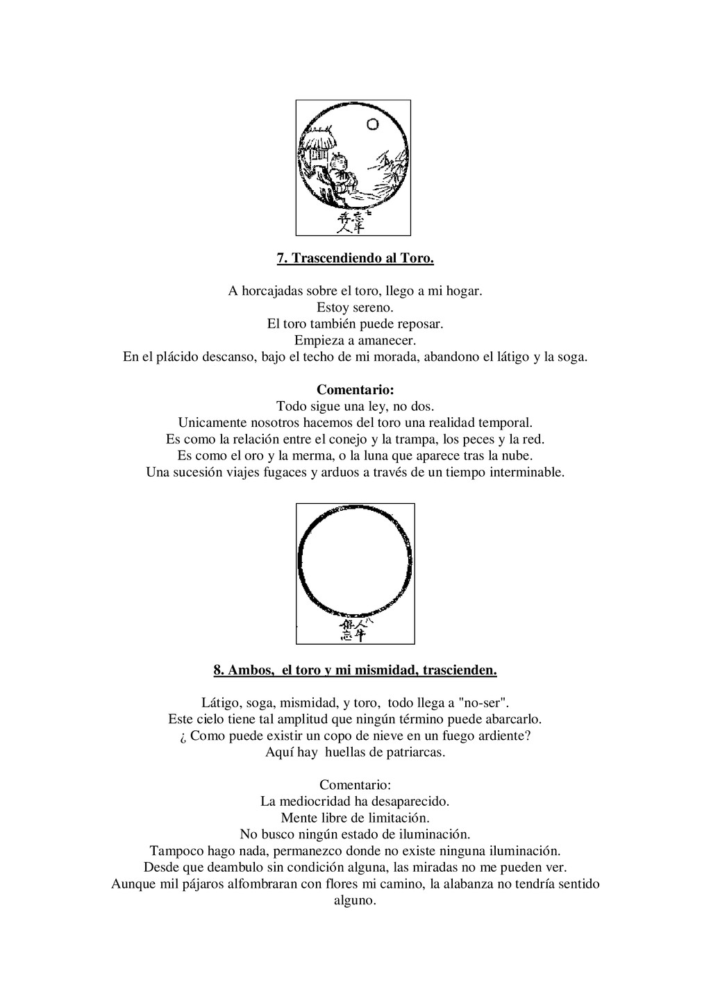 a mi hogar. Estoy sereno. El toro también puede reposar. Empieza a amanecer. En el plácido descanso, bajo el techo de mi morada, abandono el látigo y la soga. Comentario: Todo sigue una ley, no dos. Unicamente nosotros hacemos del toro una realidad temporal. Es como la relación entre el conejo y la trampa, los peces y la red. Es como el oro y la merma, o la luna que aparece tras la nube. Una sucesión viajes fugaces y arduos a través de un tiempo interminable. 8. Ambos, el toro y mi mismidad, trascienden. Látigo, soga, mismidad, y toro, todo llega a "no-ser". Este cielo tiene tal amplitud que ningún término puede abarcarlo. ¿ Como puede existir un copo de nieve en un fuego ardiente? Aquí hay huellas de patriarcas. Comentario: La mediocridad ha desaparecido. Mente libre de limitación. No busco ningún estado de iluminación. Tampoco hago nada, permanezco donde no existe ninguna iluminación. Desde que deambulo sin condición alguna, las miradas no me pueden ver. Aunque mil pájaros alfombraran con flores mi camino, la alabanza no tendría sentido alguno.