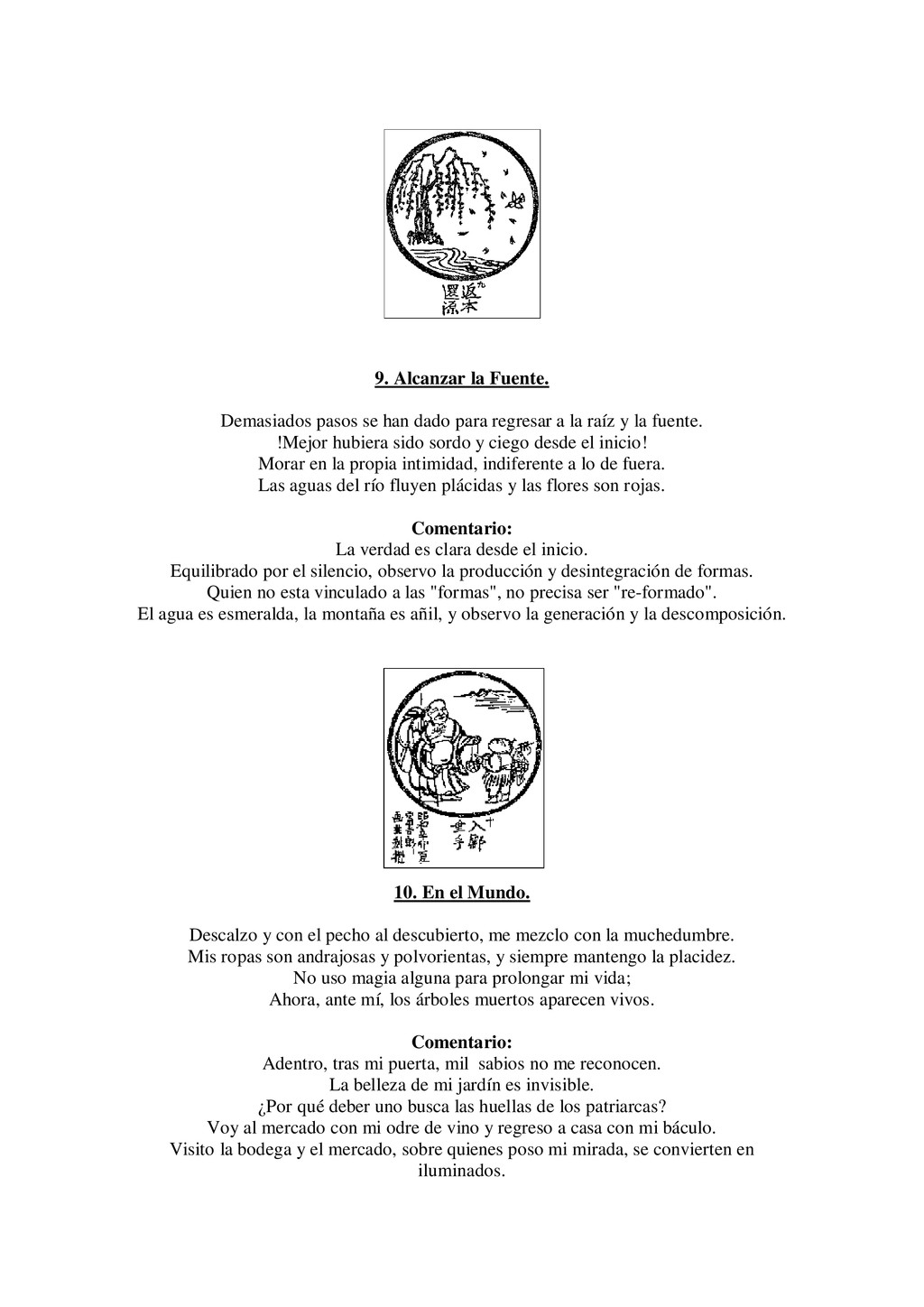 regresar a la raíz y la fuente. !Mejor hubiera sido sordo y ciego desde el inicio! Morar en la propia intimidad, indiferente a lo de fuera. Las aguas del río fluyen plácidas y las flores son rojas. Comentario: La verdad es clara desde el inicio. Equilibrado por el silencio, observo la producción y desintegración de formas. Quien no esta vinculado a las "formas", no precisa ser "re-formado". El agua es esmeralda, la montaña es añil, y observo la generación y la descomposición. 10. En el Mundo. Descalzo y con el pecho al descubierto, me mezclo con la muchedumbre. Mis ropas son andrajosas y polvorientas, y siempre mantengo la placidez. No uso magia alguna para prolongar mi vida; Ahora, ante mí, los árboles muertos aparecen vivos. Comentario: Adentro, tras mi puerta, mil sabios no me reconocen. La belleza de mi jardín es invisible. ¿Por qué deber uno busca las huellas de los patriarcas? Voy al mercado con mi odre de vino y regreso a casa con mi báculo. Visito la bodega y el mercado, sobre quienes poso mi mirada, se convierten en iluminados.