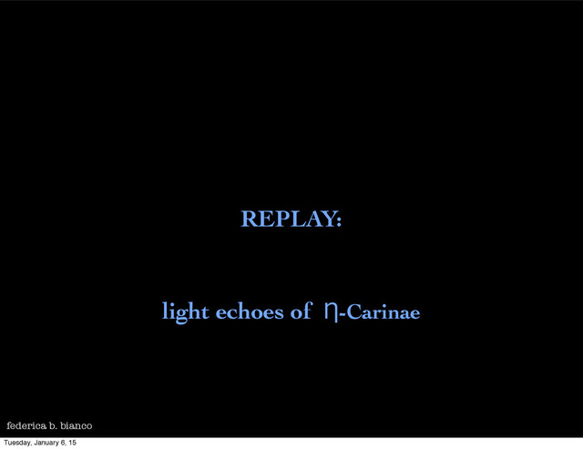 Light Echoes Great Eruption revisited future work federica b. bianco light echoes of Ƞ-Carinae you are here light echoes of Ƞ-Carinae only 2.3 kpc away... introduction Great Eruption Light Echoes Great Eruption revisited future work Tuesday, January 6, 15