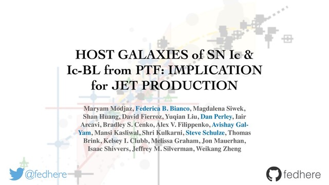 for JET PRODUCTION Maryam Modjaz, Federica B. Bianco, Magdalena Siwek, Shan Huang, David Fierroz, Yuqian Liu, Dan Perley, Iair Arcavi, Bradley S. Cenko, Alex V. Filippenko, Avishay Gal- Yam, Mansi Kasliwal, Shri Kulkarni, Steve Schulze, Thomas Brink, Kelsey I. Clubb, Melissa Graham, Jon Mauerhan, Isaac Shivvers, Jeffrey M. Silverman, Weikang Zheng @fedhere fedhere