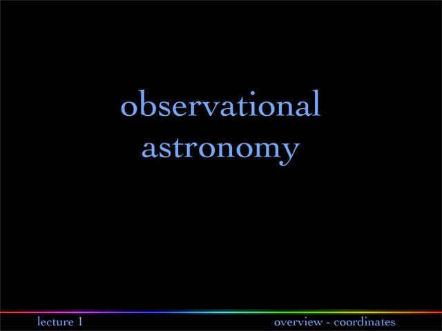 in the sky daily and seasonally due to the motion of the Earth 2. Although we live in a 3D universe for convenience we define position of celestial objects as if they were on a sphere with the earth at the center. 3. Some basic trigonometric concepts are needed to understand “spherical astronomy” 4. We use several coordinate systems, some tied to the celestial body, some tied to the observer 6. The earth spin axis and orbit of the earth around the sun are used to define these coordinates 8. The 3 main coordinate system are RA/Dec, Alt/Az, and HA/Az