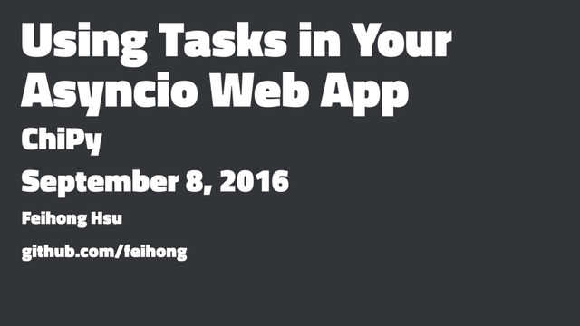 In this talk, I cover how to implement different types of tasks in an asyncio-based web application, including how to start them, stop them, and send incremental data to a web frontend using websockets. I will also spend a little time reviewing asyncio concepts.
