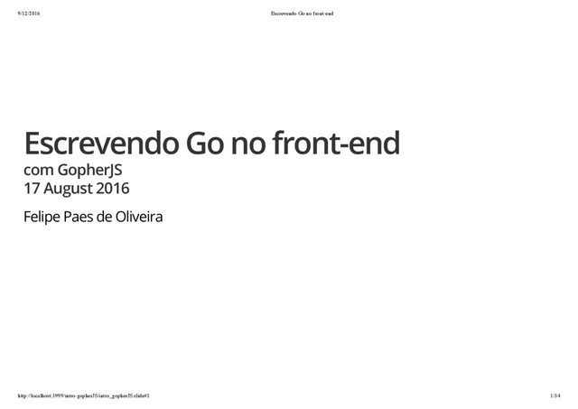 GopherJS? Oportunidade de escrever código Go para rodar em todos os navegadores Familiaridade com ferramentas (gofmt, godoc, ...) Familiaridade com tipos (int, bytes, ...) Checagem de tipos Familiaridade com concorrência, blocking receiving ao invés de callbacks Familiaridade com erros de compilação (refatoração) Uso de bibliotecas de terceiros (Go e JavaScript)