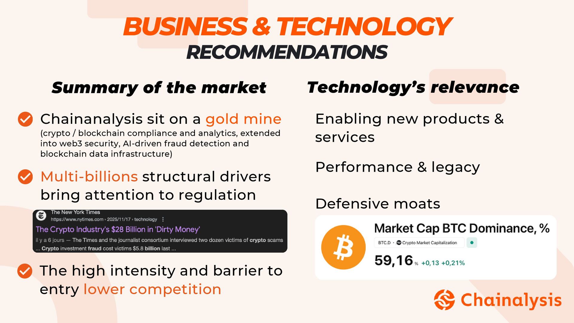 and analytics, extended into web3 security, AI-driven fraud detection and blockchain data infrastructure) Multi-billions structural drivers bring attention to regulation The high intensity and barrier to entry lower competition Summary of the market Technology’s relevance Enabling new products & services Performance & legacy Defensive moats BUSINESS & TECHNOLOGY RECOMMENDATIONS