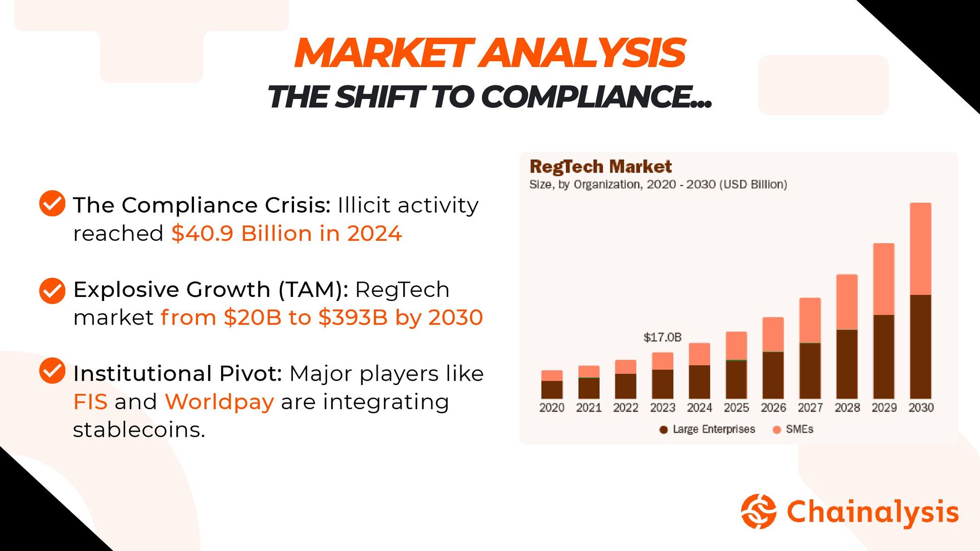 activity reached $40.9 Billion in 2024 Explosive Growth (TAM): RegTech market from $20B to $393B by 2030 Institutional Pivot: Major players like FIS and Worldpay are integrating stablecoins.