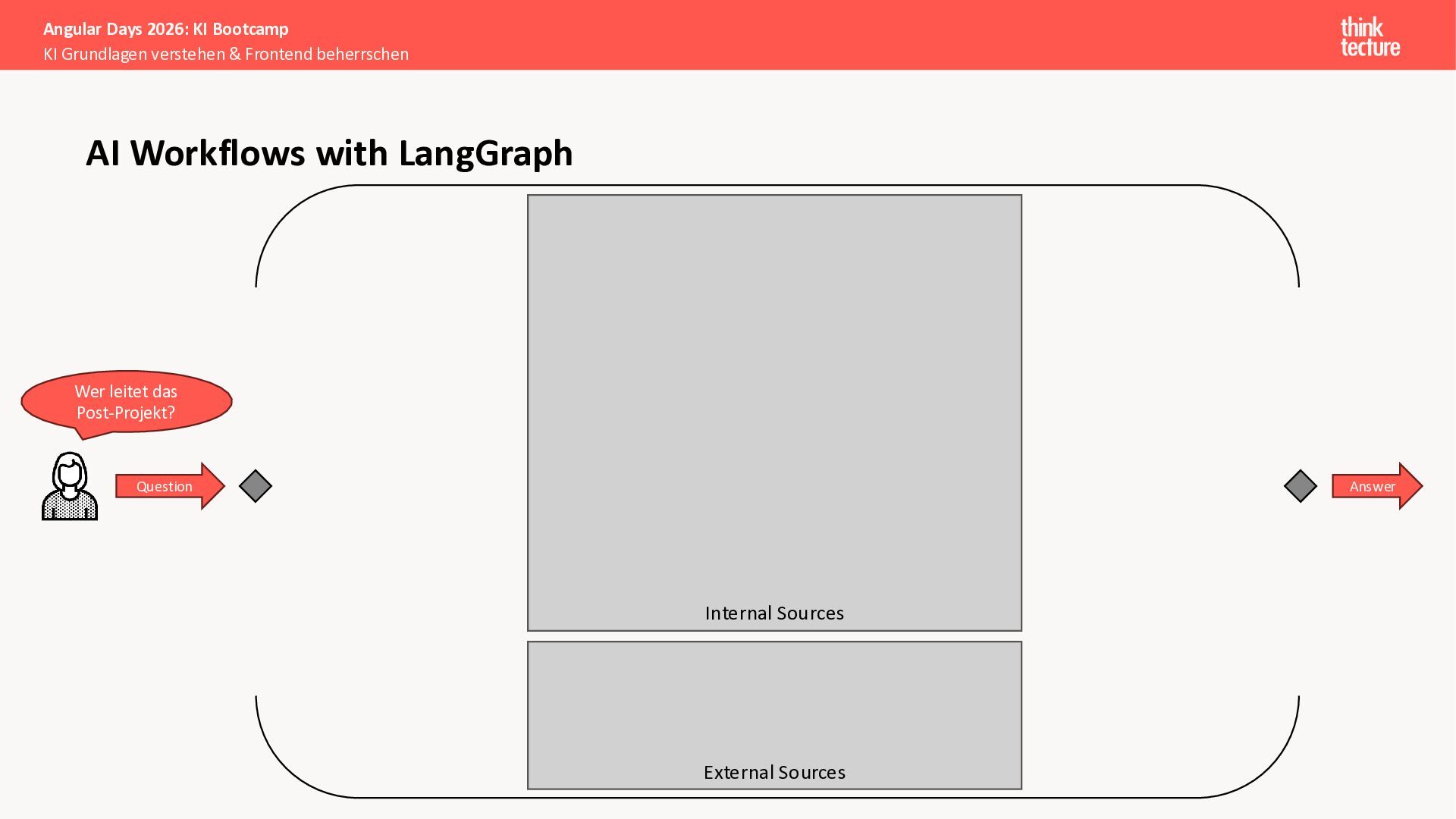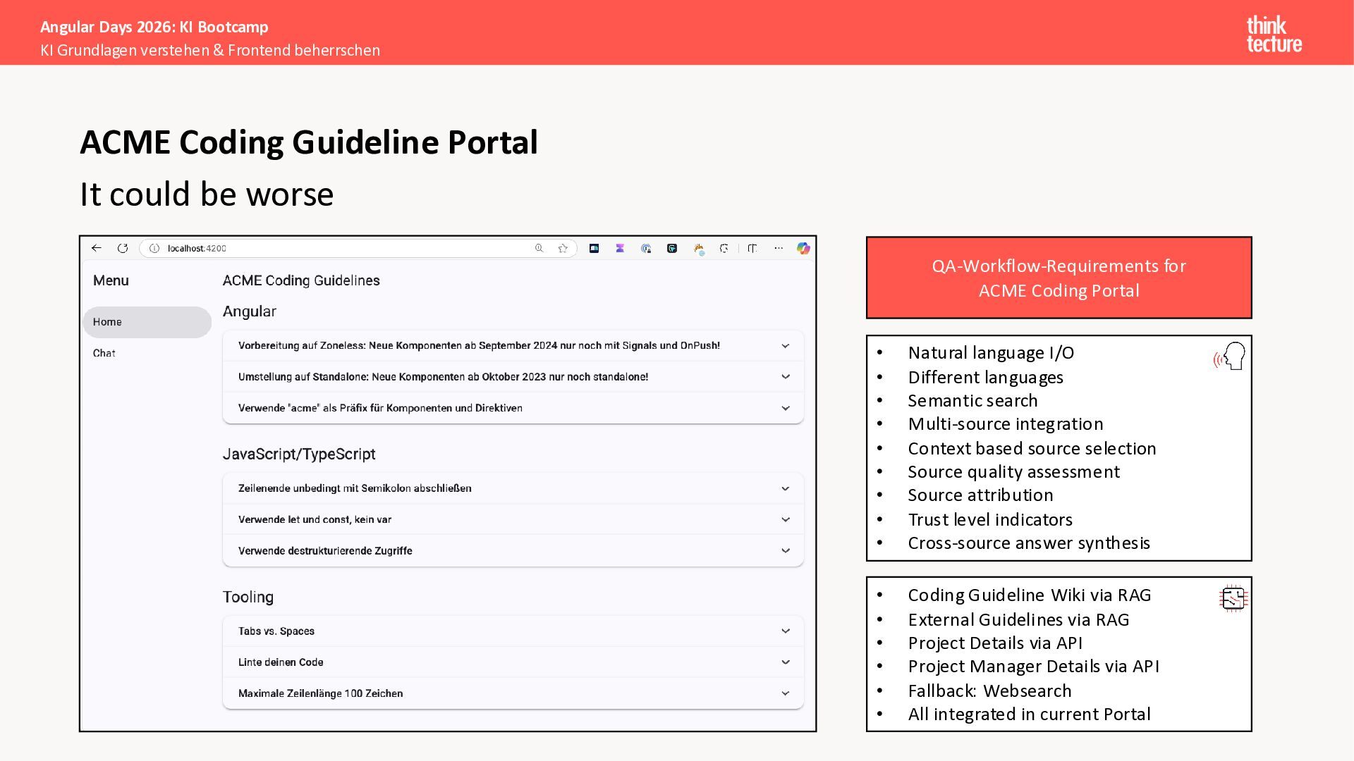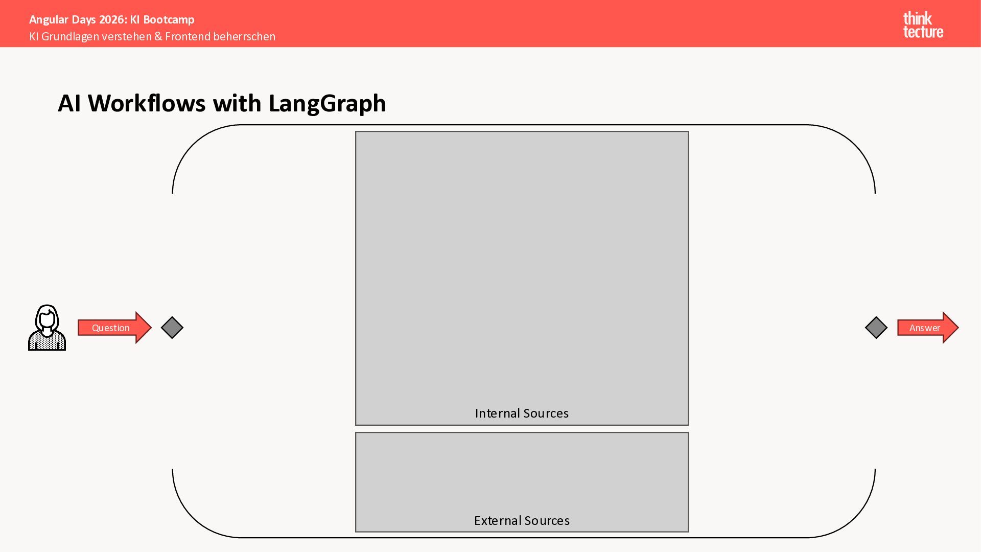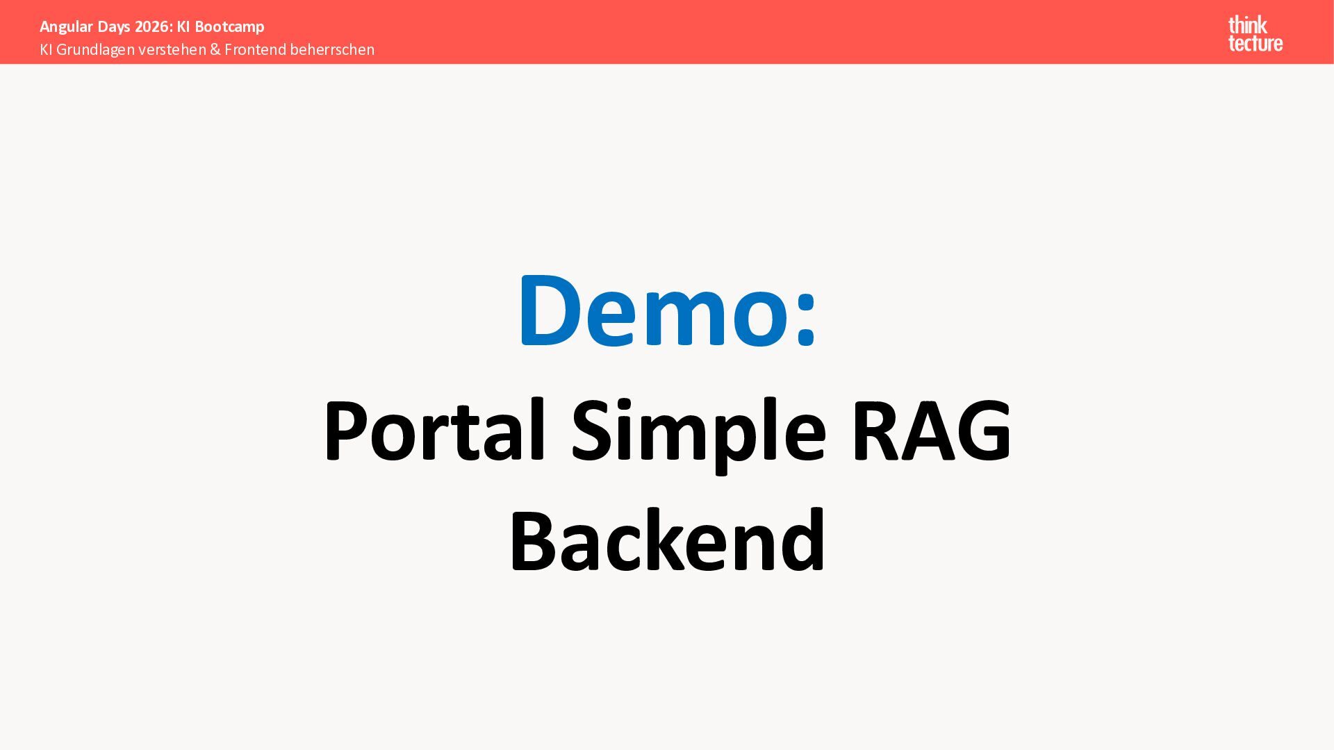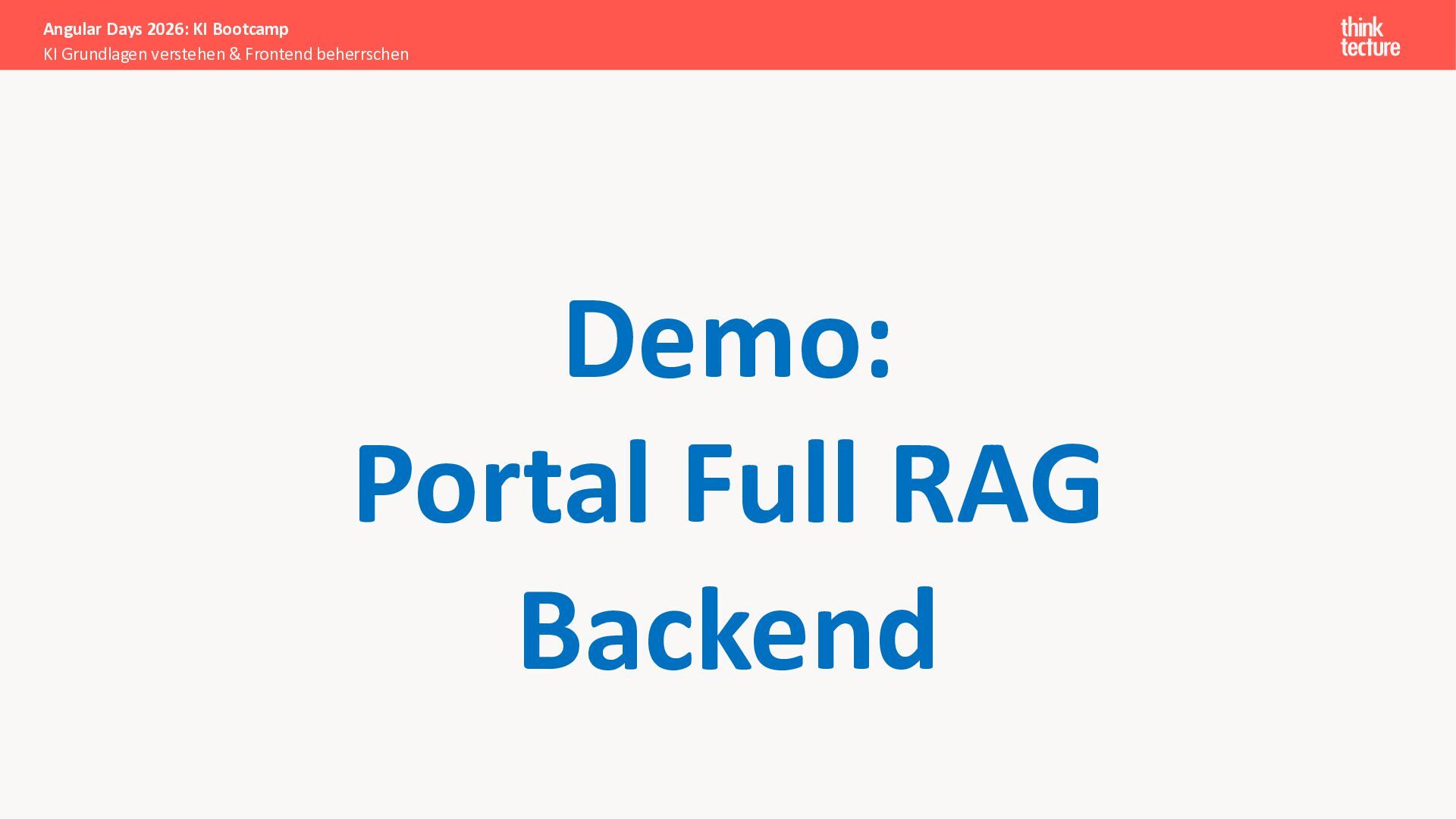 Alle Konzepte demonstrieren wir anhand eines vollständigen Enterprise-Szenarios: Ein Developer-Portal, das statische Guidelines durch AI-generierte, kontextbezogene Empfehlungen ergänzt. Das Backend verknüpft dabei Unternehmenswissen aus verschiedenen Quellen intelligent – von Wikis über Vektordatenbanken und MCP-Server bis hin zu externen Recherchen. Sie erweitern eine bestehende Angular-App um Obsidian-Integration als Wissensspeicher und lernen, wie die Zusammenarbeit zwischen AI-Backend-Teams und Frontend-Entwicklern optimal funktioniert.