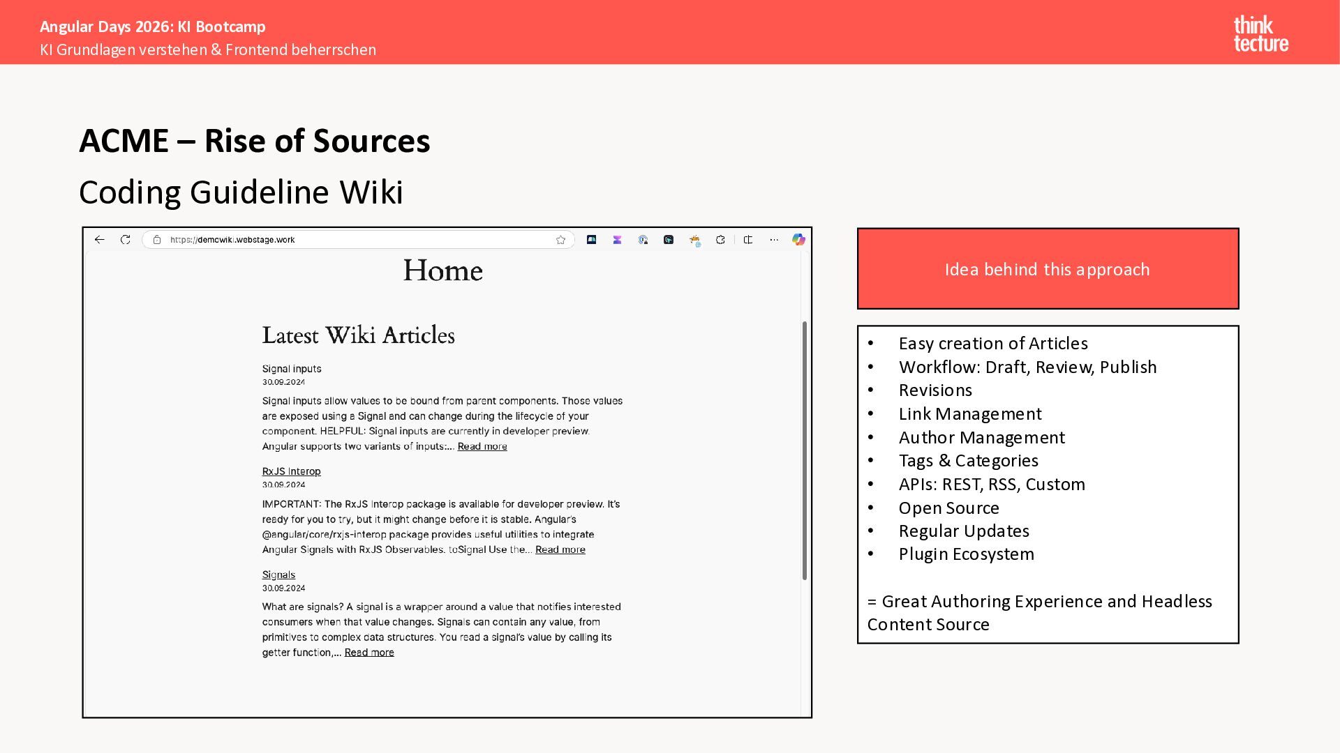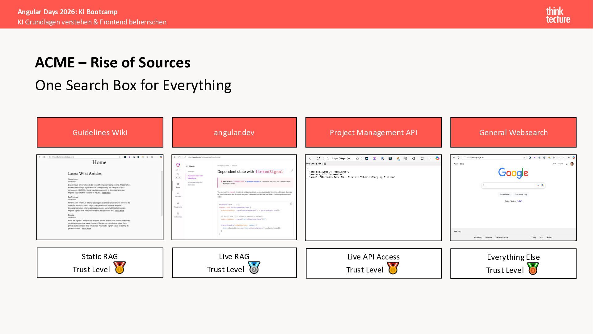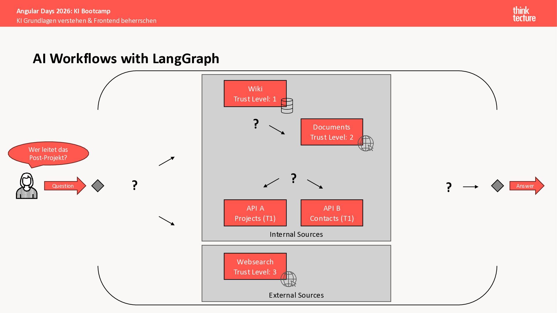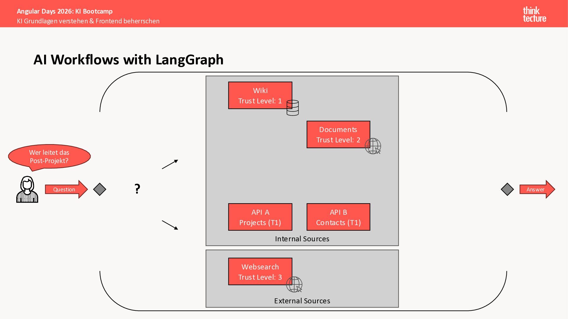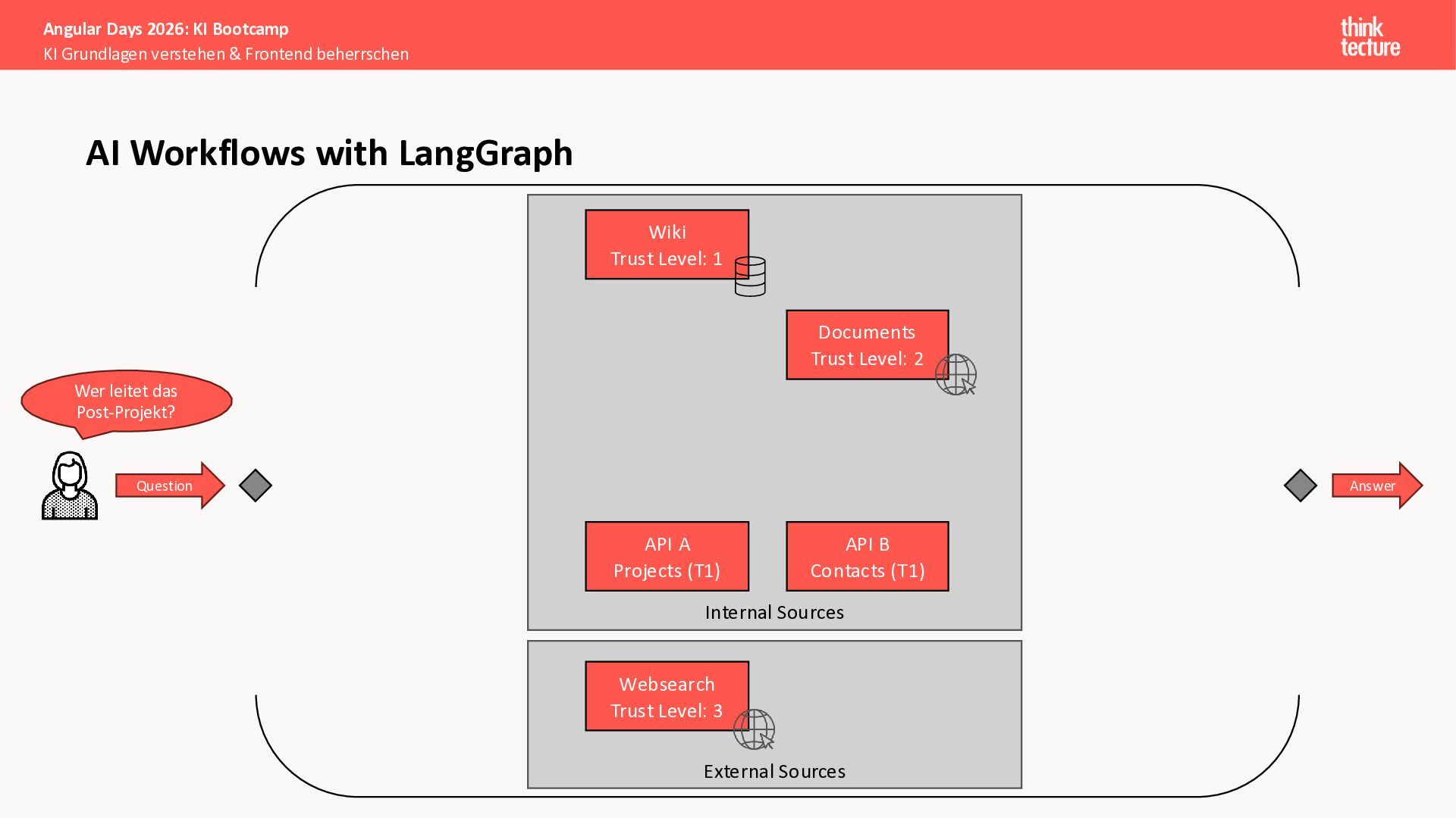 Alle Konzepte demonstrieren wir anhand eines vollständigen Enterprise-Szenarios: Ein Developer-Portal, das statische Guidelines durch AI-generierte, kontextbezogene Empfehlungen ergänzt. Das Backend verknüpft dabei Unternehmenswissen aus verschiedenen Quellen intelligent – von Wikis über Vektordatenbanken und MCP-Server bis hin zu externen Recherchen. Sie erweitern eine bestehende Angular-App um Obsidian-Integration als Wissensspeicher und lernen, wie die Zusammenarbeit zwischen AI-Backend-Teams und Frontend-Entwicklern optimal funktioniert.