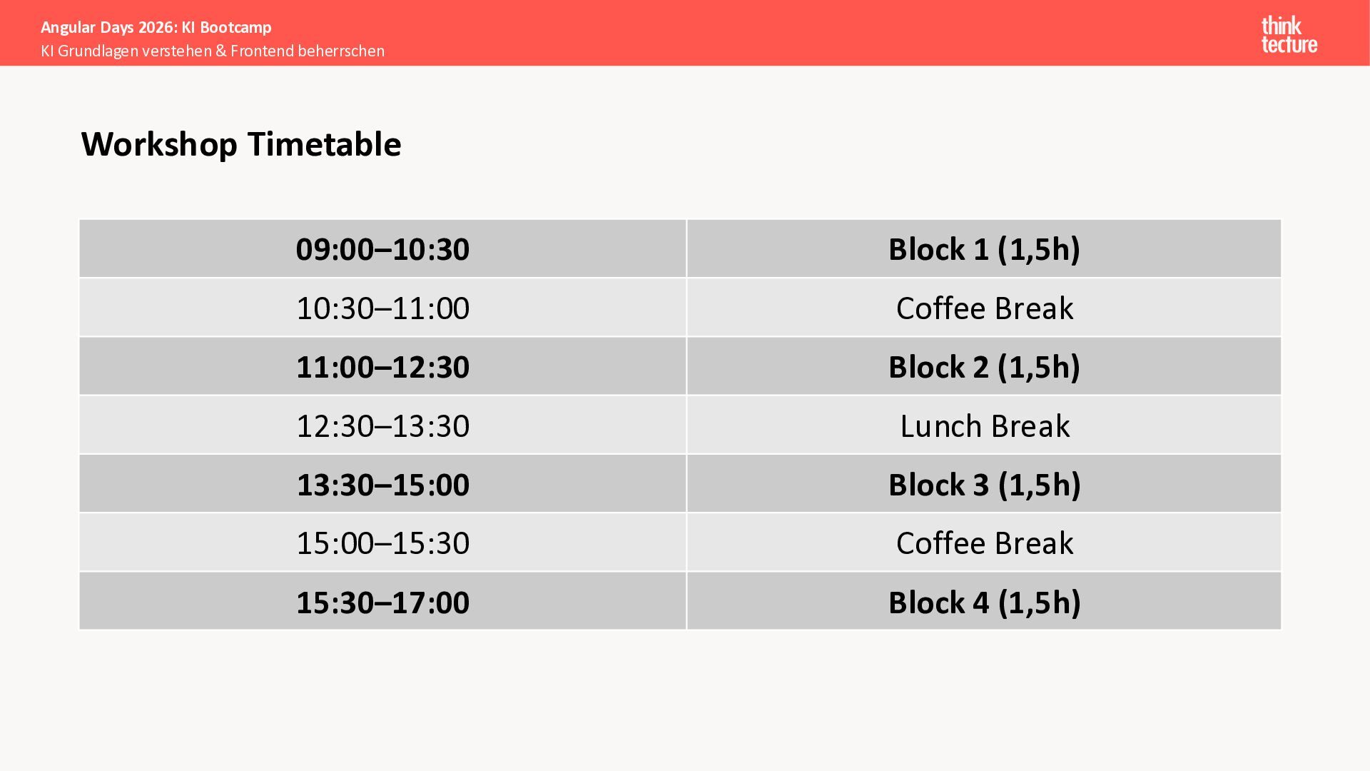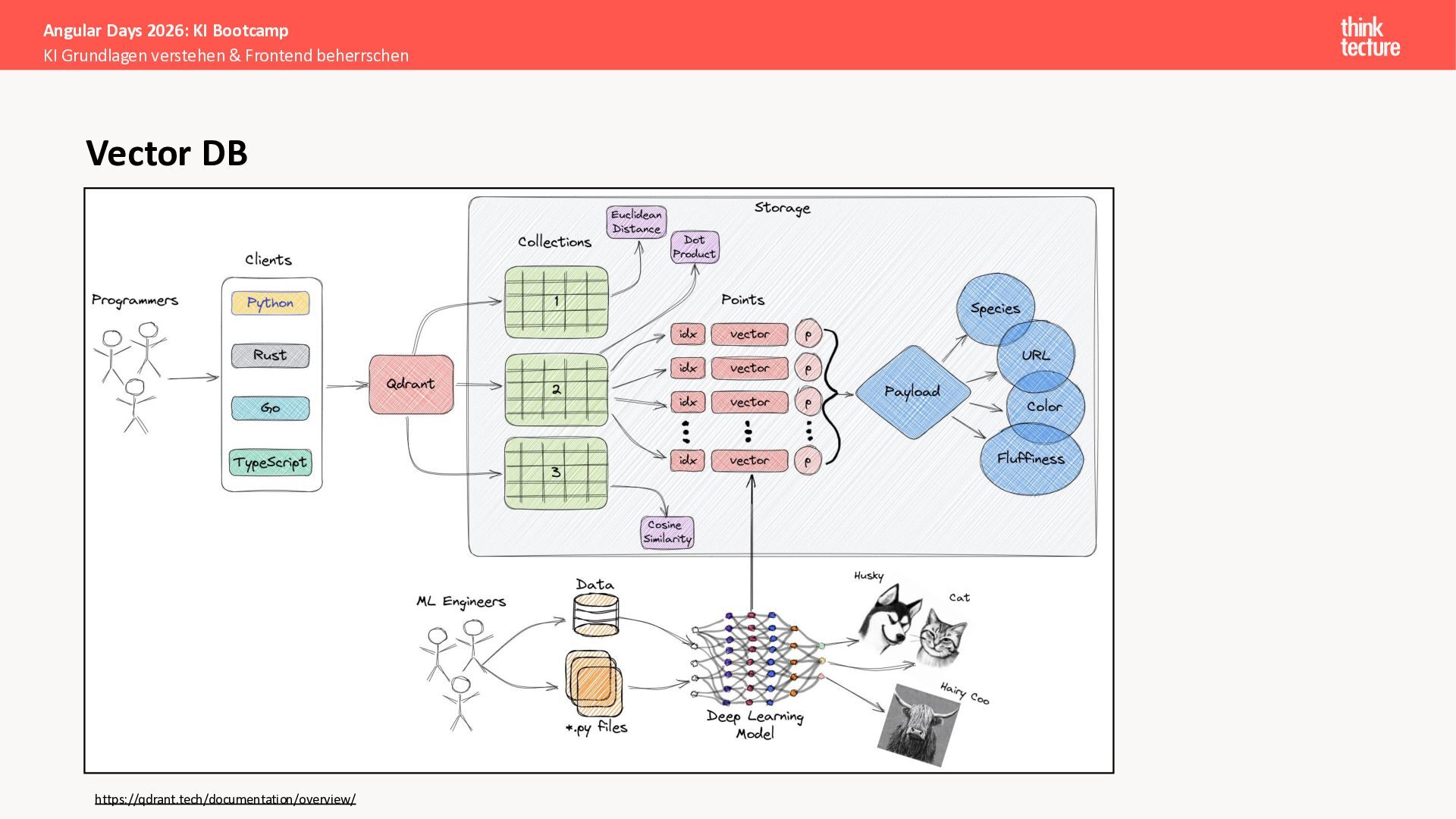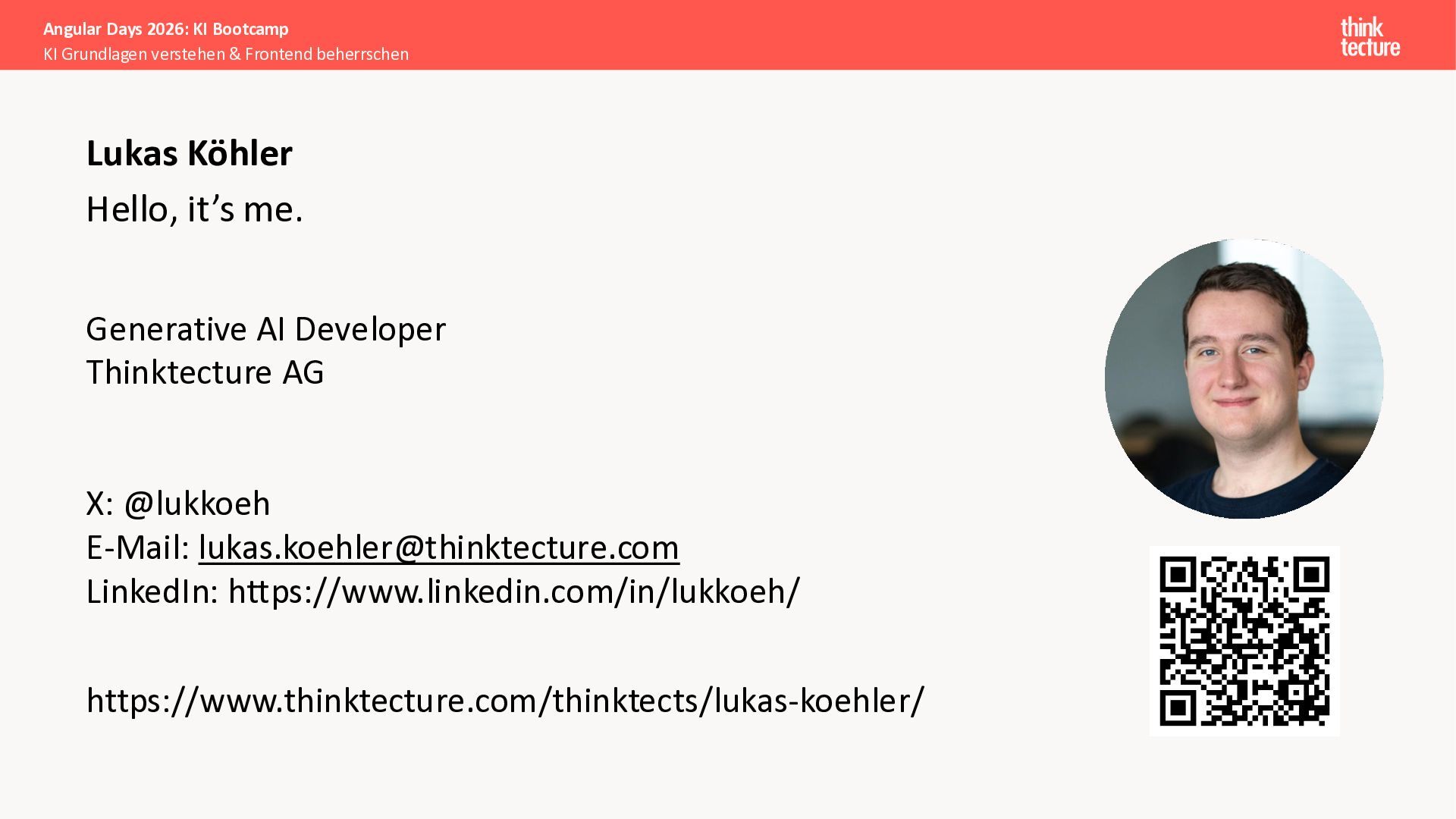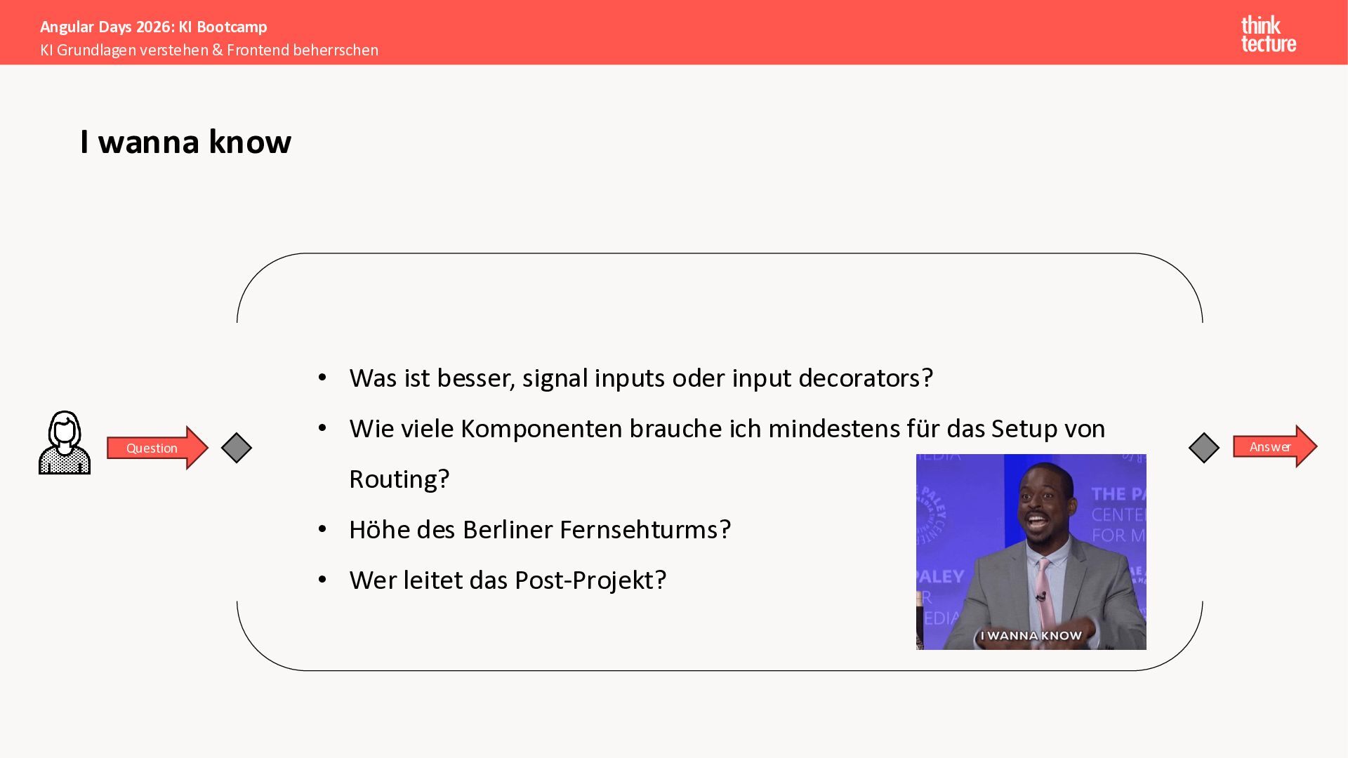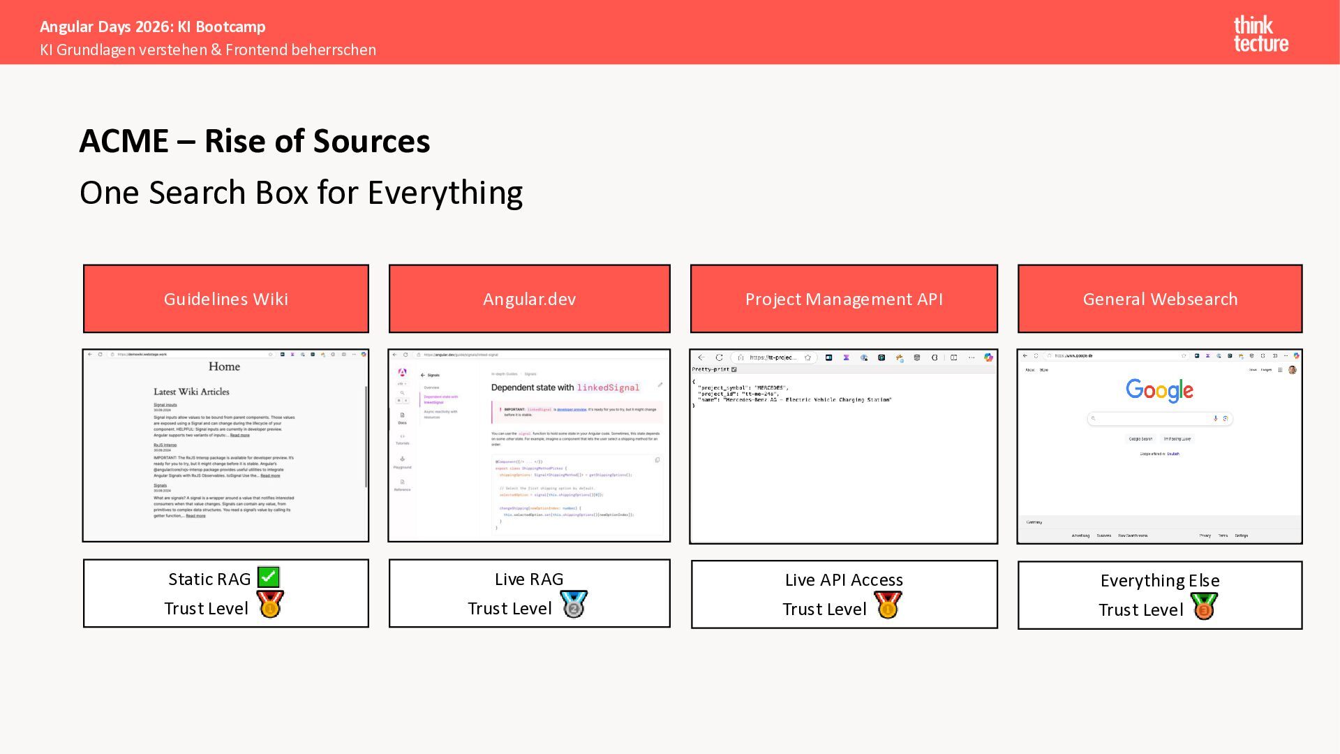 Alle Konzepte demonstrieren wir anhand eines vollständigen Enterprise-Szenarios: Ein Developer-Portal, das statische Guidelines durch AI-generierte, kontextbezogene Empfehlungen ergänzt. Das Backend verknüpft dabei Unternehmenswissen aus verschiedenen Quellen intelligent – von Wikis über Vektordatenbanken und MCP-Server bis hin zu externen Recherchen. Sie erweitern eine bestehende Angular-App um Obsidian-Integration als Wissensspeicher und lernen, wie die Zusammenarbeit zwischen AI-Backend-Teams und Frontend-Entwicklern optimal funktioniert.