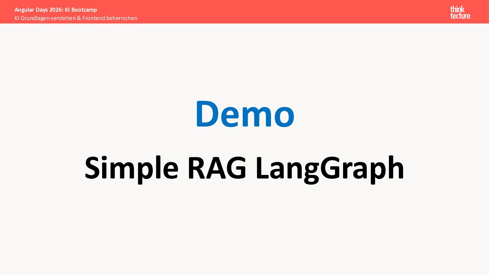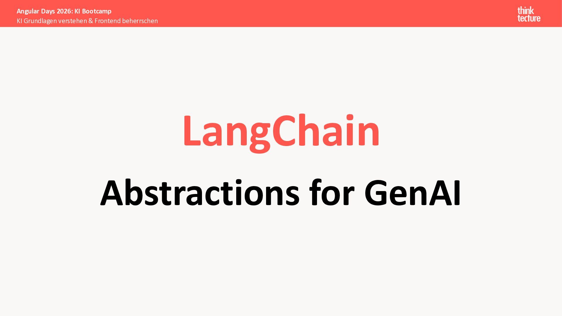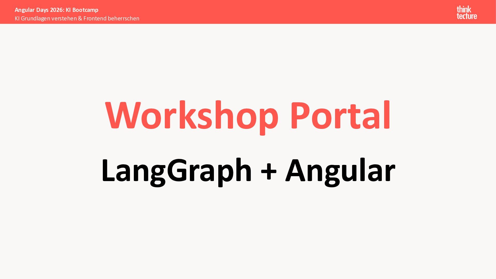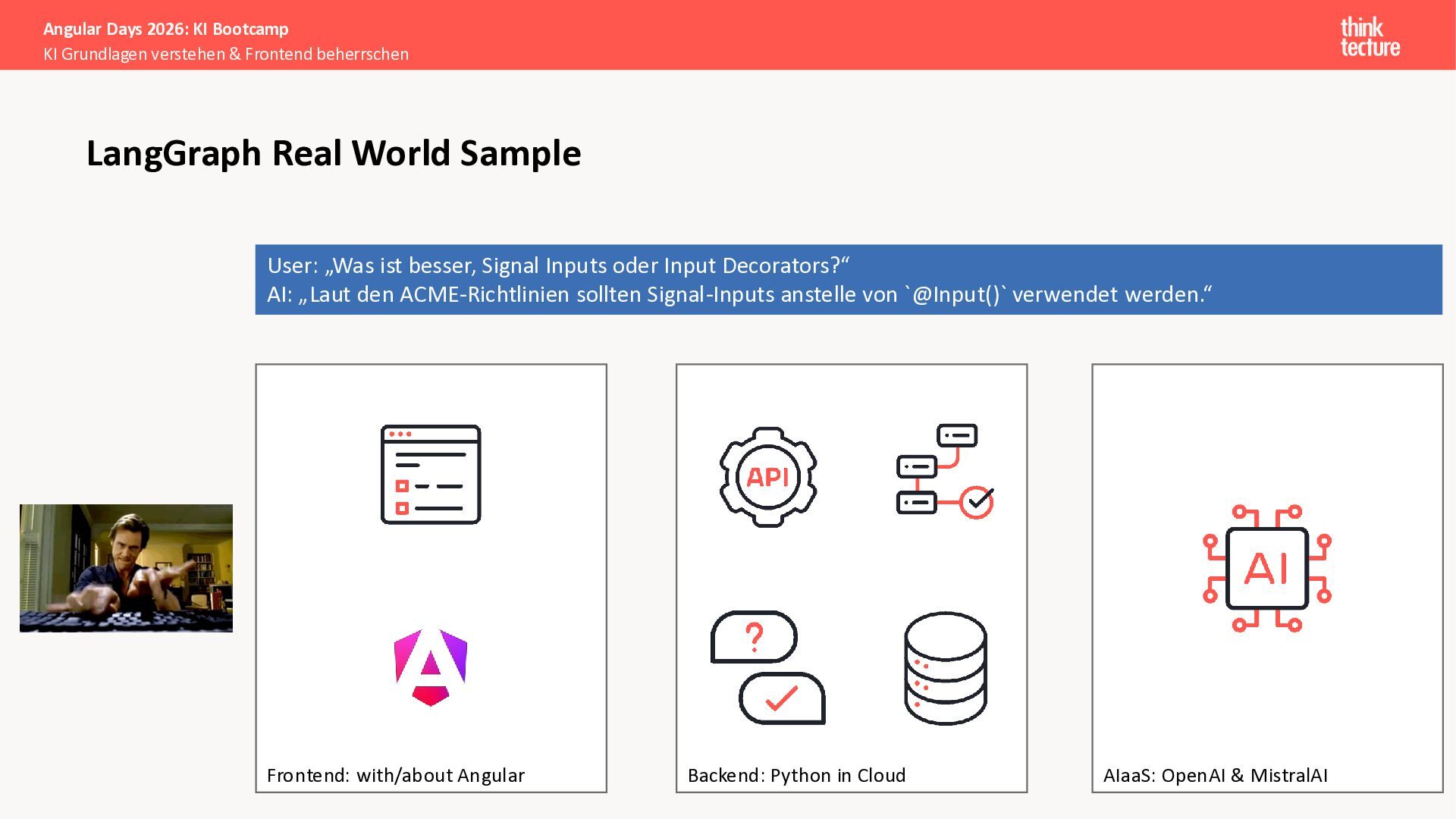 Wir vermitteln zunächst das notwendige Generative AI-Wissen für die Schwerpunkte von AI-Backendentwicklern, um mitreden zu können: Prompts, Chats, Reasoning, RAG, Agenten und AI-Workflows. Einfache PoC-Implementierungen erfolgen dabei mit Python und den Frameworks LangChain/LangGraph, um State-of-the-Art AI-Funktionalität als REST-APIs bereitzustellen – der perfekte Anknüpfungspunkt für Angular-Entwickler:innen.