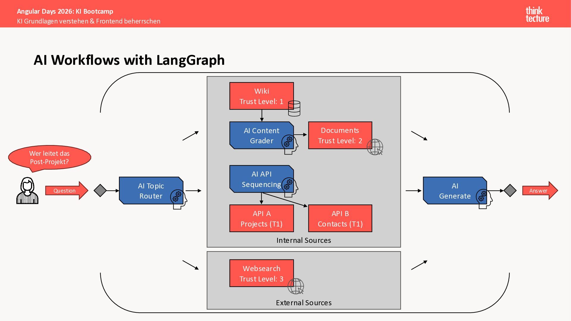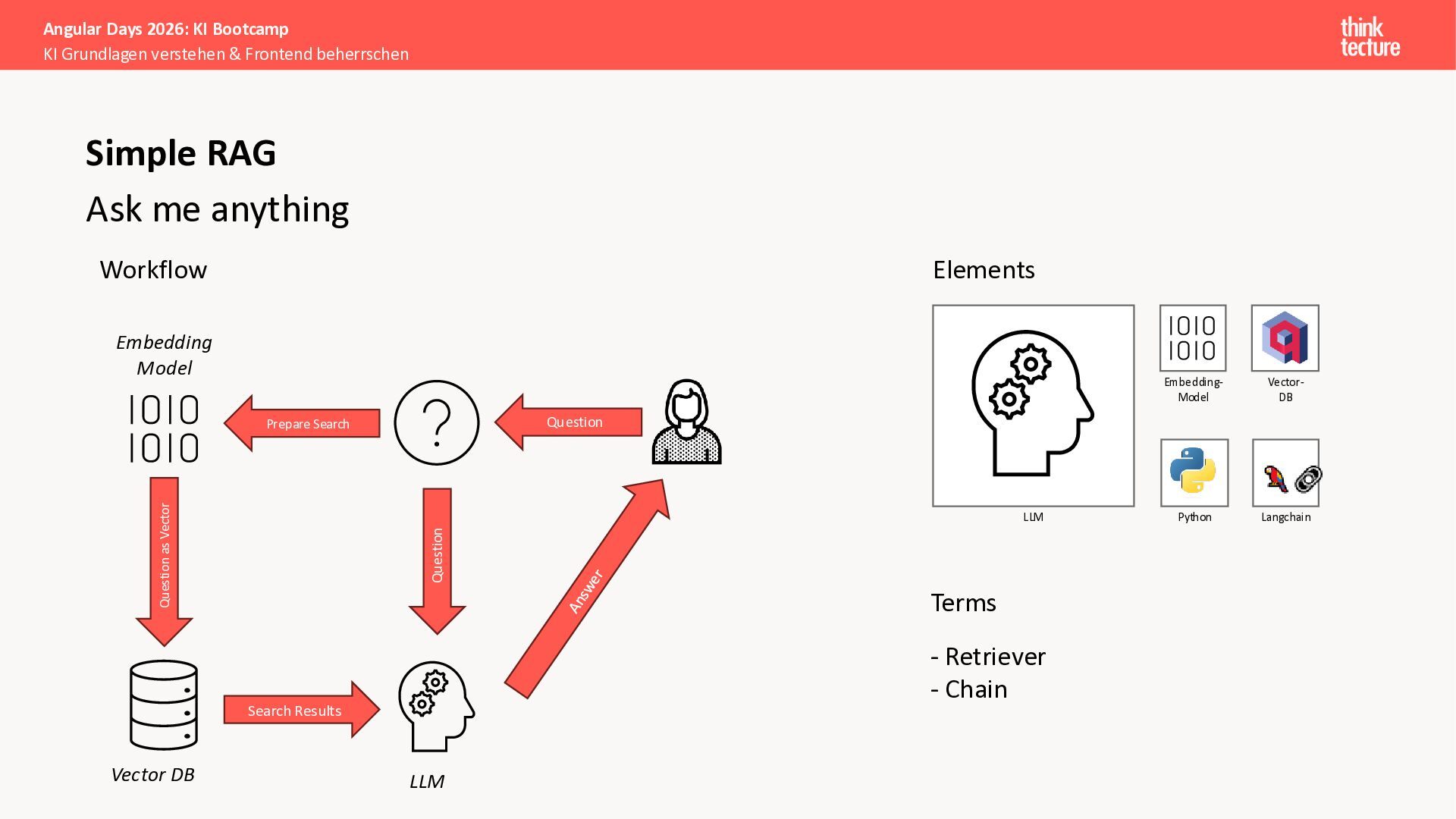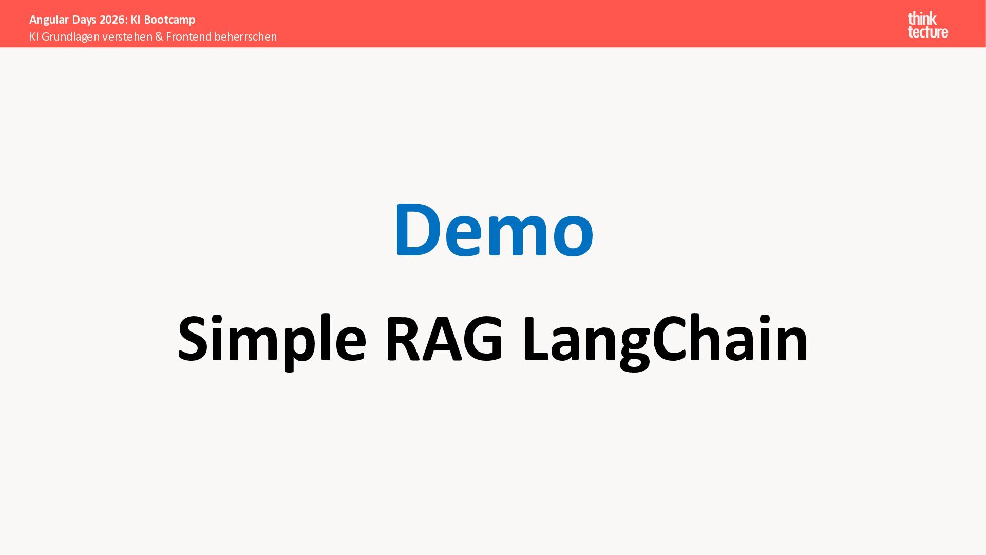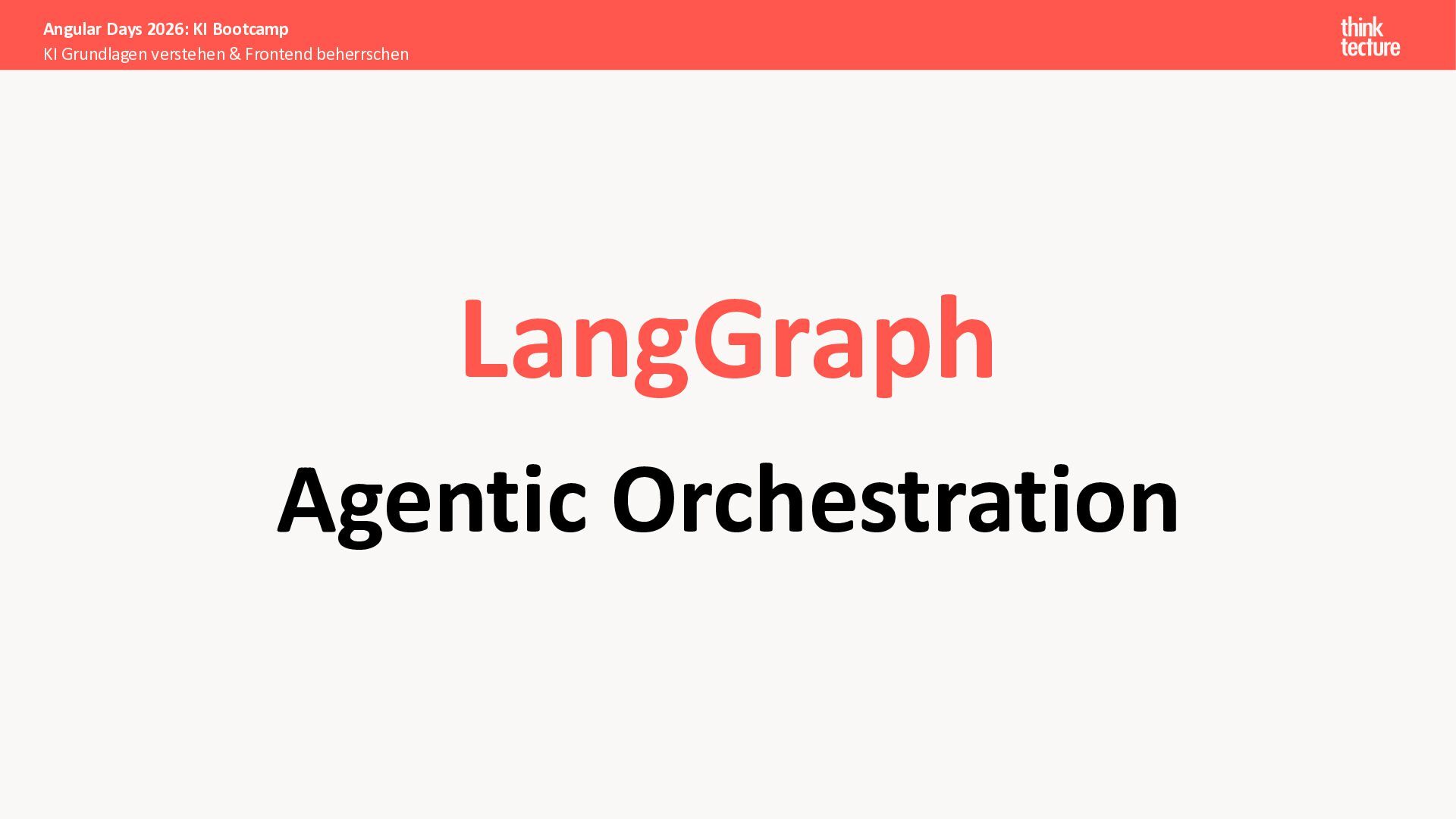 Wir vermitteln zunächst das notwendige Generative AI-Wissen für die Schwerpunkte von AI-Backendentwicklern, um mitreden zu können: Prompts, Chats, Reasoning, RAG, Agenten und AI-Workflows. Einfache PoC-Implementierungen erfolgen dabei mit Python und den Frameworks LangChain/LangGraph, um State-of-the-Art AI-Funktionalität als REST-APIs bereitzustellen – der perfekte Anknüpfungspunkt für Angular-Entwickler:innen.