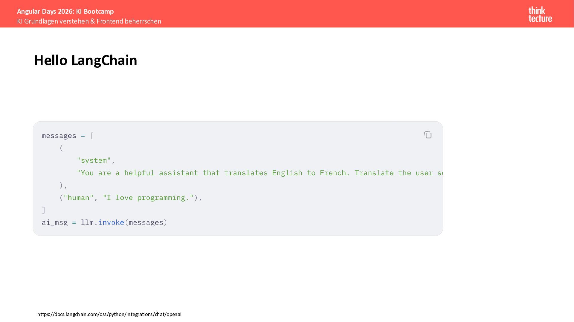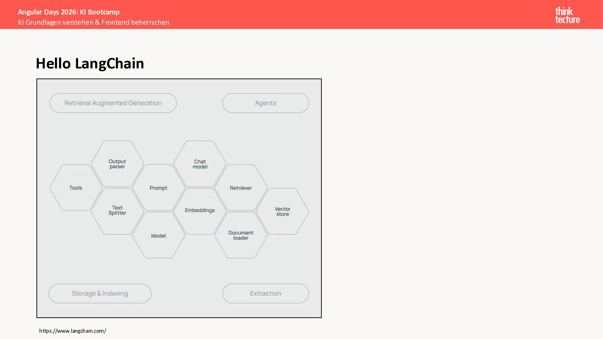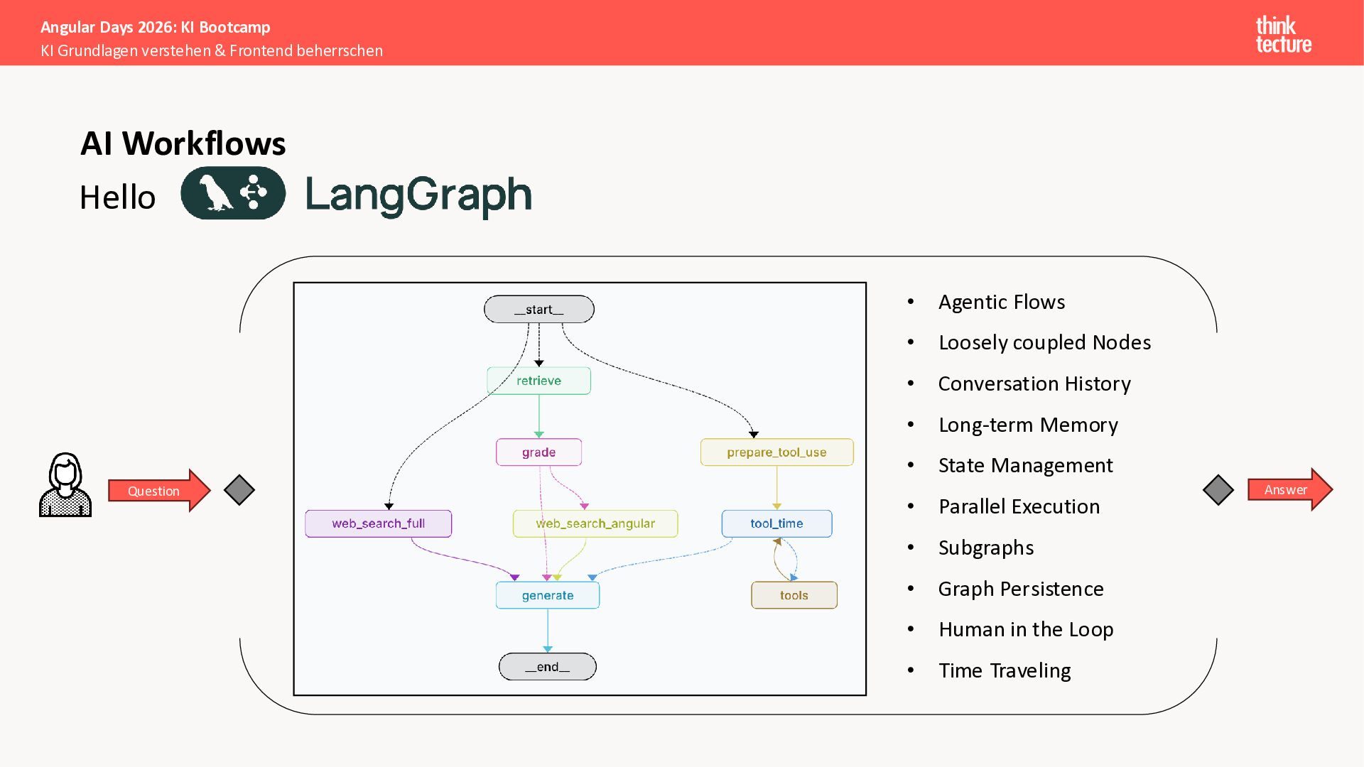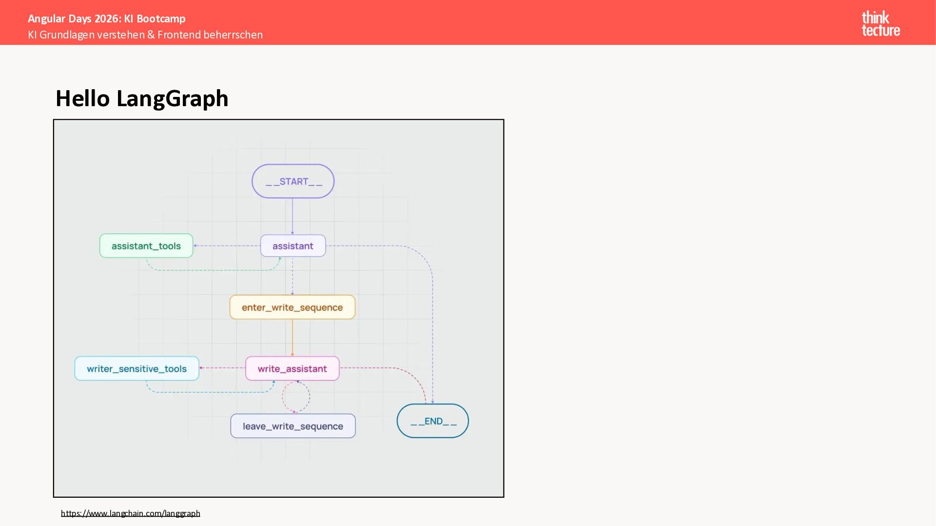 Wir vermitteln zunächst das notwendige Generative AI-Wissen für die Schwerpunkte von AI-Backendentwicklern, um mitreden zu können: Prompts, Chats, Reasoning, RAG, Agenten und AI-Workflows. Einfache PoC-Implementierungen erfolgen dabei mit Python und den Frameworks LangChain/LangGraph, um State-of-the-Art AI-Funktionalität als REST-APIs bereitzustellen – der perfekte Anknüpfungspunkt für Angular-Entwickler:innen.
