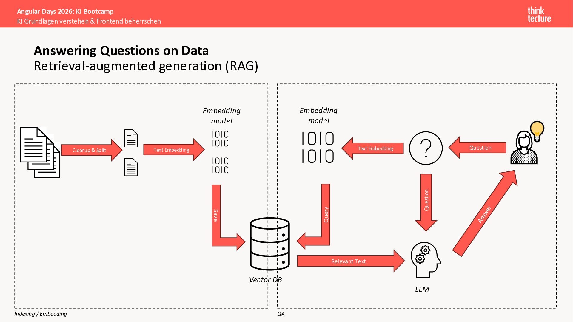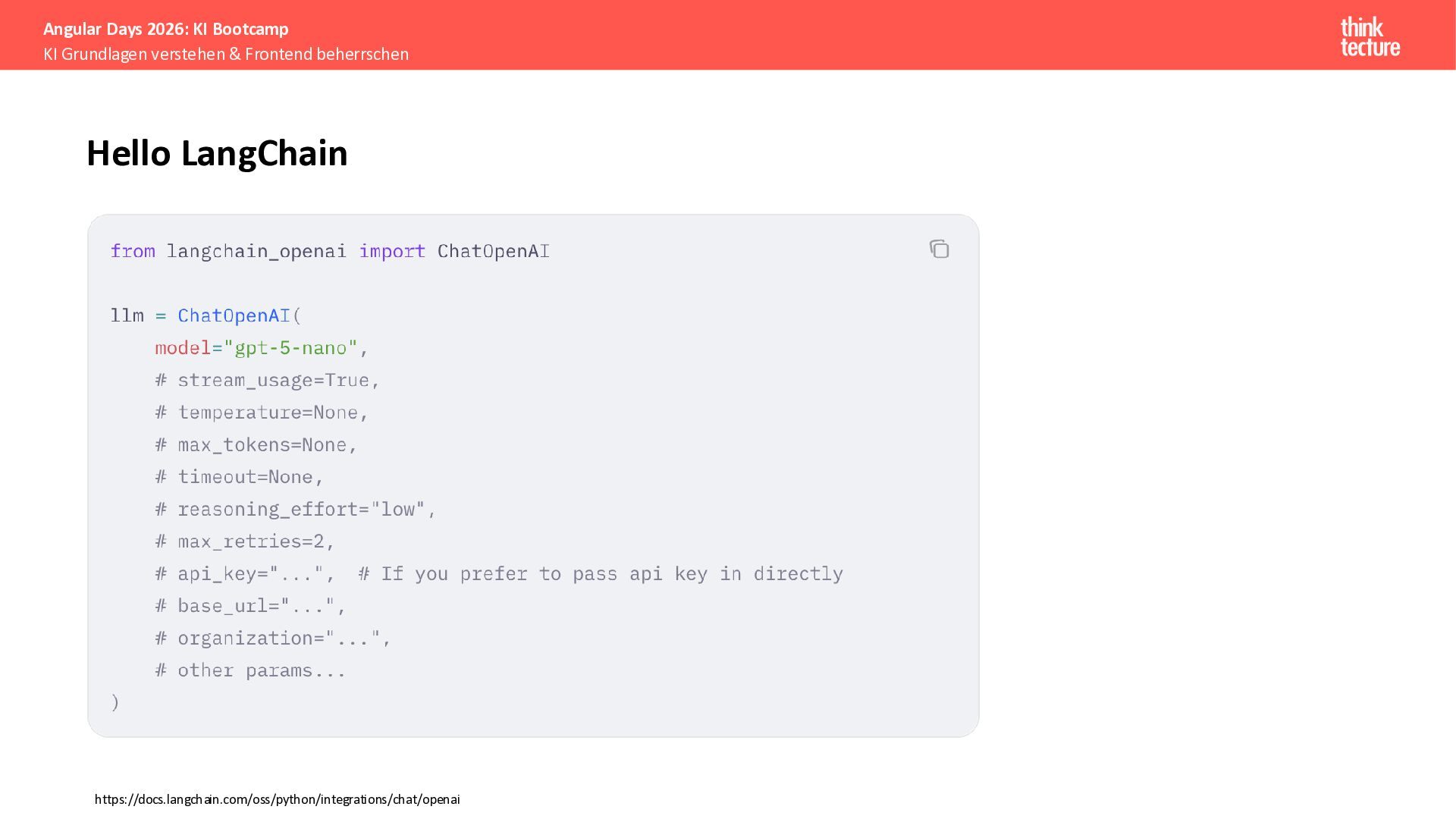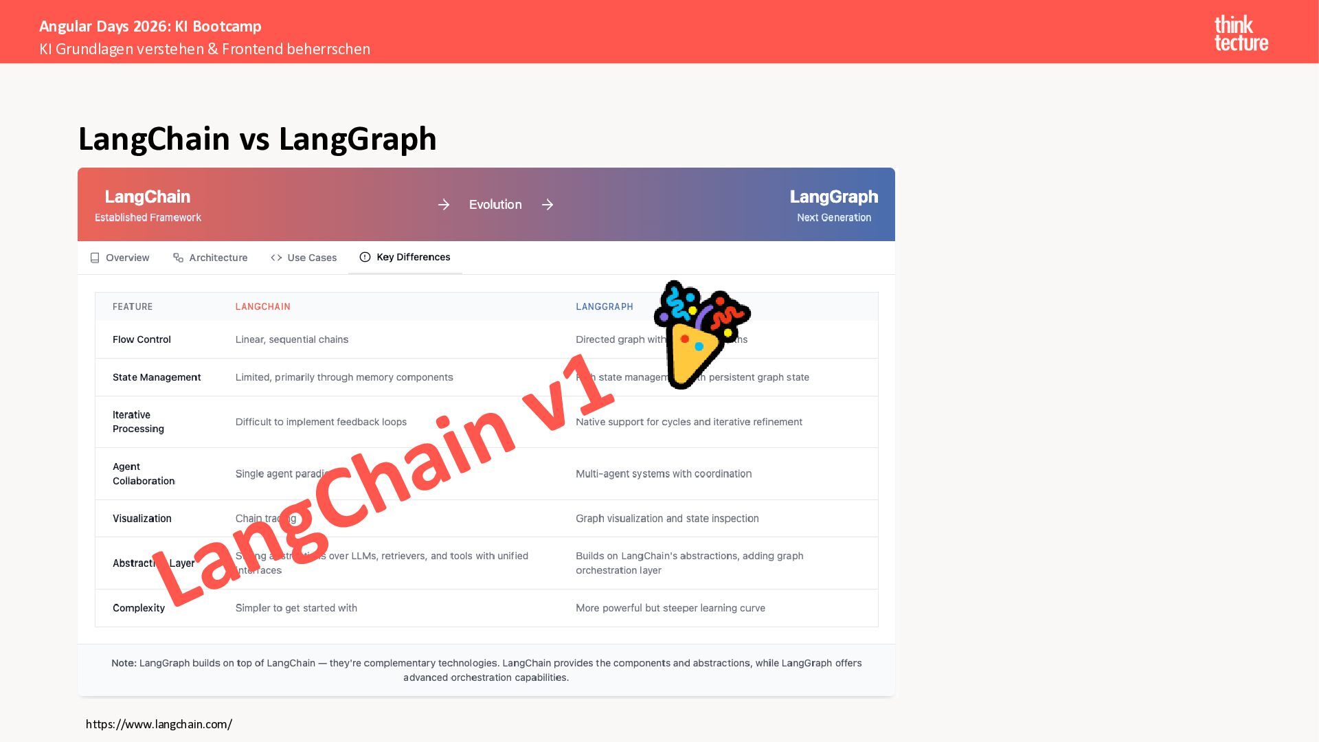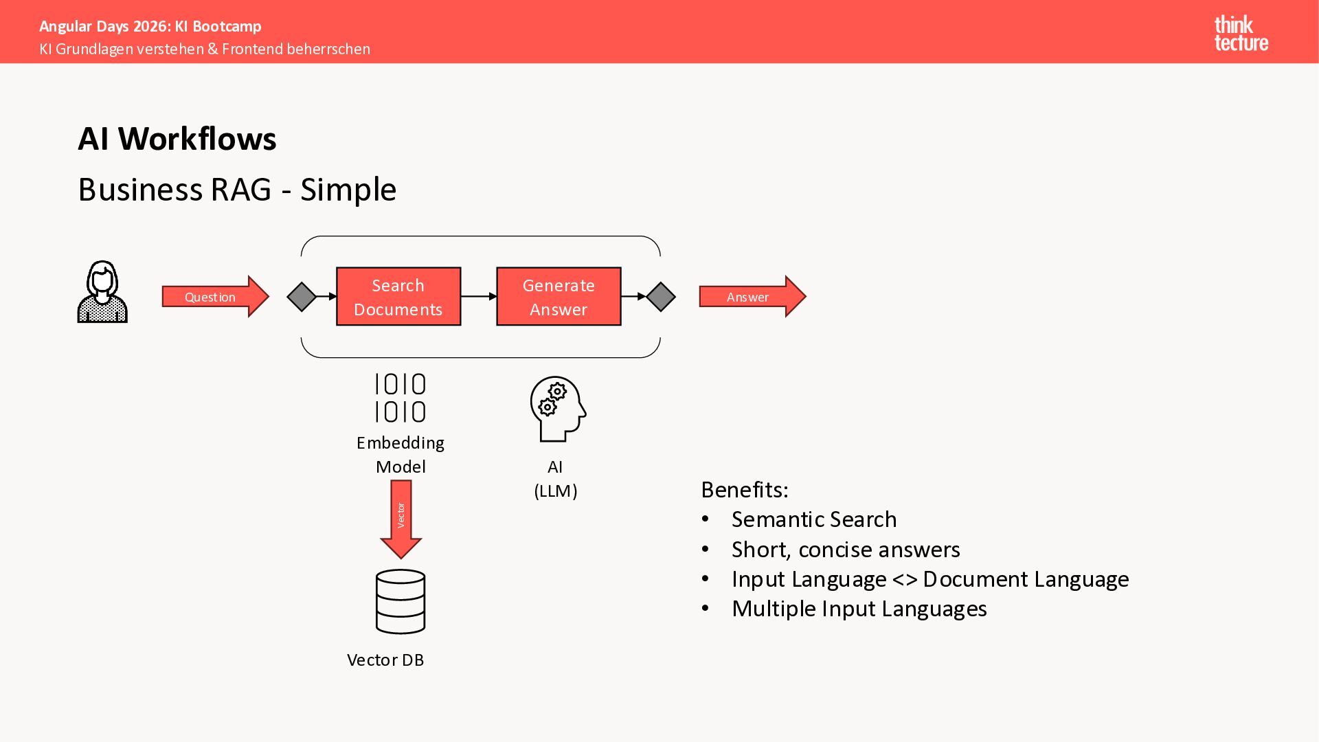 Wir vermitteln zunächst das notwendige Generative AI-Wissen für die Schwerpunkte von AI-Backendentwicklern, um mitreden zu können: Prompts, Chats, Reasoning, RAG, Agenten und AI-Workflows. Einfache PoC-Implementierungen erfolgen dabei mit Python und den Frameworks LangChain/LangGraph, um State-of-the-Art AI-Funktionalität als REST-APIs bereitzustellen – der perfekte Anknüpfungspunkt für Angular-Entwickler:innen.
