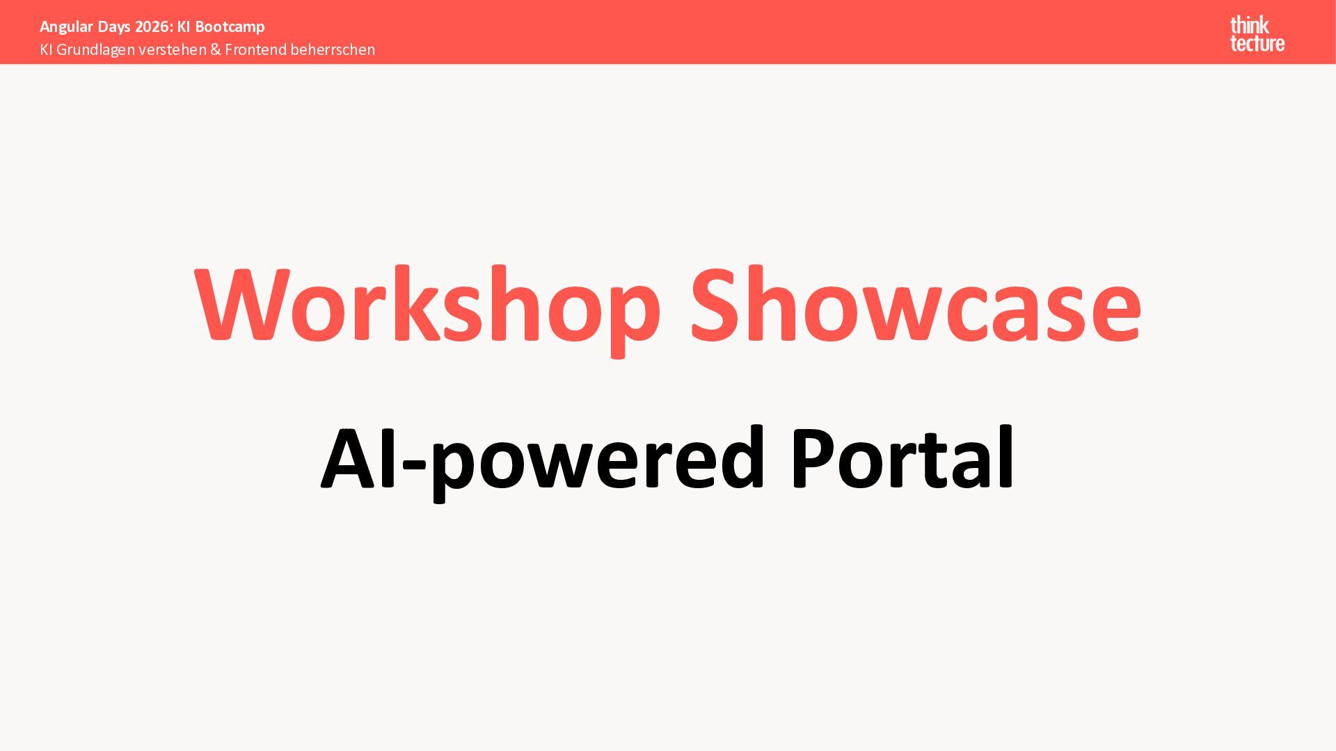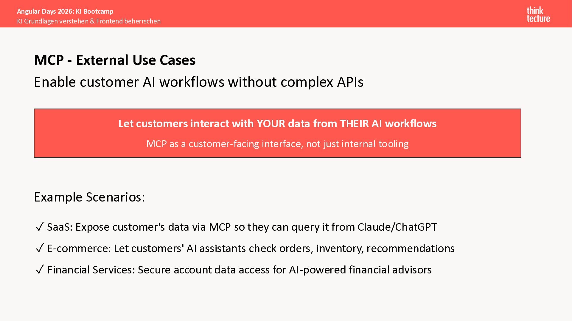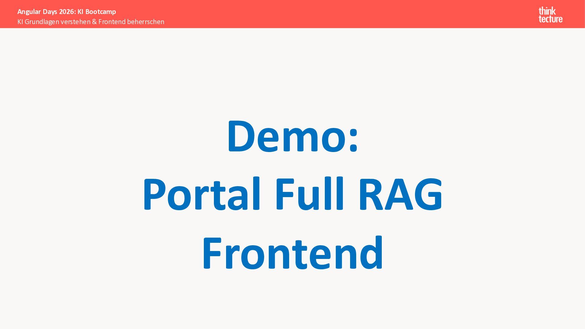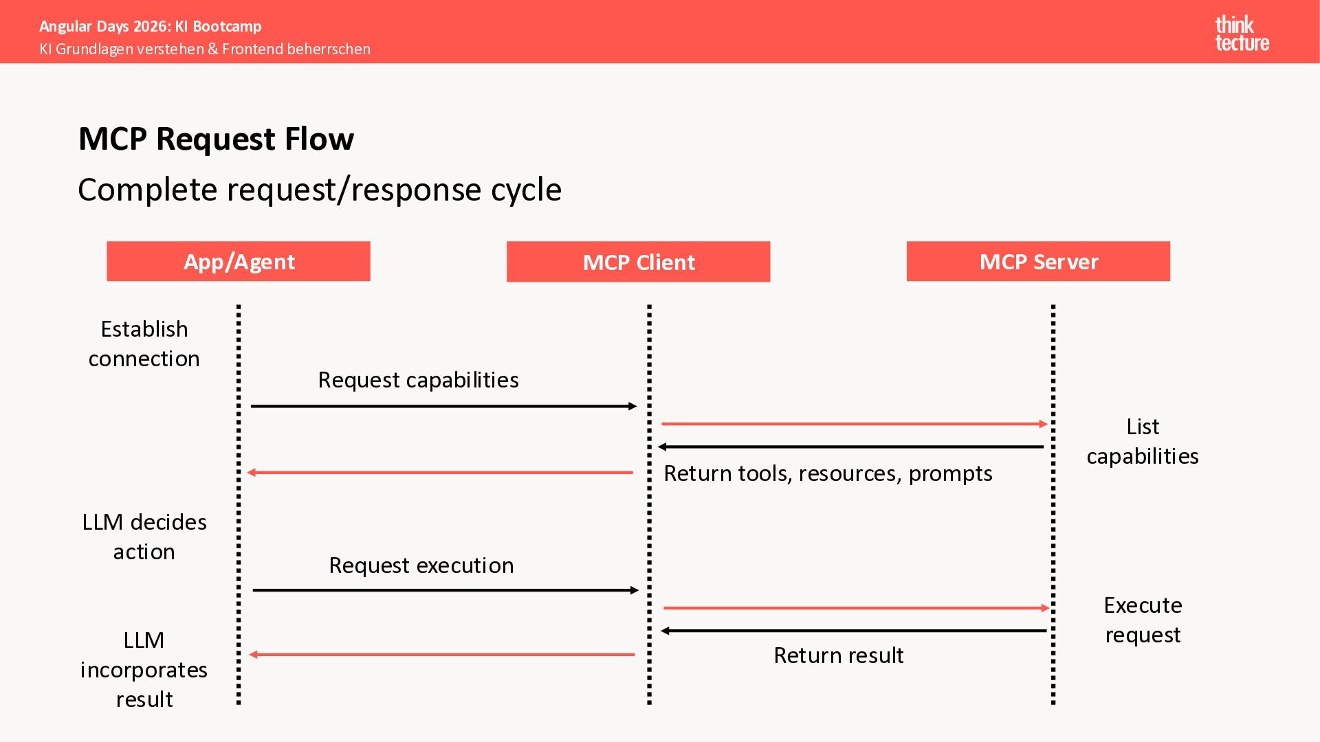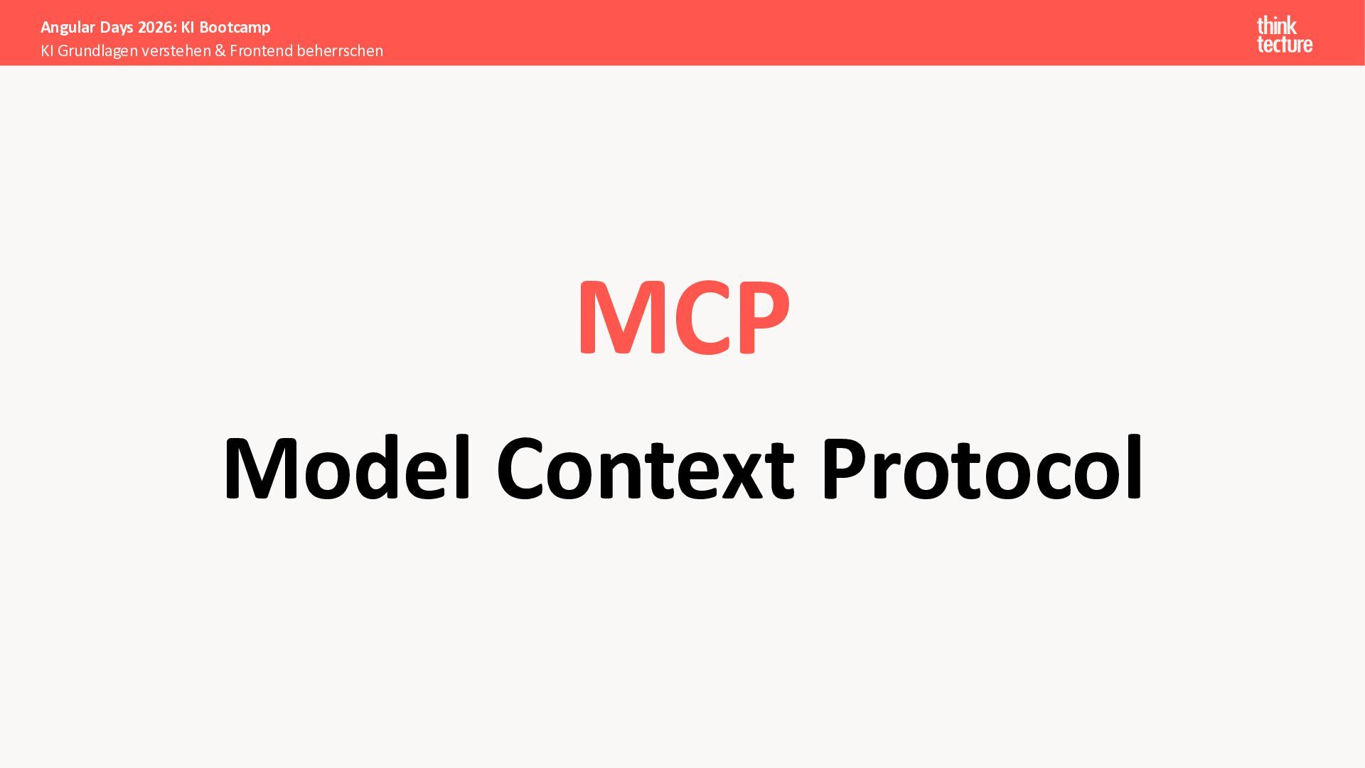 Der Fokus liegt auf modernen Frontend-Herausforderungen: optimaler API-Konsum, Streaming-Implementation für Echtzeit-Antworten, Darstellung von Reasoning-Prozessen bei Thinking-Modellen und die Erweiterung von Anwendungen um TypeScript-basierte MCP Server, die dem AI-Backend Zugriff auf Unternehmensdaten ermöglichen.