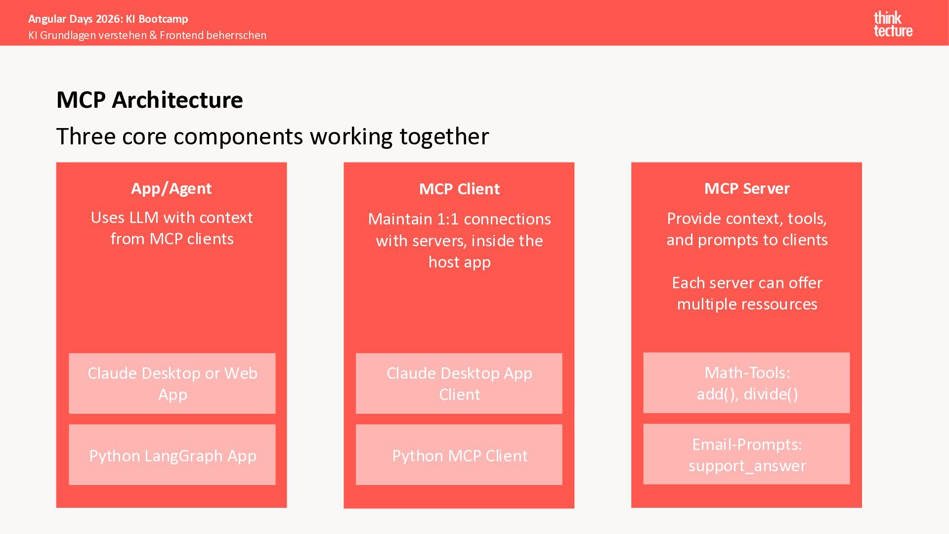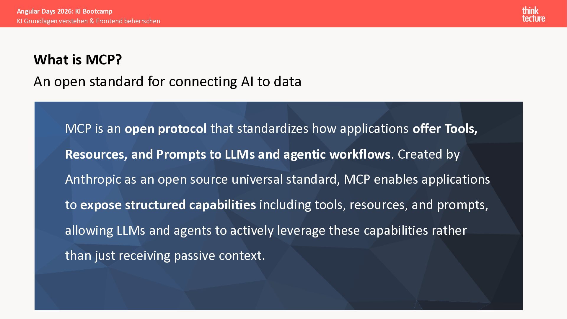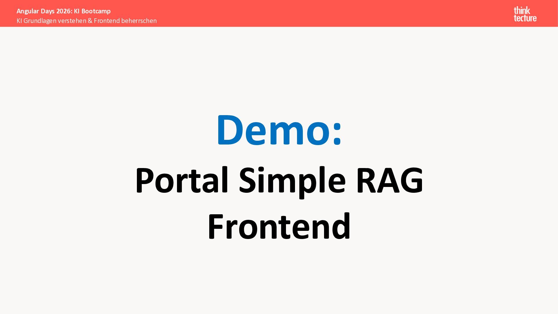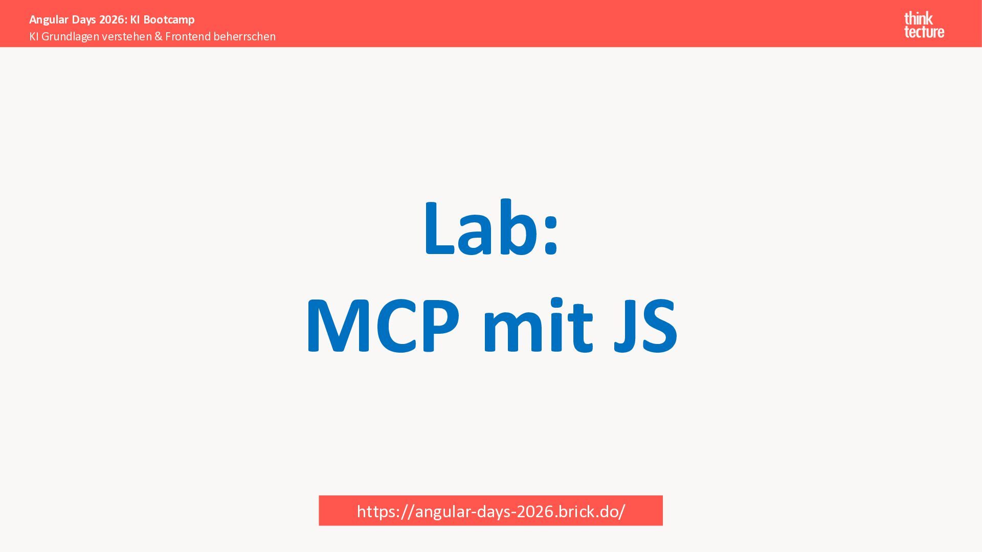 Der Fokus liegt auf modernen Frontend-Herausforderungen: optimaler API-Konsum, Streaming-Implementation für Echtzeit-Antworten, Darstellung von Reasoning-Prozessen bei Thinking-Modellen und die Erweiterung von Anwendungen um TypeScript-basierte MCP Server, die dem AI-Backend Zugriff auf Unternehmensdaten ermöglichen.