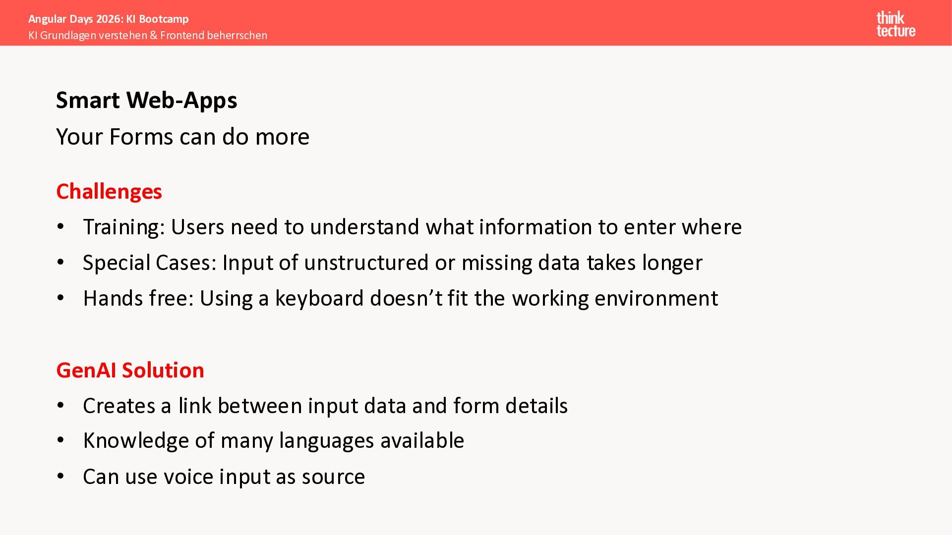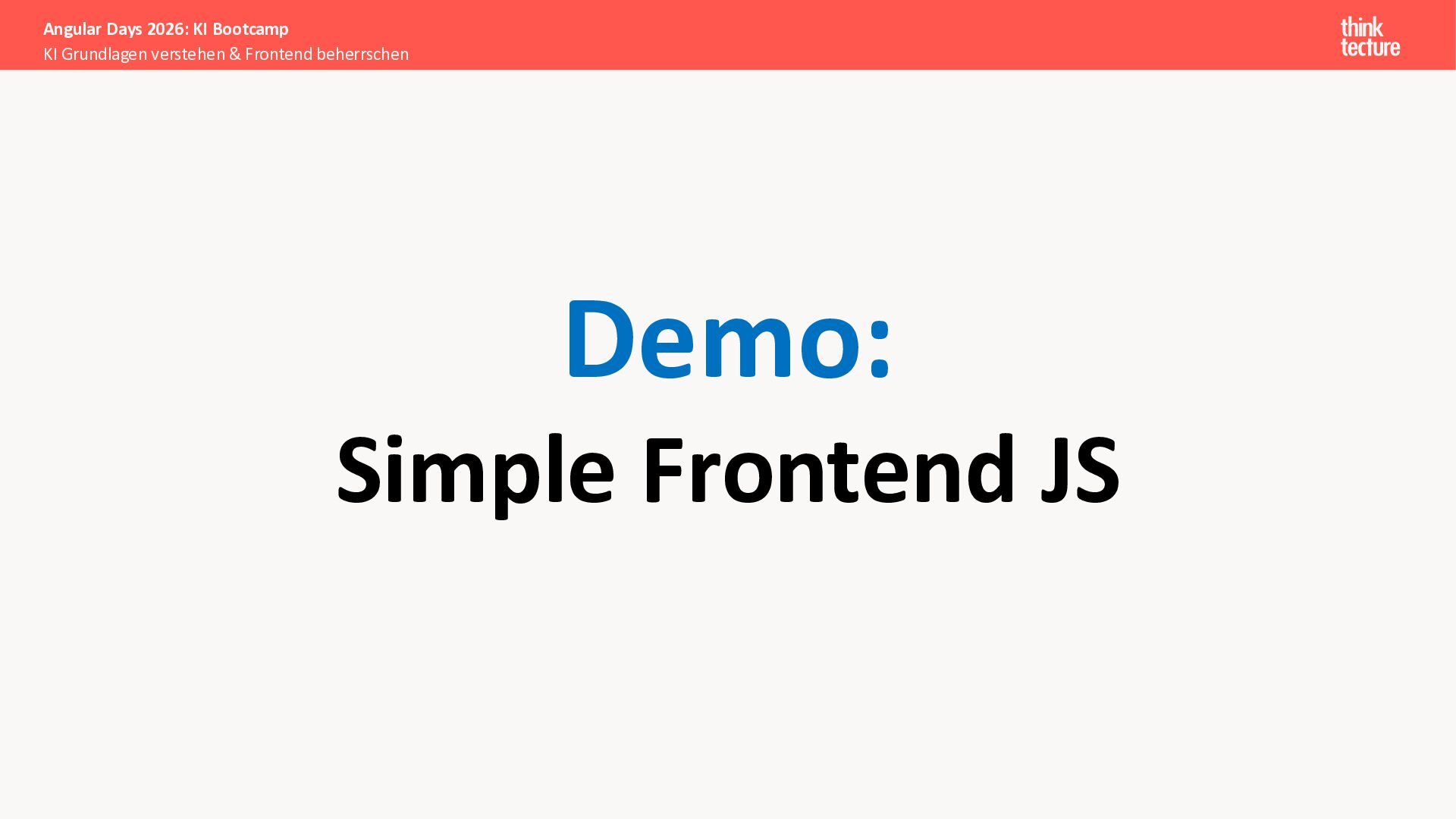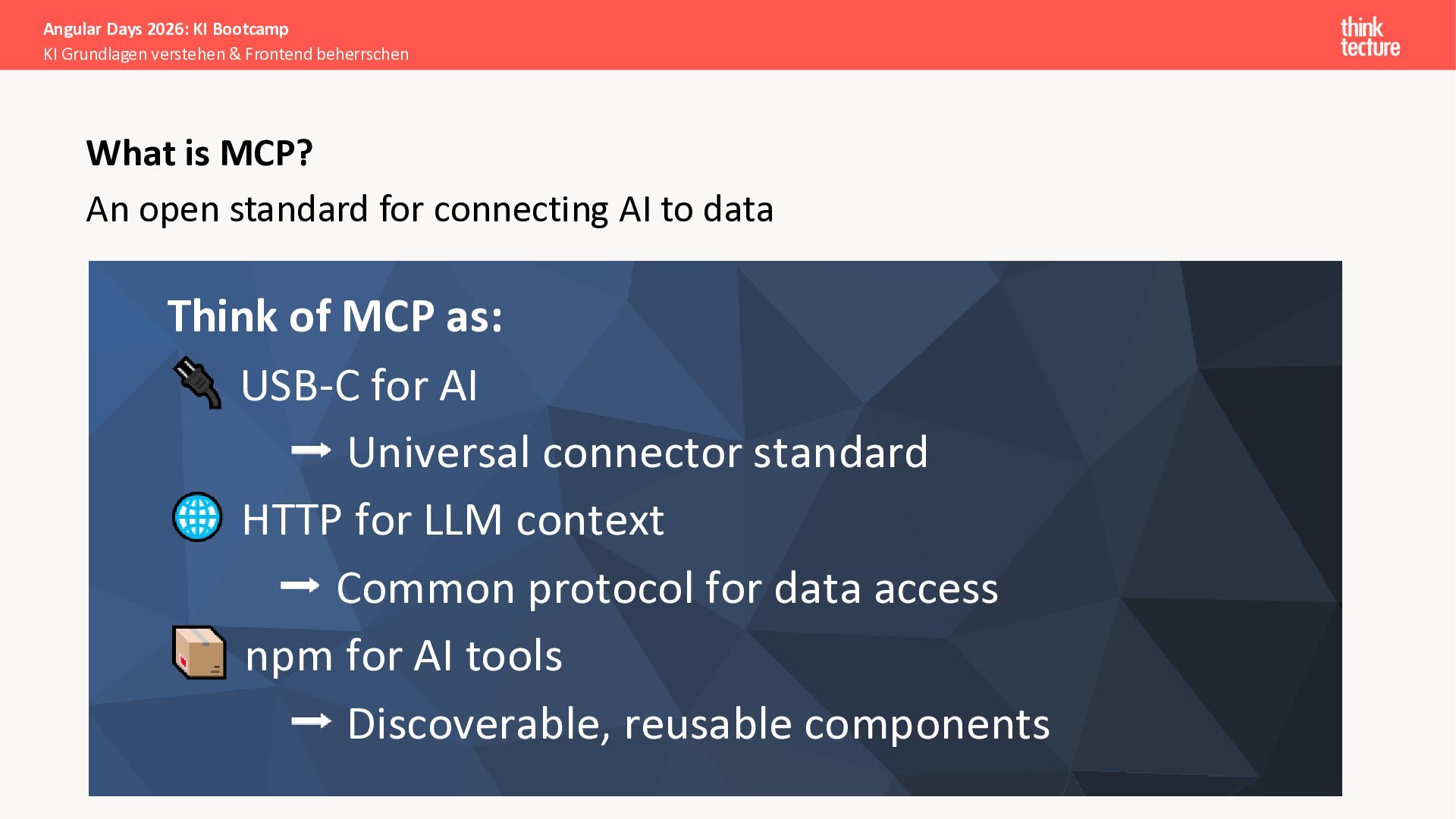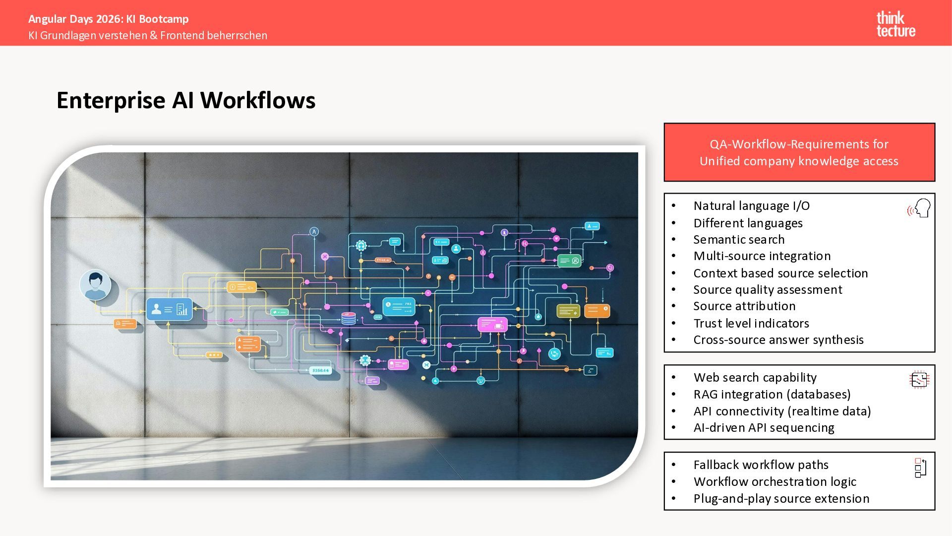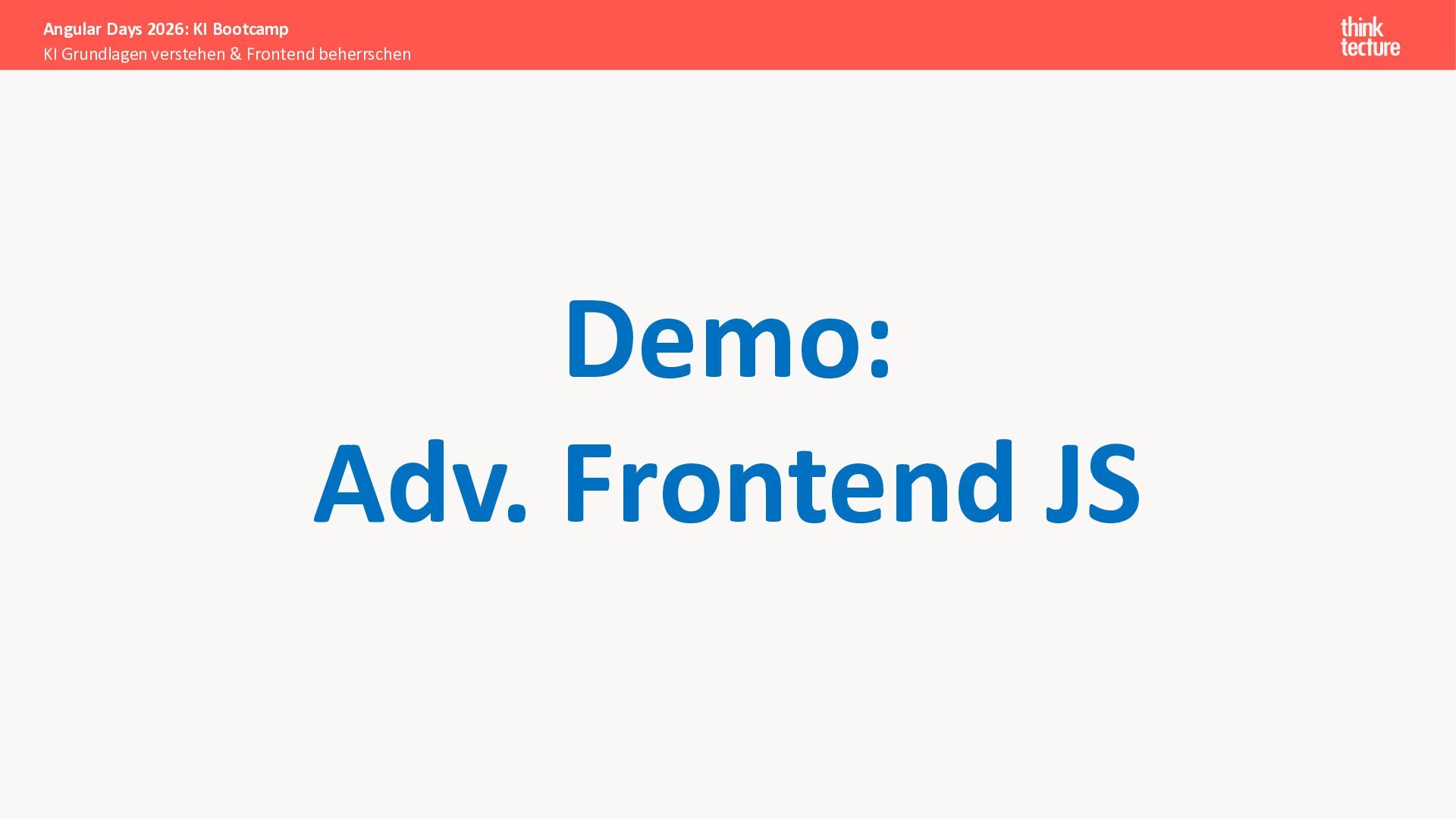 Der Fokus liegt auf modernen Frontend-Herausforderungen: optimaler API-Konsum, Streaming-Implementation für Echtzeit-Antworten, Darstellung von Reasoning-Prozessen bei Thinking-Modellen und die Erweiterung von Anwendungen um TypeScript-basierte MCP Server, die dem AI-Backend Zugriff auf Unternehmensdaten ermöglichen.