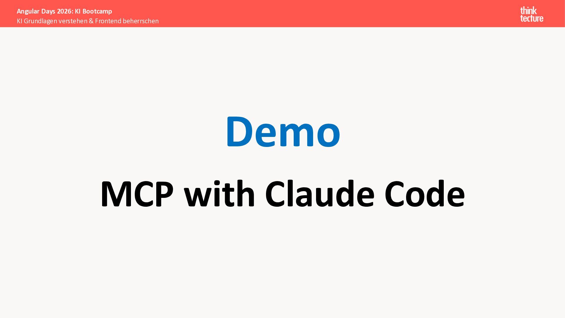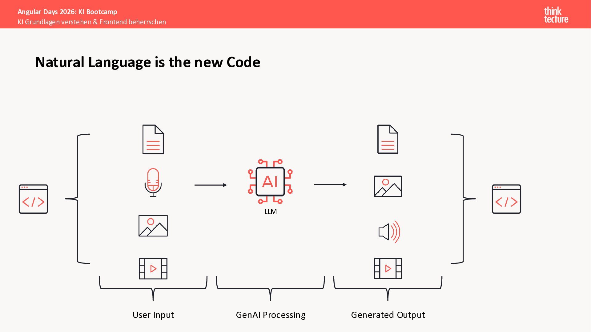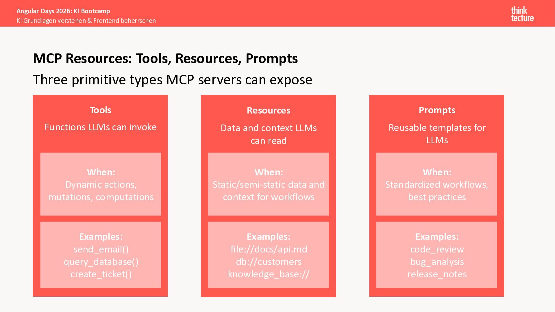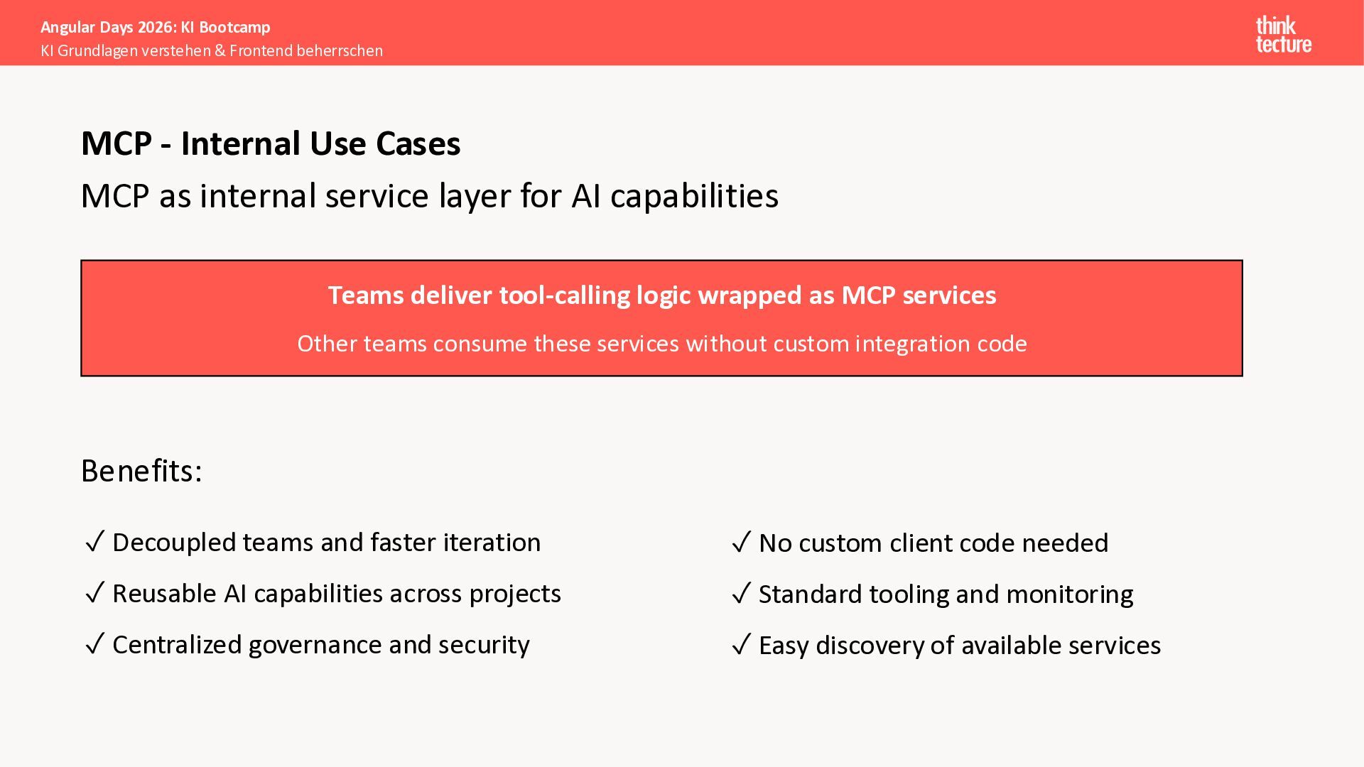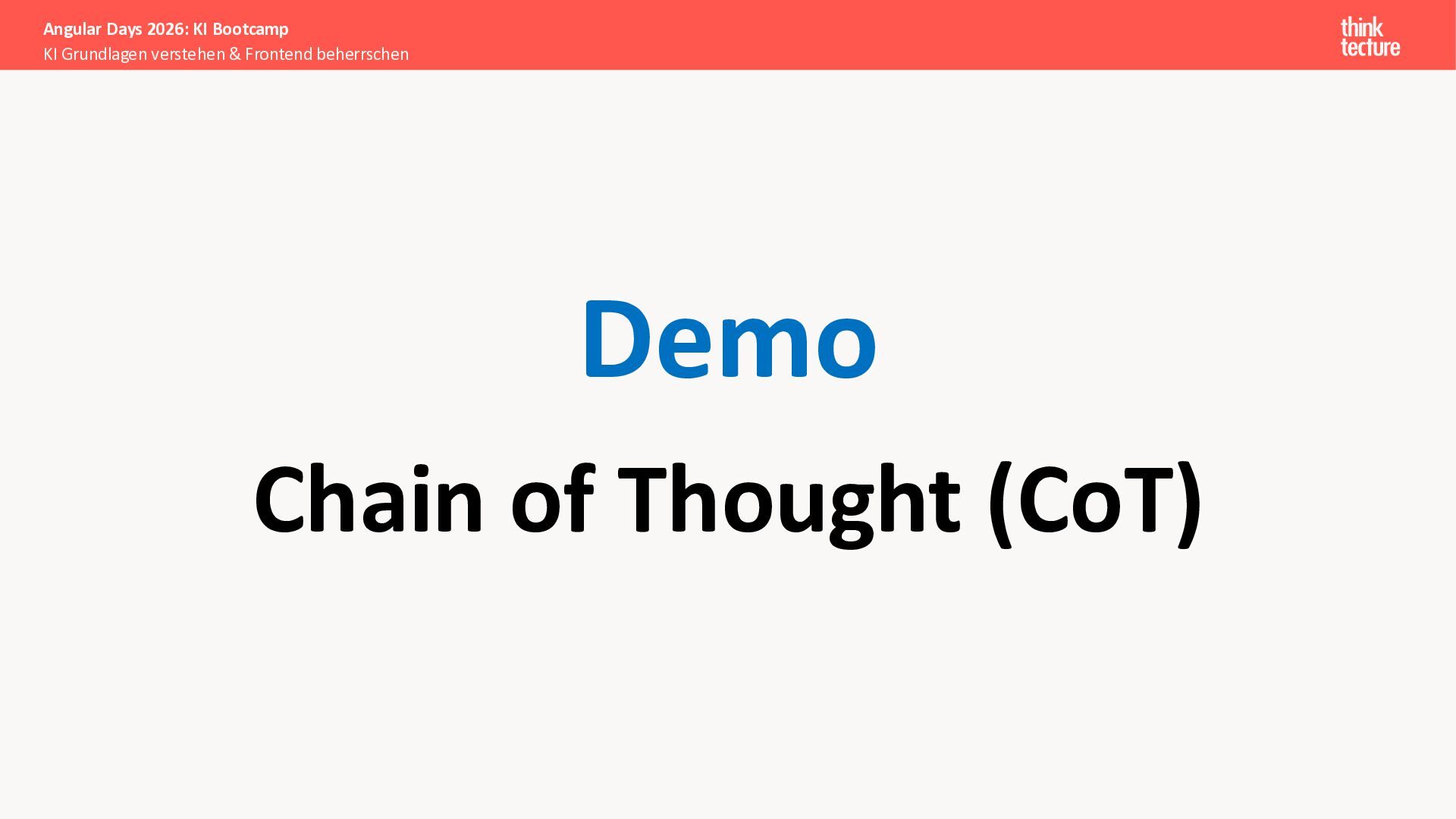 Der Fokus liegt auf modernen Frontend-Herausforderungen: optimaler API-Konsum, Streaming-Implementation für Echtzeit-Antworten, Darstellung von Reasoning-Prozessen bei Thinking-Modellen und die Erweiterung von Anwendungen um TypeScript-basierte MCP Server, die dem AI-Backend Zugriff auf Unternehmensdaten ermöglichen.