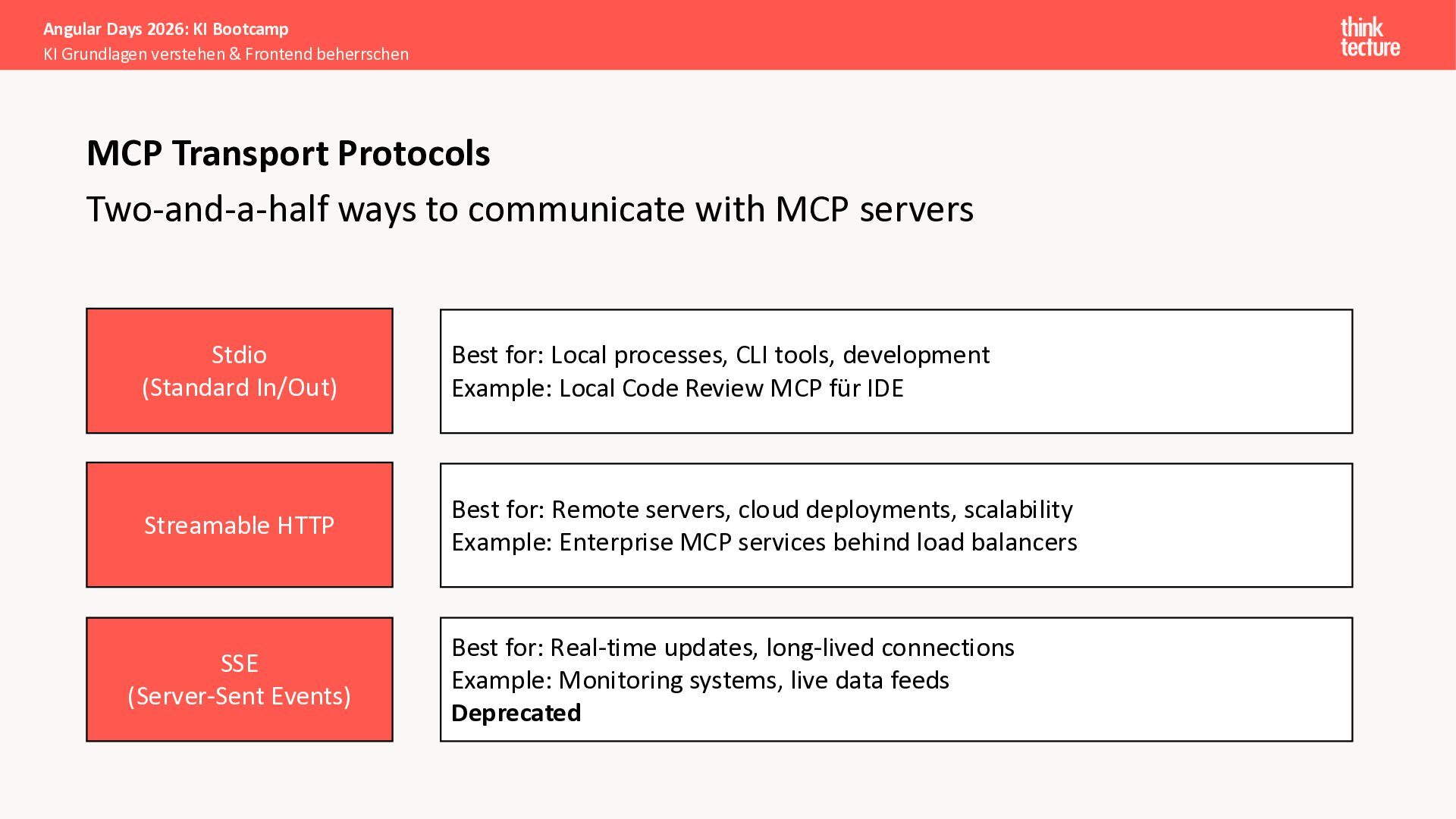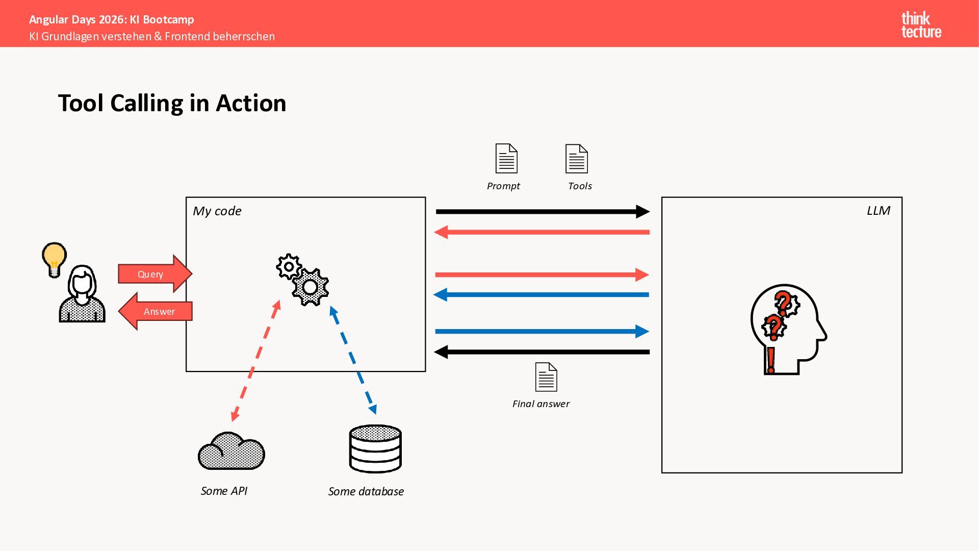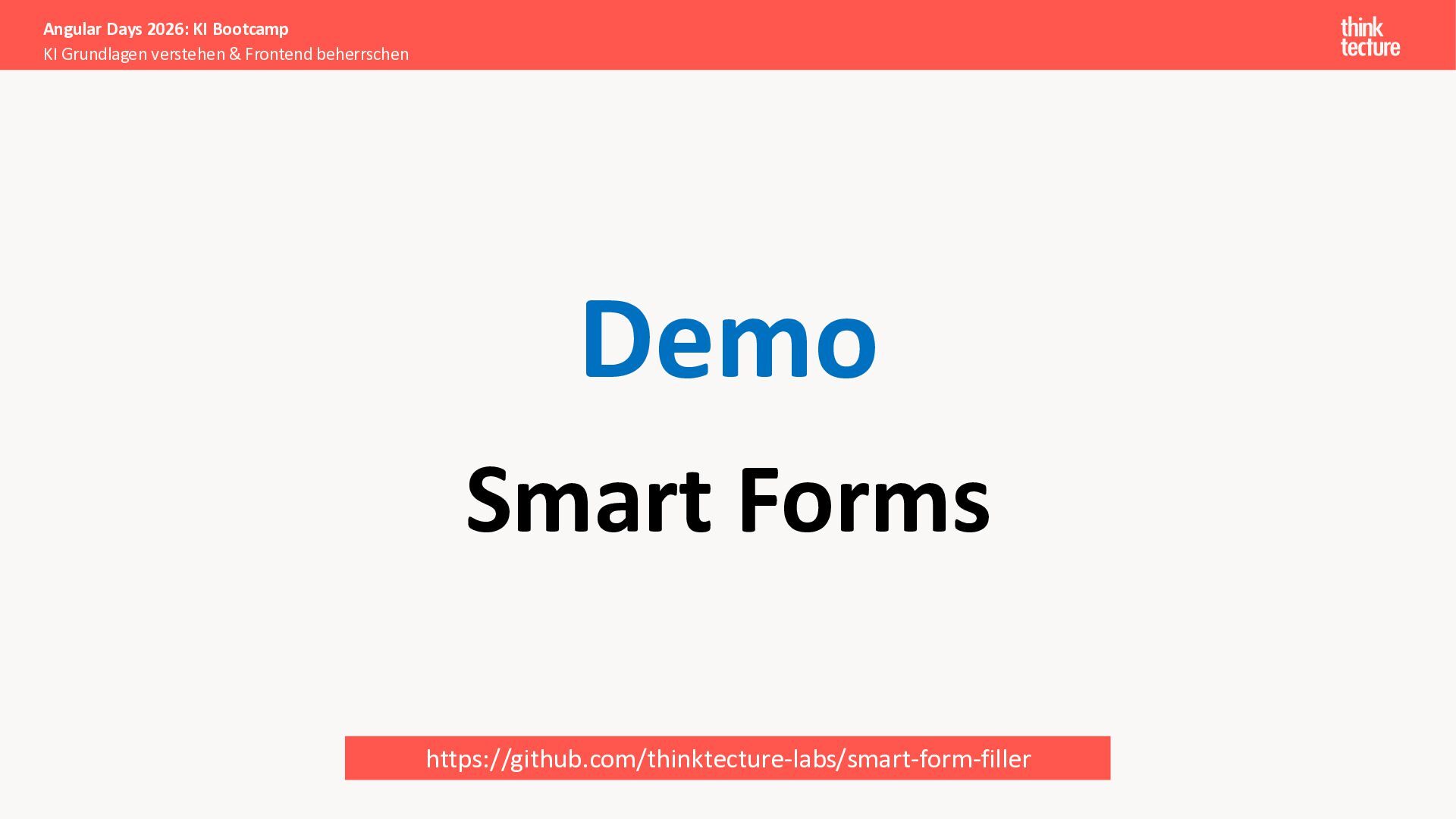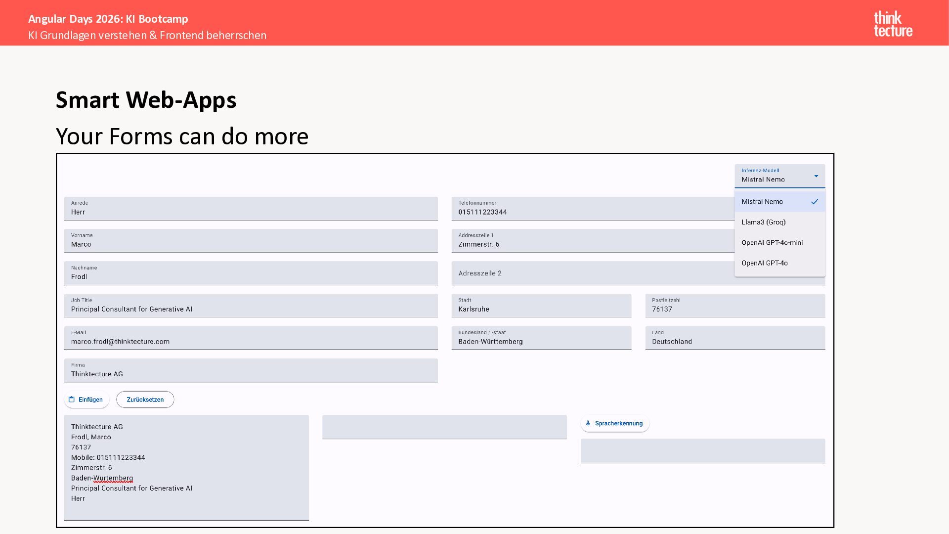 Der Fokus liegt auf modernen Frontend-Herausforderungen: optimaler API-Konsum, Streaming-Implementation für Echtzeit-Antworten, Darstellung von Reasoning-Prozessen bei Thinking-Modellen und die Erweiterung von Anwendungen um TypeScript-basierte MCP Server, die dem AI-Backend Zugriff auf Unternehmensdaten ermöglichen.