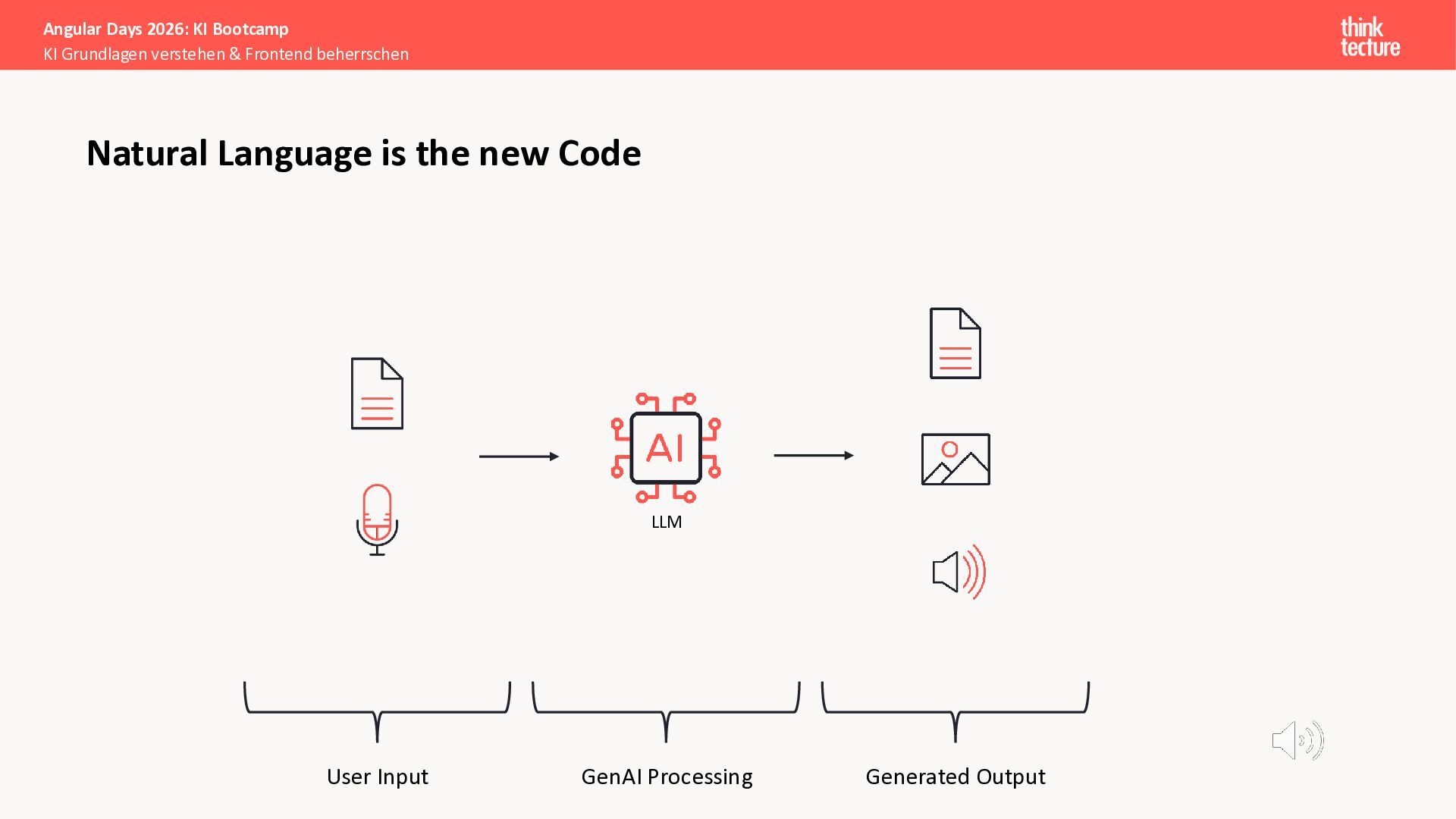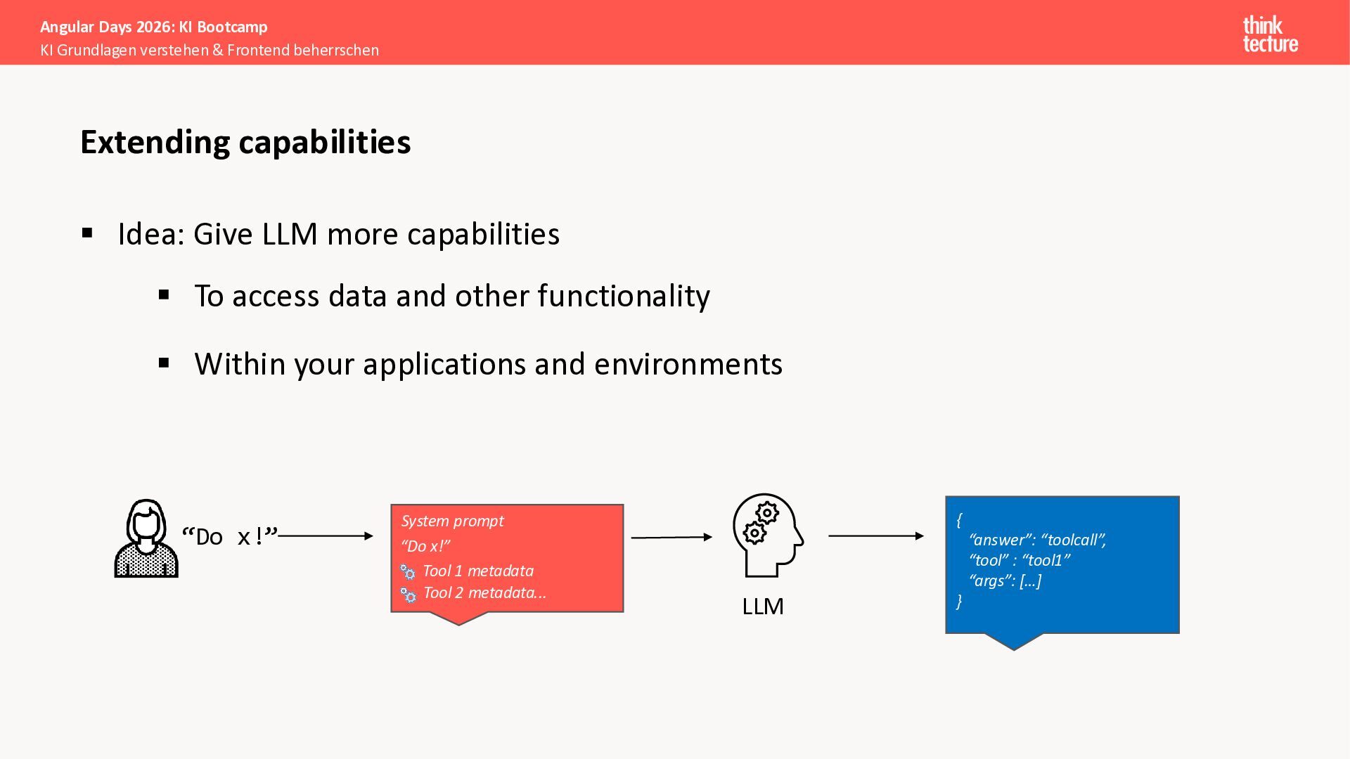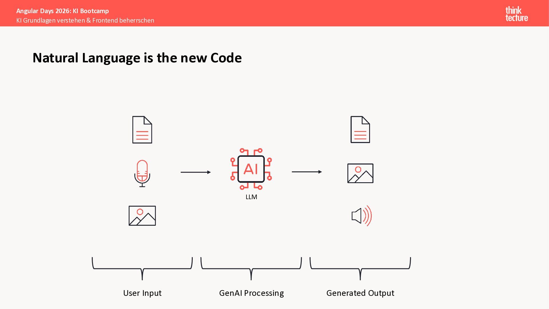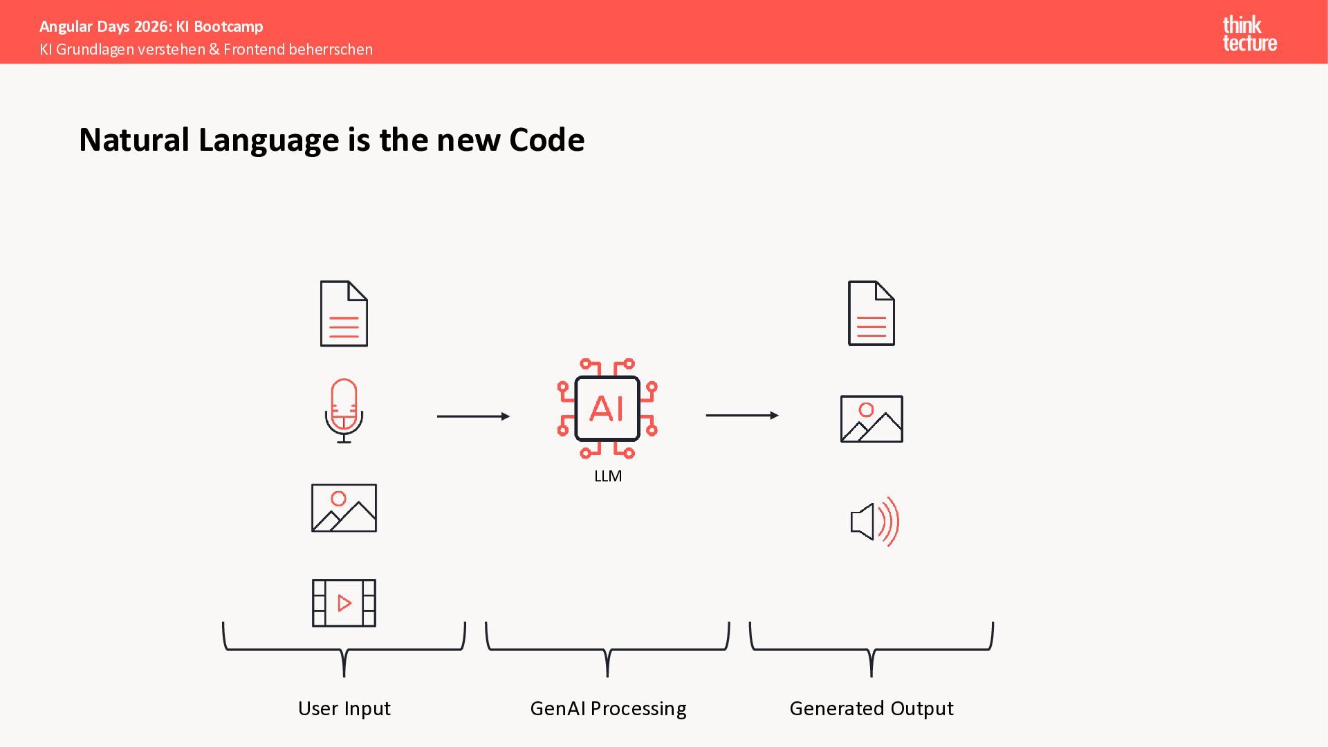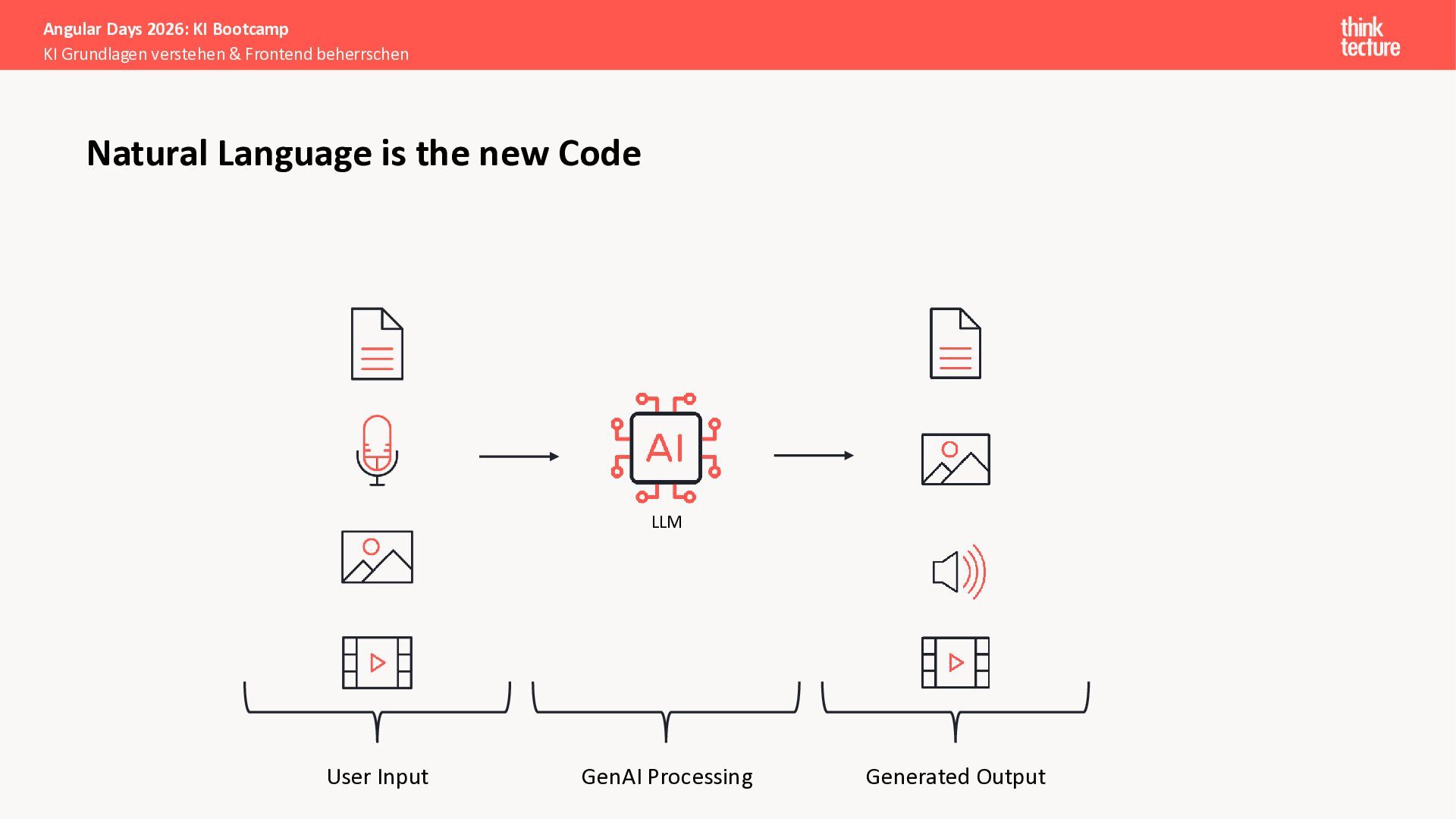 Der Fokus liegt auf modernen Frontend-Herausforderungen: optimaler API-Konsum, Streaming-Implementation für Echtzeit-Antworten, Darstellung von Reasoning-Prozessen bei Thinking-Modellen und die Erweiterung von Anwendungen um TypeScript-basierte MCP Server, die dem AI-Backend Zugriff auf Unternehmensdaten ermöglichen.