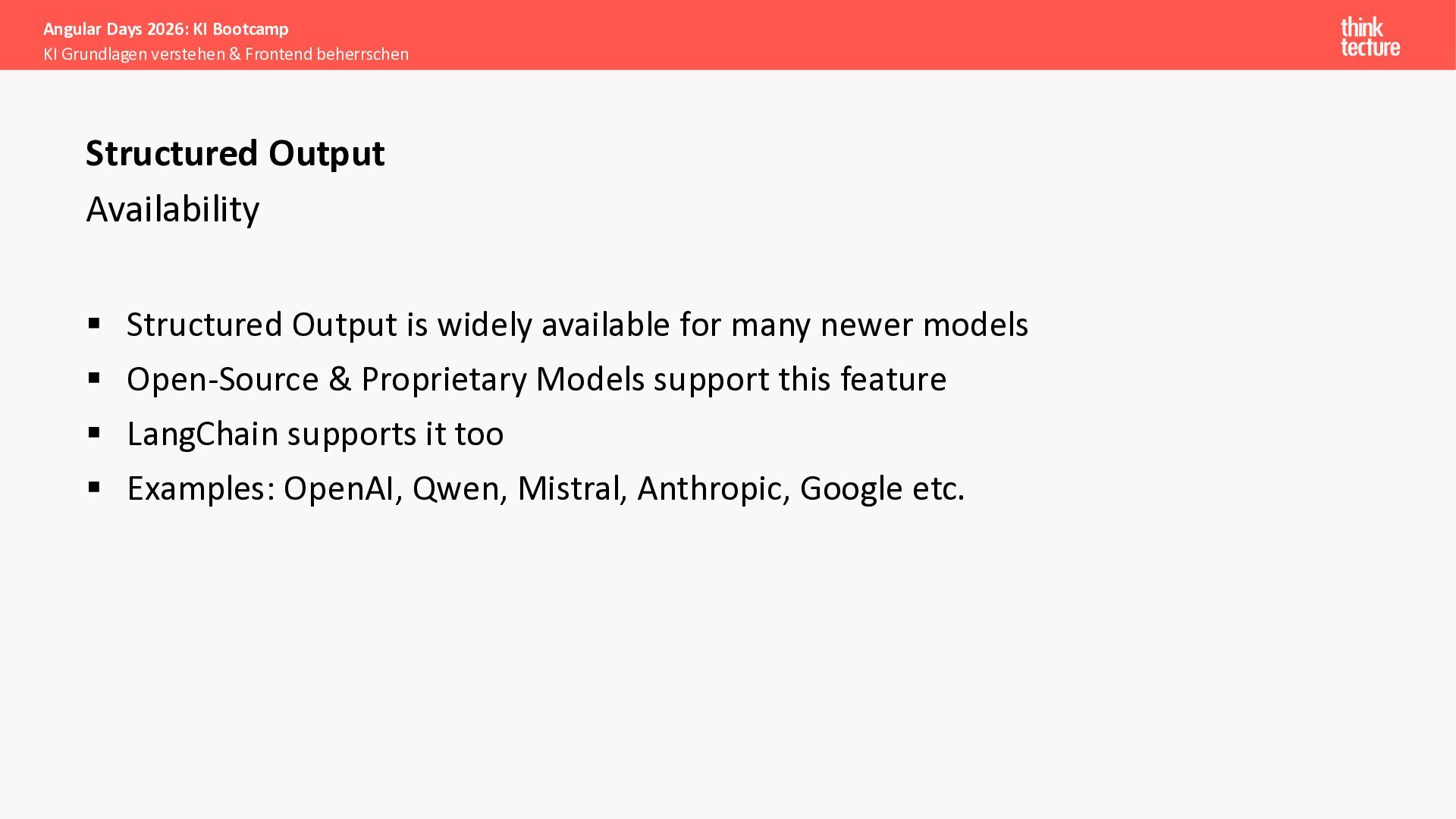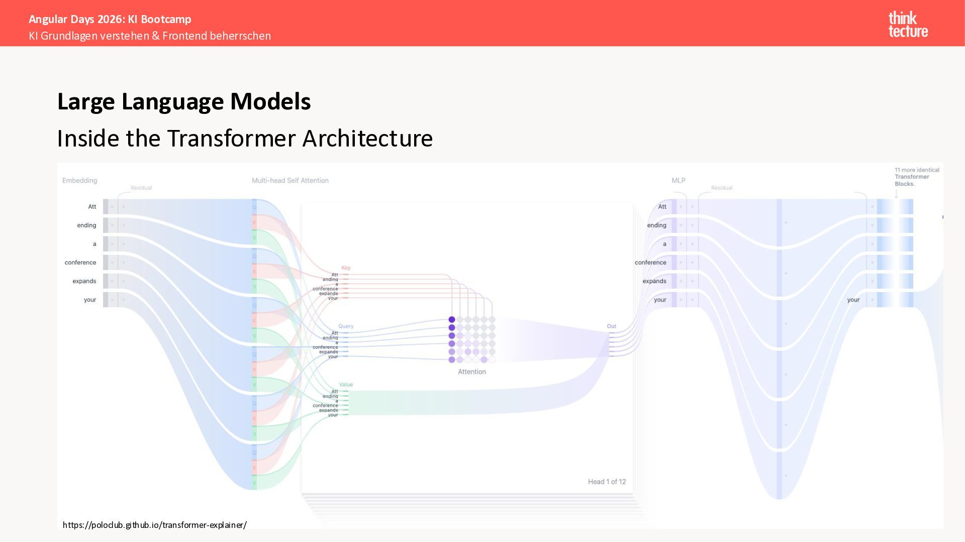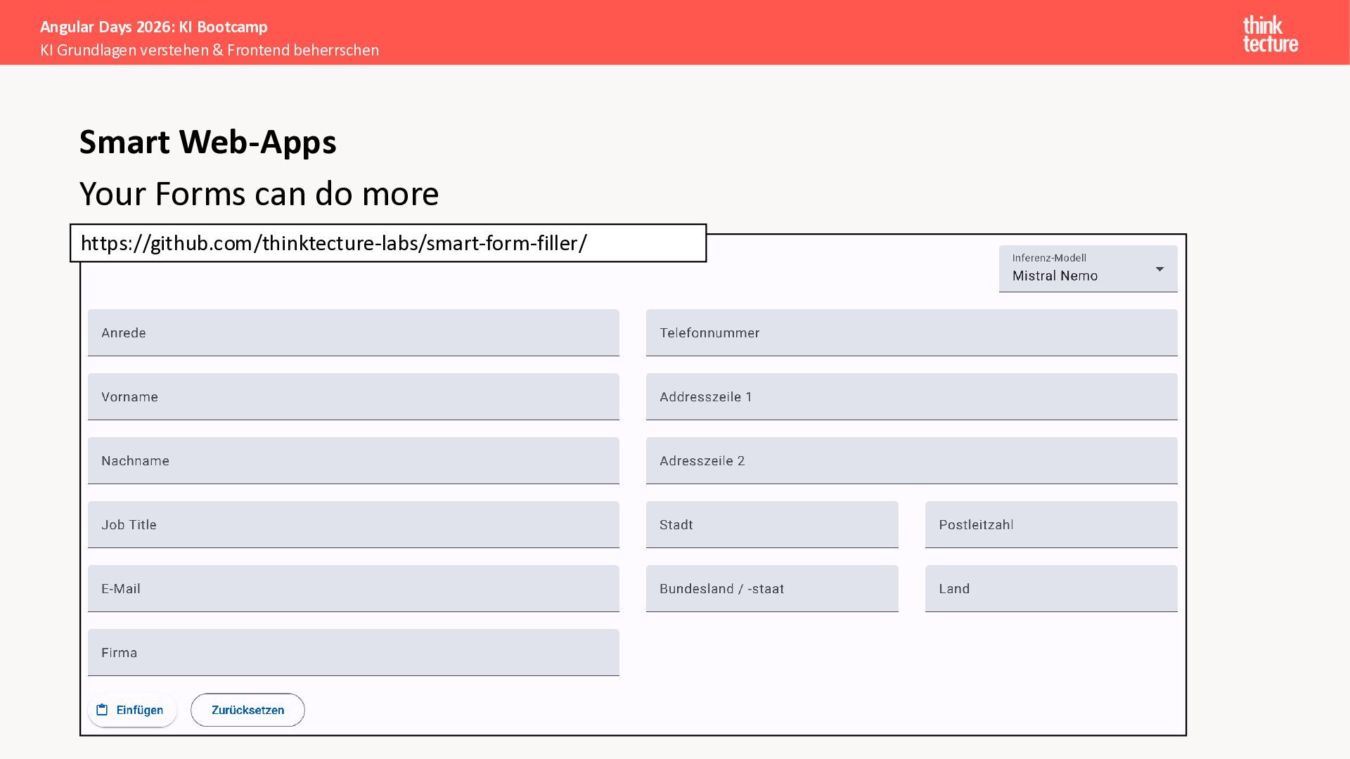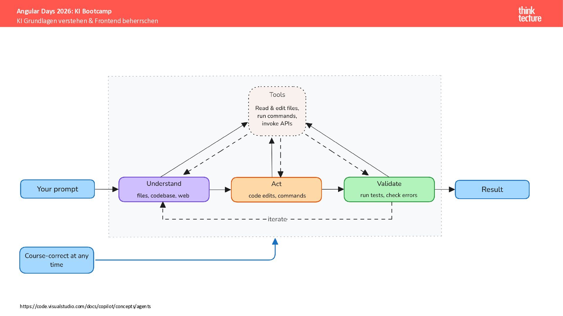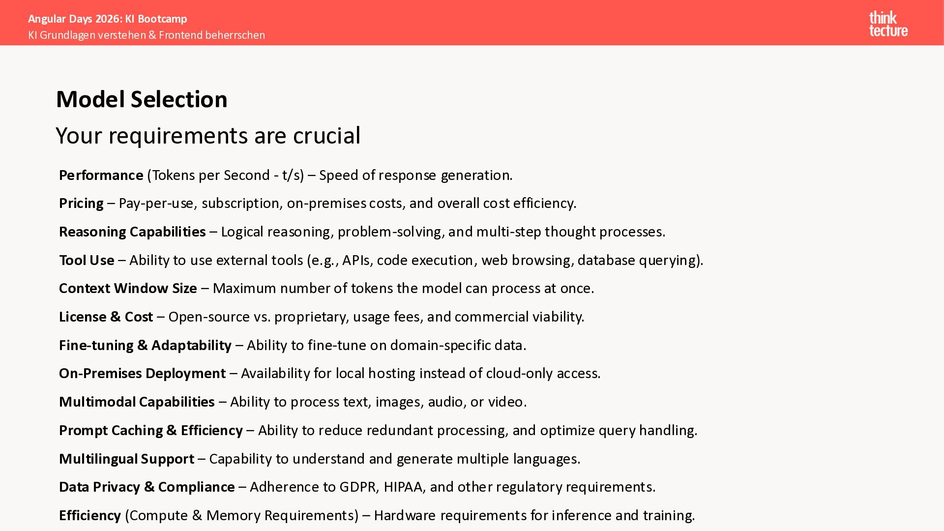 Der Fokus liegt auf modernen Frontend-Herausforderungen: optimaler API-Konsum, Streaming-Implementation für Echtzeit-Antworten, Darstellung von Reasoning-Prozessen bei Thinking-Modellen und die Erweiterung von Anwendungen um TypeScript-basierte MCP Server, die dem AI-Backend Zugriff auf Unternehmensdaten ermöglichen.