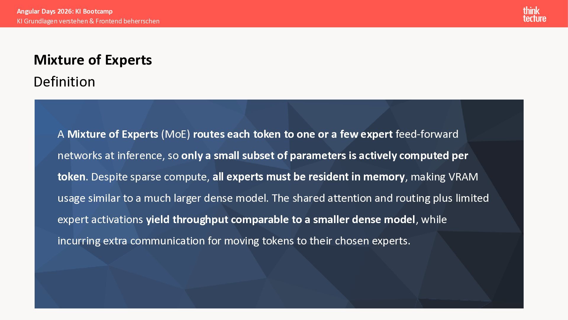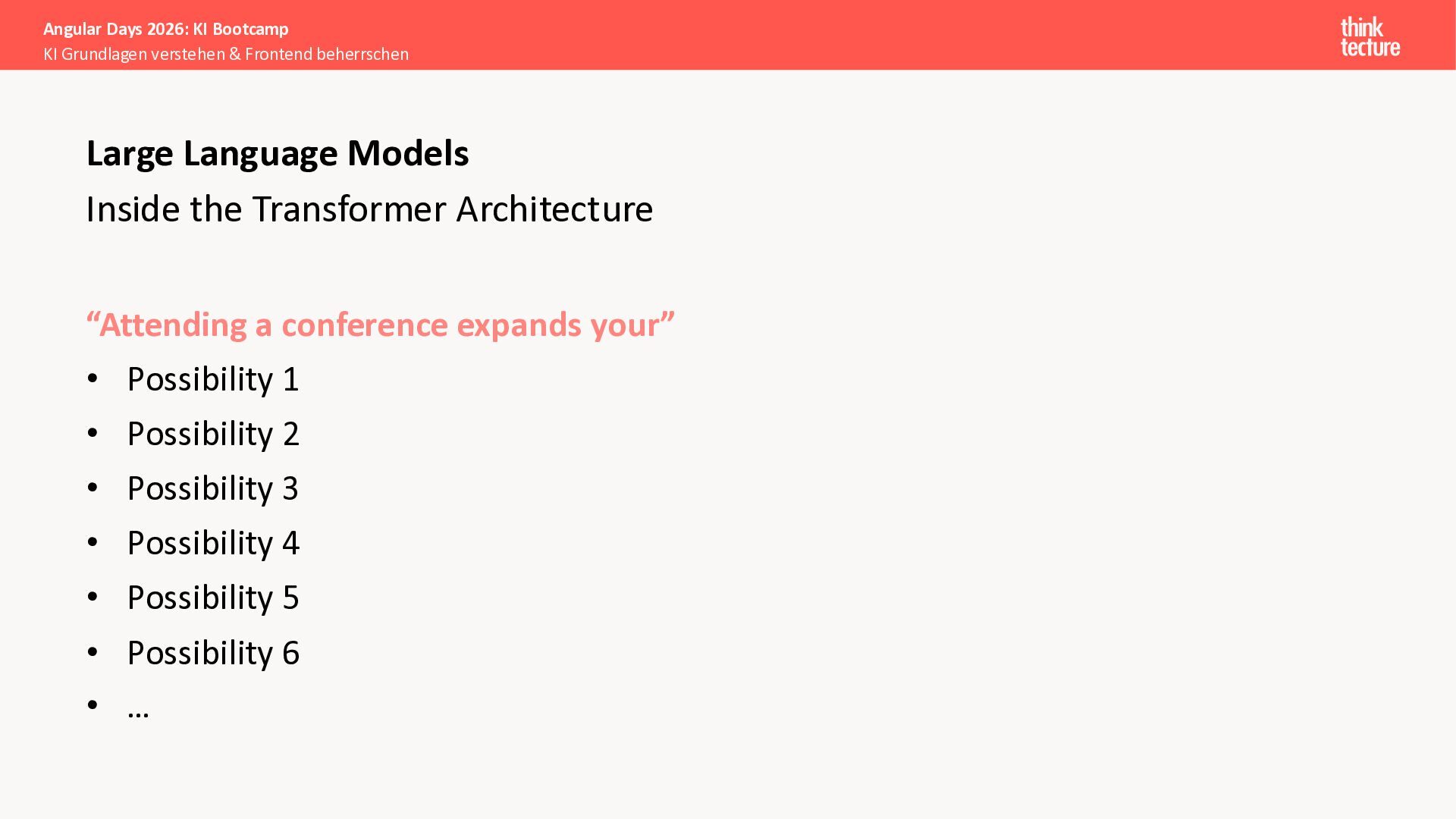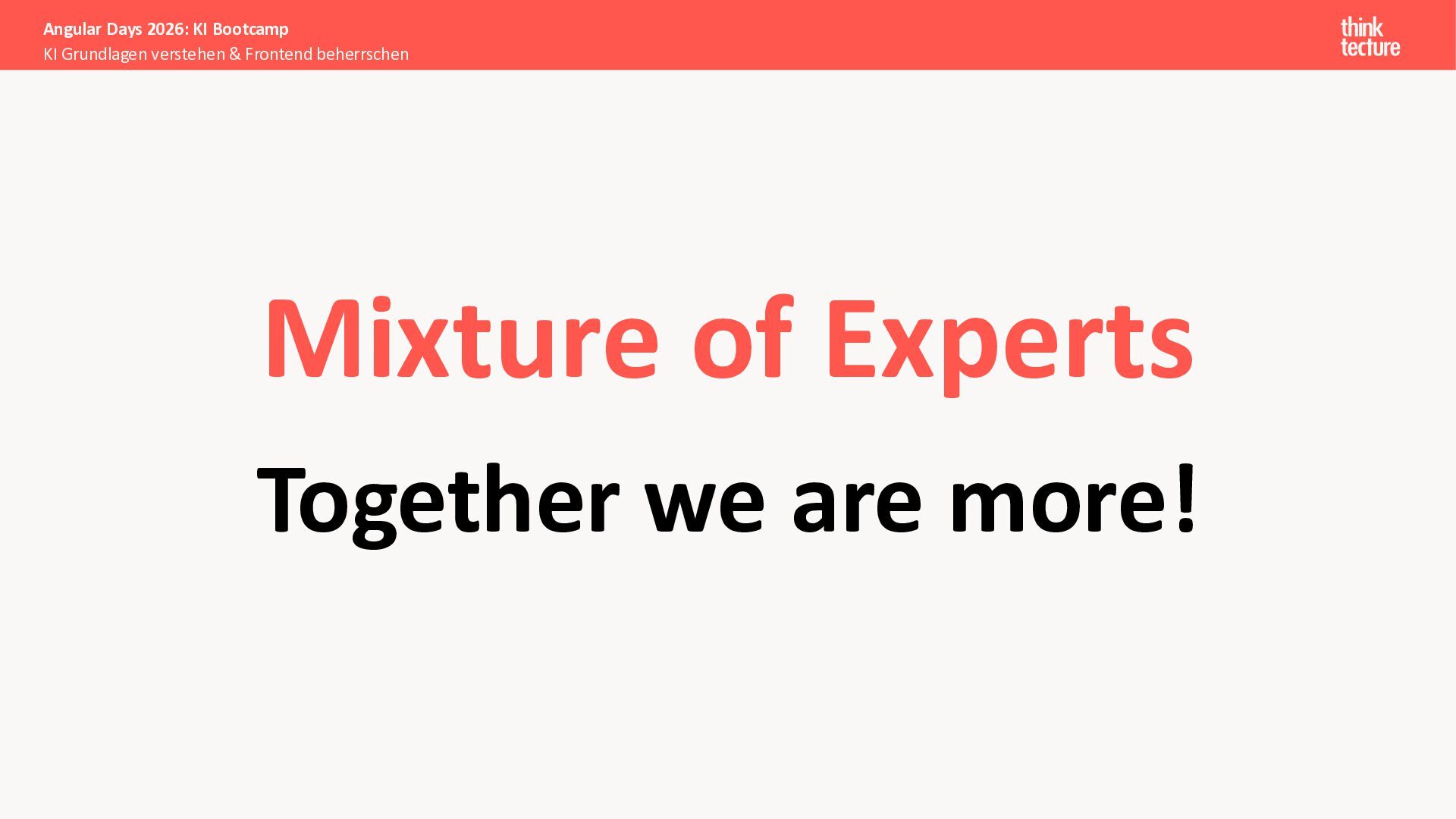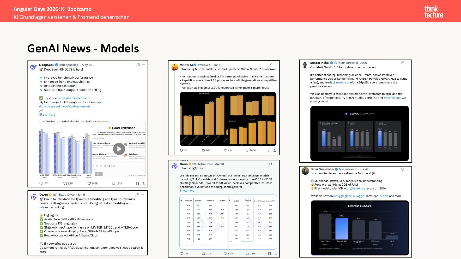 Der Fokus liegt auf modernen Frontend-Herausforderungen: optimaler API-Konsum, Streaming-Implementation für Echtzeit-Antworten, Darstellung von Reasoning-Prozessen bei Thinking-Modellen und die Erweiterung von Anwendungen um TypeScript-basierte MCP Server, die dem AI-Backend Zugriff auf Unternehmensdaten ermöglichen.