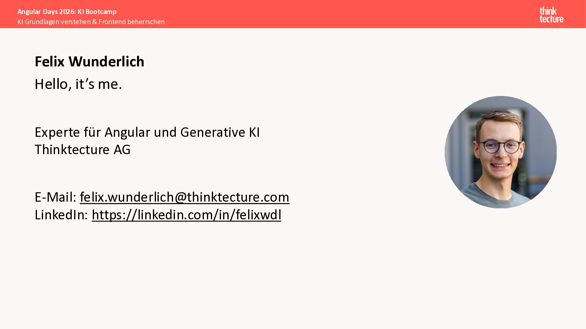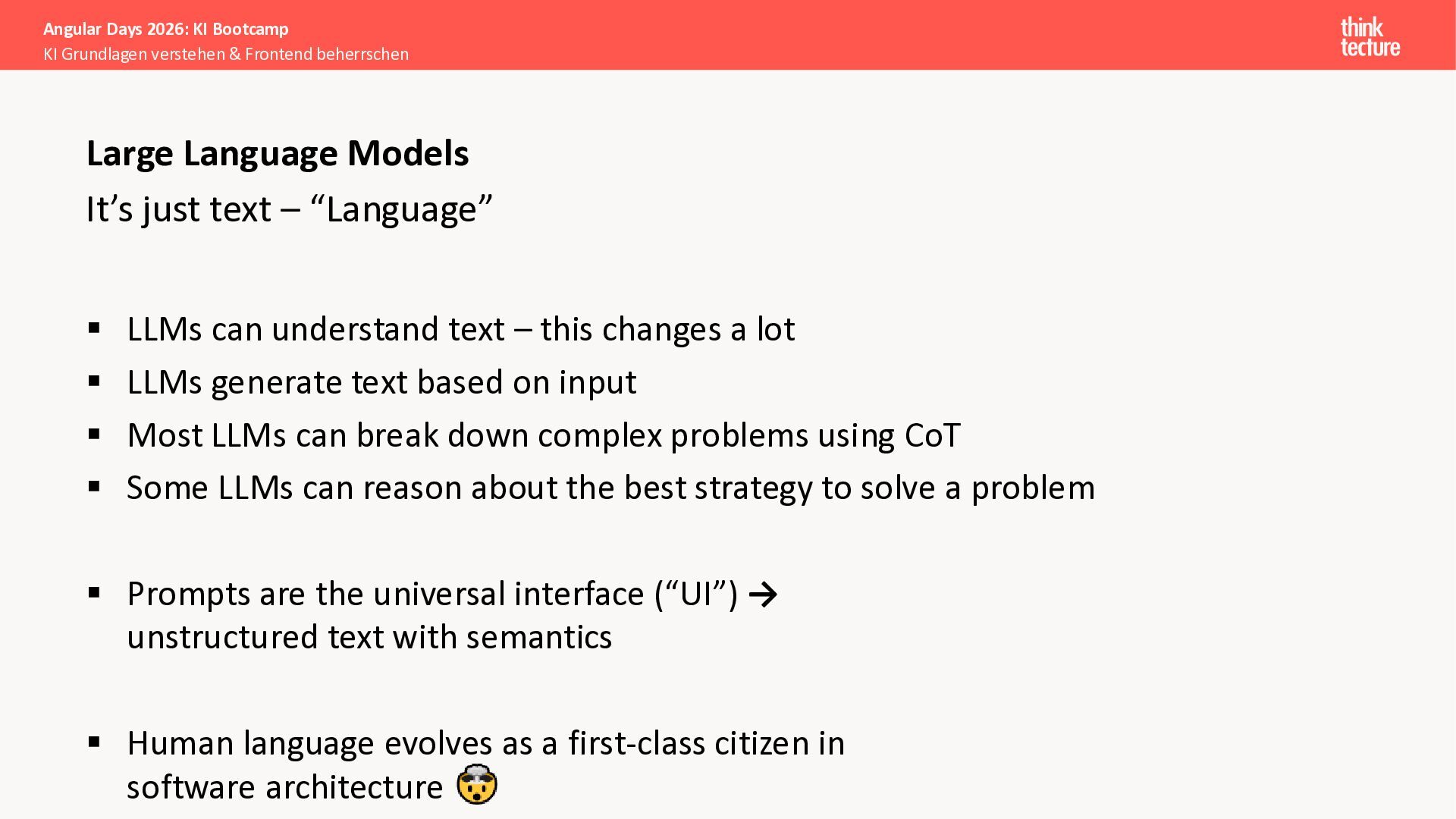 Generative AI revolutioniert Unternehmensanwendungen – aber Angular-Entwickler:innen müssen nicht zu AI-Backend-Expert:innen werden. Dieser zweitägige Workshop zeigt, wie du als Frontend-Entwickler:in professionell mit GenAI-APIs arbeiten und dabei optimale Benutzeroberflächen für AI-Anwendungen schaffst.