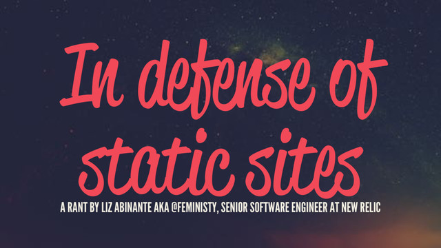 Static sites serve a purpose, and they're really important pieces of the web's history and its future. Static doesn't mean forever unchanged and it doesn't mean you're stuck with a dead site that you can never update. Quite frankly, static sites have gotten a bad reputation and it's not their fault: we've all been so distracted by shiny new things to remember their virtues.