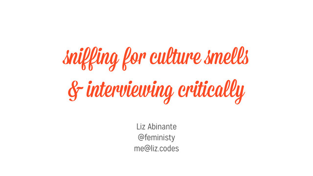 It is incredibly difficult to find a good place to work that matches your very unique requirements. How do you interview successfully while also critically examining a company? How do you sniff out culture smells and determine if a company’s work environment will be toxic to you? How do you discern if you will thrive or drown? Examining perspectives, policies, and real-world practices on diversity, employee satisfaction, and HR is not always best done with a questions-only approach. This talk details a multi-pronged approach to interviewing successfully with potential future employers that will help you sniff out culture smells.