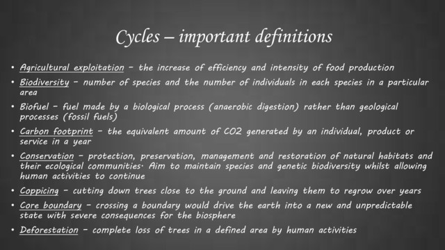 of efficiency and intensity of food production • Biodiversity – number of species and the number of individuals in each species in a particular area • Biofuel – fuel made by a biological process (anaerobic digestion) rather than geological processes (fossil fuels) • Carbon footprint – the equivalent amount of CO2 generated by an individual, product or service in a year • Conservation – protection, preservation, management and restoration of natural habitats and their ecological communities. Aim to maintain species and genetic biodiversity whilst allowing human activities to continue • Coppicing – cutting down trees close to the ground and leaving them to regrow over years • Core boundary – crossing a boundary would drive the earth into a new and unpredictable state with severe consequences for the biosphere • Deforestation – complete loss of trees in a defined area by human activities