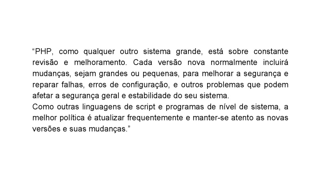 e melhoramento. Cada versão nova normalmente incluirá mudanças, sejam grandes ou pequenas, para melhorar a segurança e reparar falhas, erros de configuração, e outros problemas que podem afetar a segurança geral e estabilidade do seu sistema. Como outras linguagens de script e programas de nível de sistema, a melhor política é atualizar frequentemente e manter-se atento as novas versões e suas mudanças.”