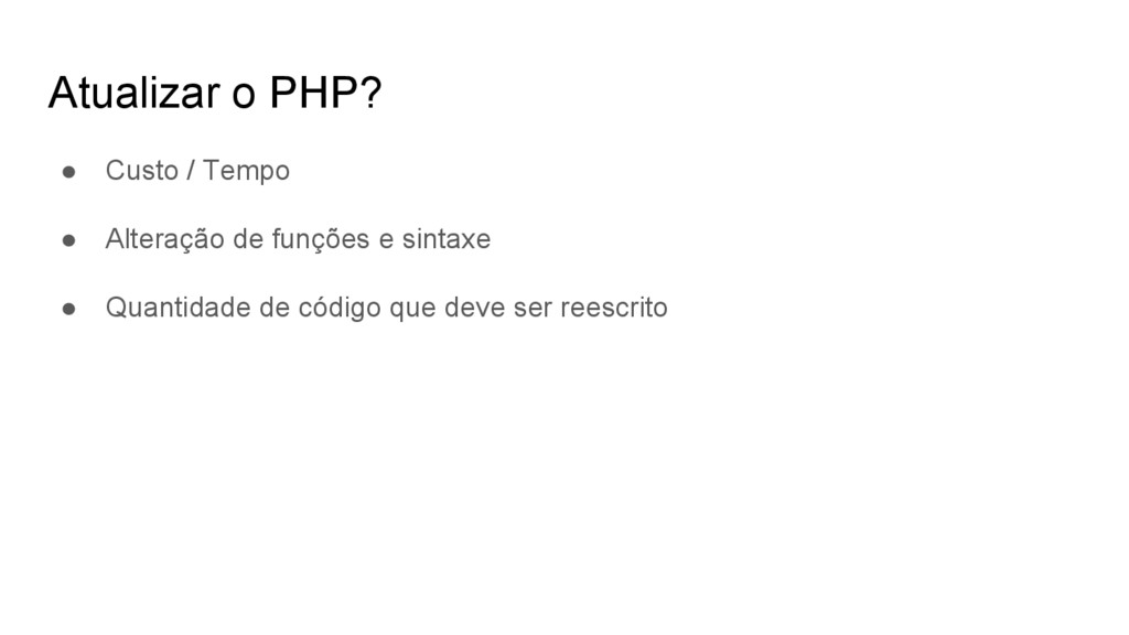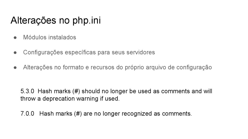 Alterações no formato e recursos do próprio arquivo de configuração Alterações no php.ini 5.3.0 Hash marks (#) should no longer be used as comments and will throw a deprecation warning if used. 7.0.0 Hash marks (#) are no longer recognized as comments.
