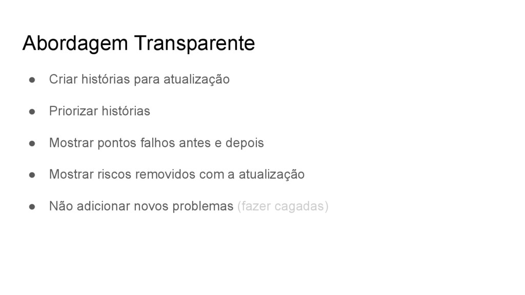 Tornar estas tasks requisitos • Disseminar o conteúdo na equipe de forma suave • Coding dojo • MeetUP • Mostrar com o tempo que foram mitigados problemas de segurança