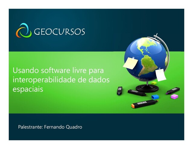 livres em 2005 • Ministrou o 1º Curso de GeoServer no Brasil em 2007 • Vasta experiência com GeoServer, PostGIS, OpenLayers • Fundador da Geocursos • Consultor em Geotecnologias livres O Palestrante