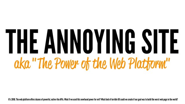 It's 2018. The web platform offers dozens of powerful, native-like APIs. What if we used this newfound power for evil? What kind of terrible UX could we create if our goal was to build the worst web page in the world?