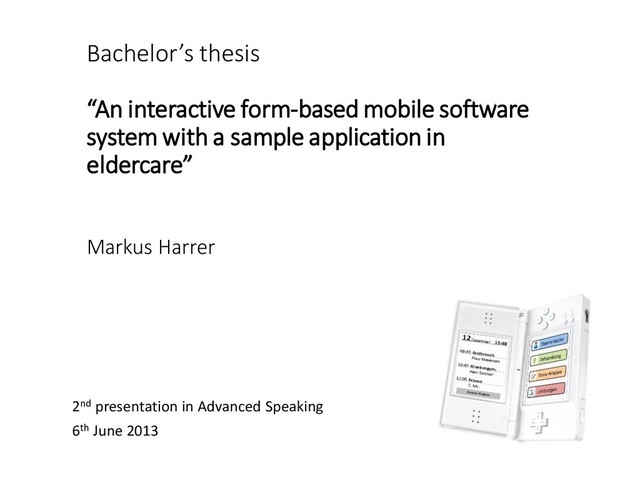home • Different forms per nursing home • Many non-technical people • Work mobile • Use medical equipment Conclusions 1. Need for modular, customizable software system 2. Mobile device, touch screen input, game-oriented interface / animations and direct hardware access 6/6/2013 Markus Harrer Slide 21 1. Analyze requirements