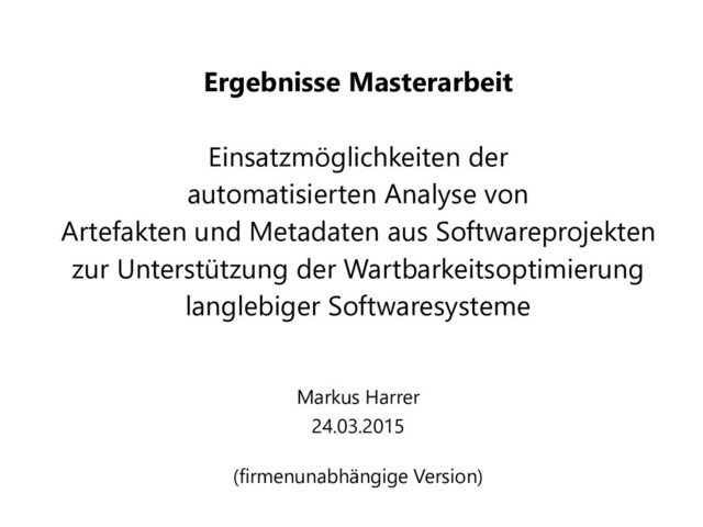 Entscheidern in Softwareunternehmen fehlen für eine wirtschaftlich sinnvolle Verbesserung der Wartbarkeit oft die geeigneten, handlungsunterstützenden Informationen zur Ableitung zielgerichteter Maßnahmen. Diese Arbeit versucht, durch die automatisierte Analyse von Softwaredaten (wie Quellcodedateien oder Fehlermeldungen) eine fundierte Entscheidungsgrundlage für die Optimierung der Wartbarkeit langlebiger Softwaresysteme zu schaffen.