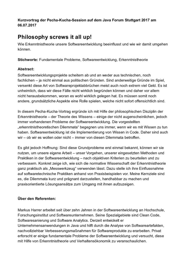 In diesem Pecha-Kucha-Vortrag ergründe ich mit Hilfe der philosophischen Disziplin der Erkenntnistheorie – der Theorie des Wissens – einige der nicht augenscheinlichen, jedoch immer vorhandenen Probleme der Softwareentwicklung. Die vorgestellten „erkenntnistheoretischen Dilemmata“ begegnen uns immer, wenn wir es mit Wissen zu tun haben. Softwareentwicklung ist die Implementierung von Wissen in Code. Daher sind auch wir – ob wir es wollen oder nicht – immer von diesen Dilemmata betroffen.