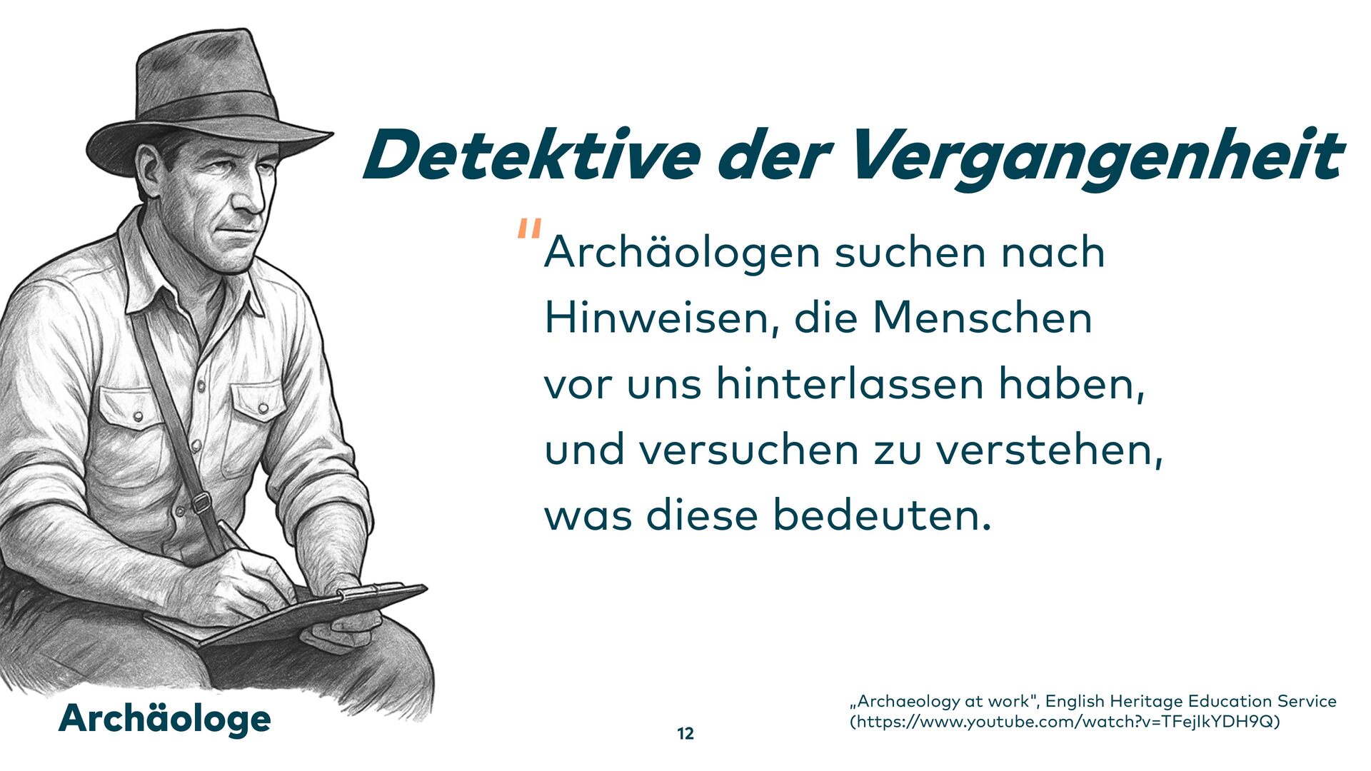 und versuchen zu verstehen, was diese bedeuten. Detektive der Vergangenheit “ Archäologe 12 „Archaeology at work", English Heritage Education Service (https://www.youtube.com/watch?v=TFejIkYDH9Q)