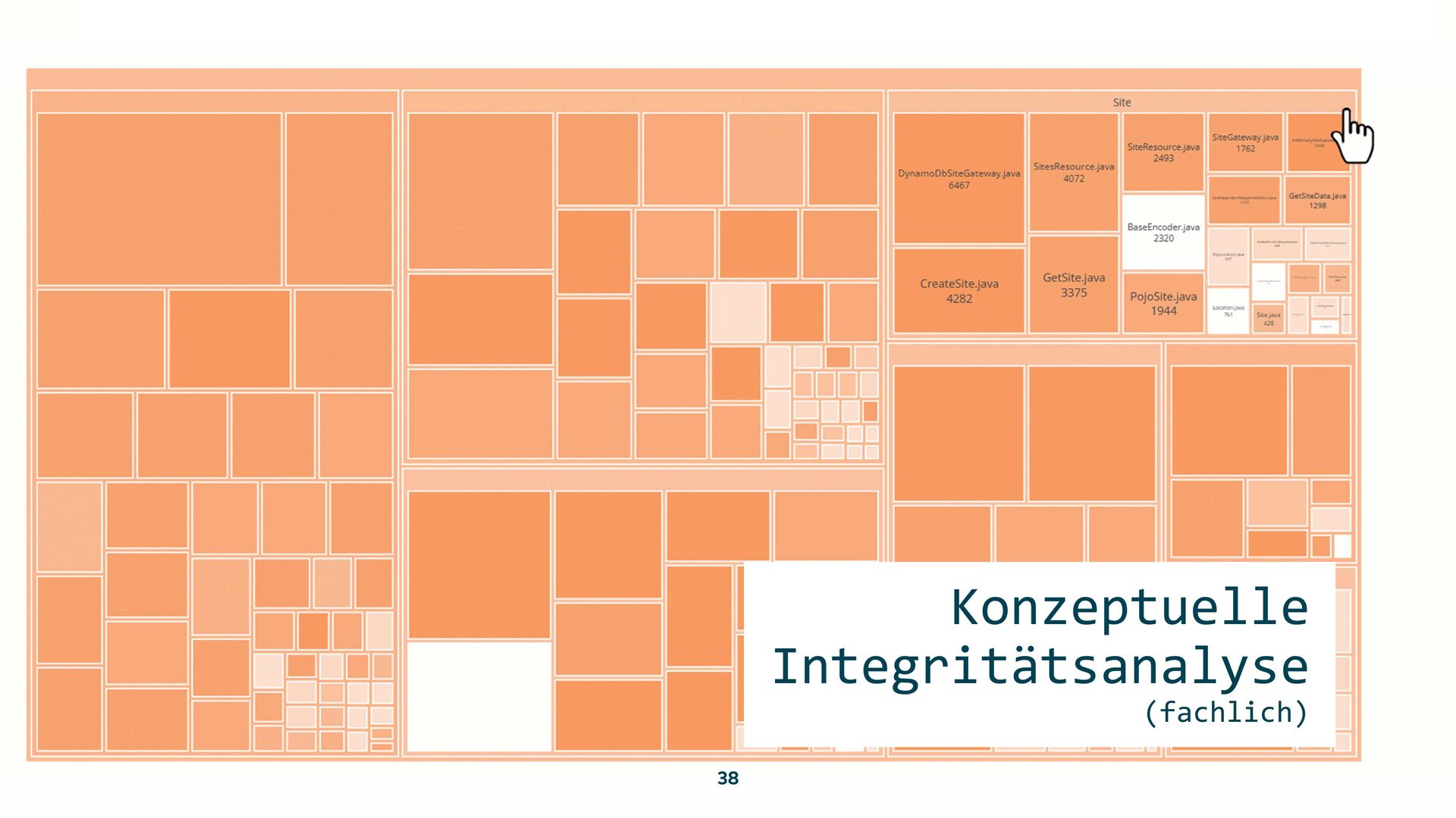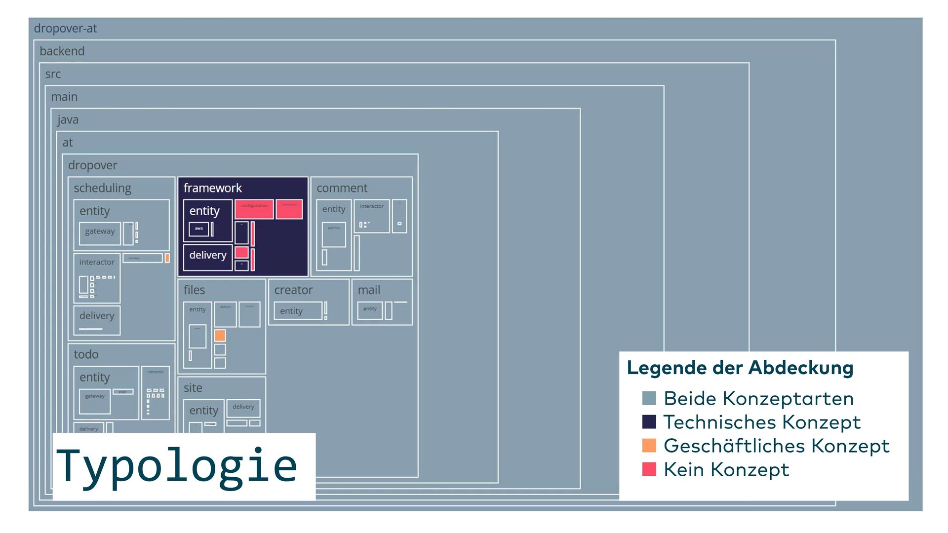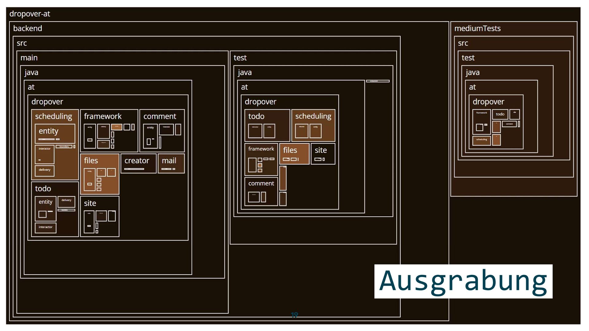 wie viel da?“ Technische Konzepte Boundary: 66 file(s) Interactor: 45 file(s) Entity: 62 file(s) Gateway: 17 file(s) Delivery: 19 file(s) RESTful API: 15 file(s) Dependency Injection: 1 file(s) Request Model: 30 file(s) Response Model: 22 file(s) POJO Entities: 10 file(s) Validation: 8 file(s) Business-Konzepte Site: 23 file(s) Comment: 28 file(s) Creator: 9 file(s) File: 22 file(s) Scheduling: 49 file(s) Todo List: 43 file(s) Mail Notification: 8 file(s) + Webseite / Forms + Tabellen + Integrationen … + Zusammenhänge