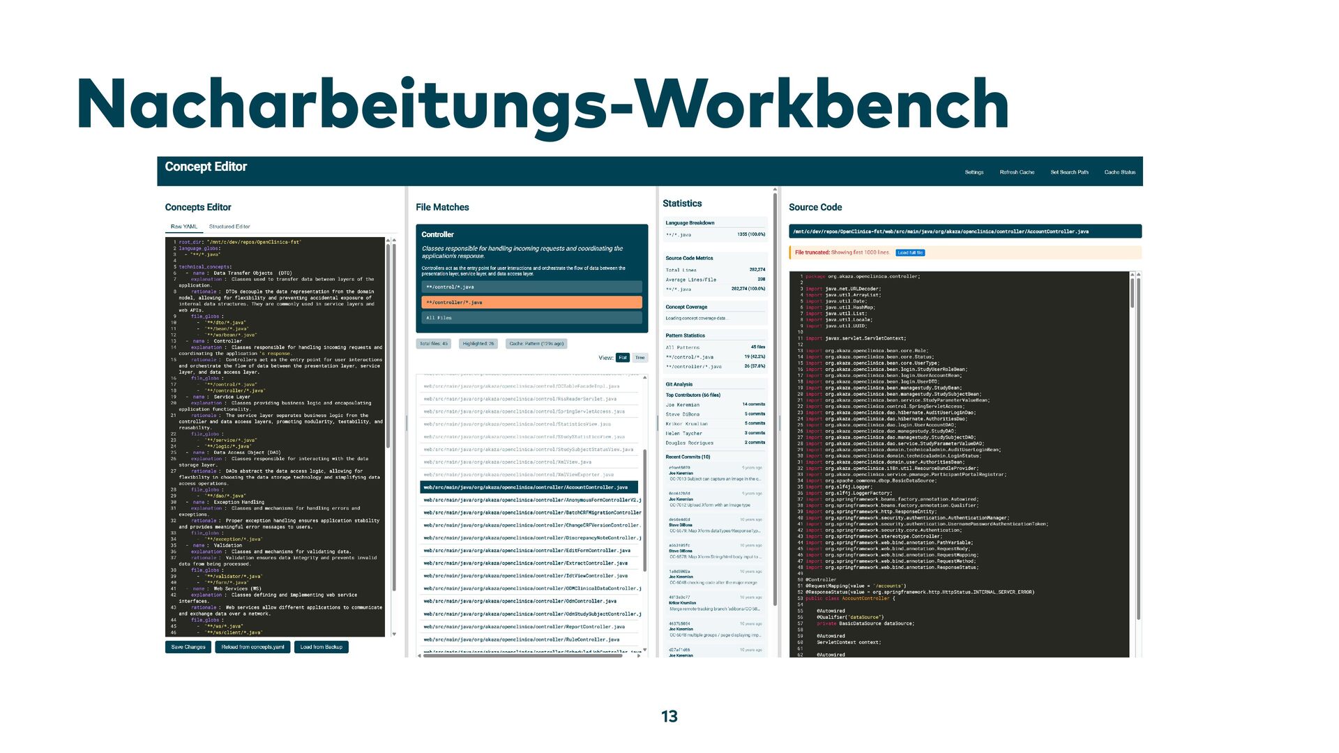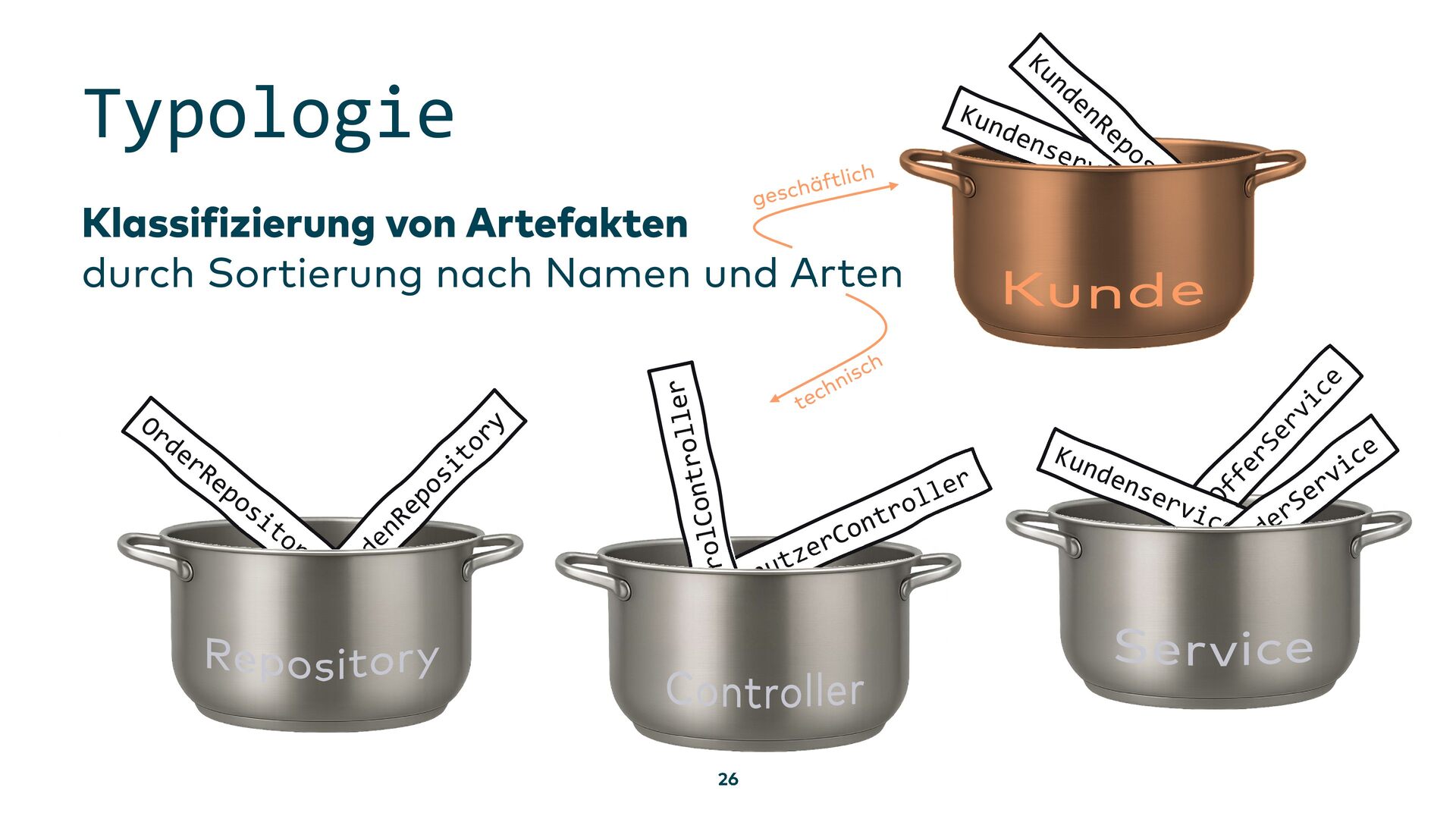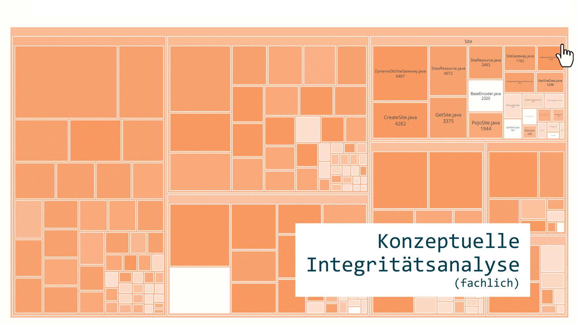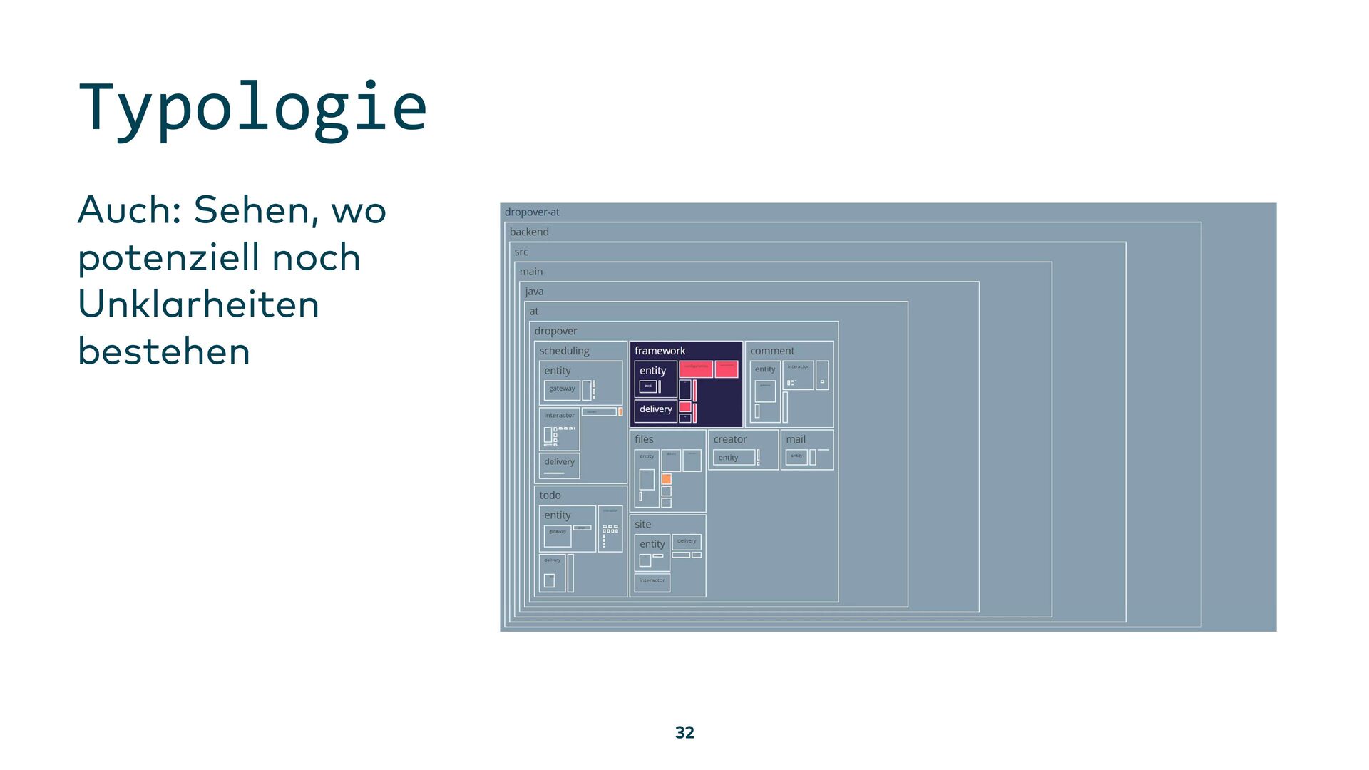 wie viel da?“ Technische Konzepte Boundary: 66 file(s) Interactor: 45 file(s) Entity: 62 file(s) Gateway: 17 file(s) Delivery: 19 file(s) RESTful API: 15 file(s) Dependency Injection: 1 file(s) Request Model: 30 file(s) Response Model: 22 file(s) POJO Entities: 10 file(s) Validation: 8 file(s) Business-Konzepte Site: 23 file(s) Comment: 28 file(s) Creator: 9 file(s) File: 22 file(s) Scheduling: 49 file(s) Todo List: 43 file(s) Mail Notification: 8 file(s) + Webseite / Forms + Tabellen + Integrationen … + Zusammenhänge