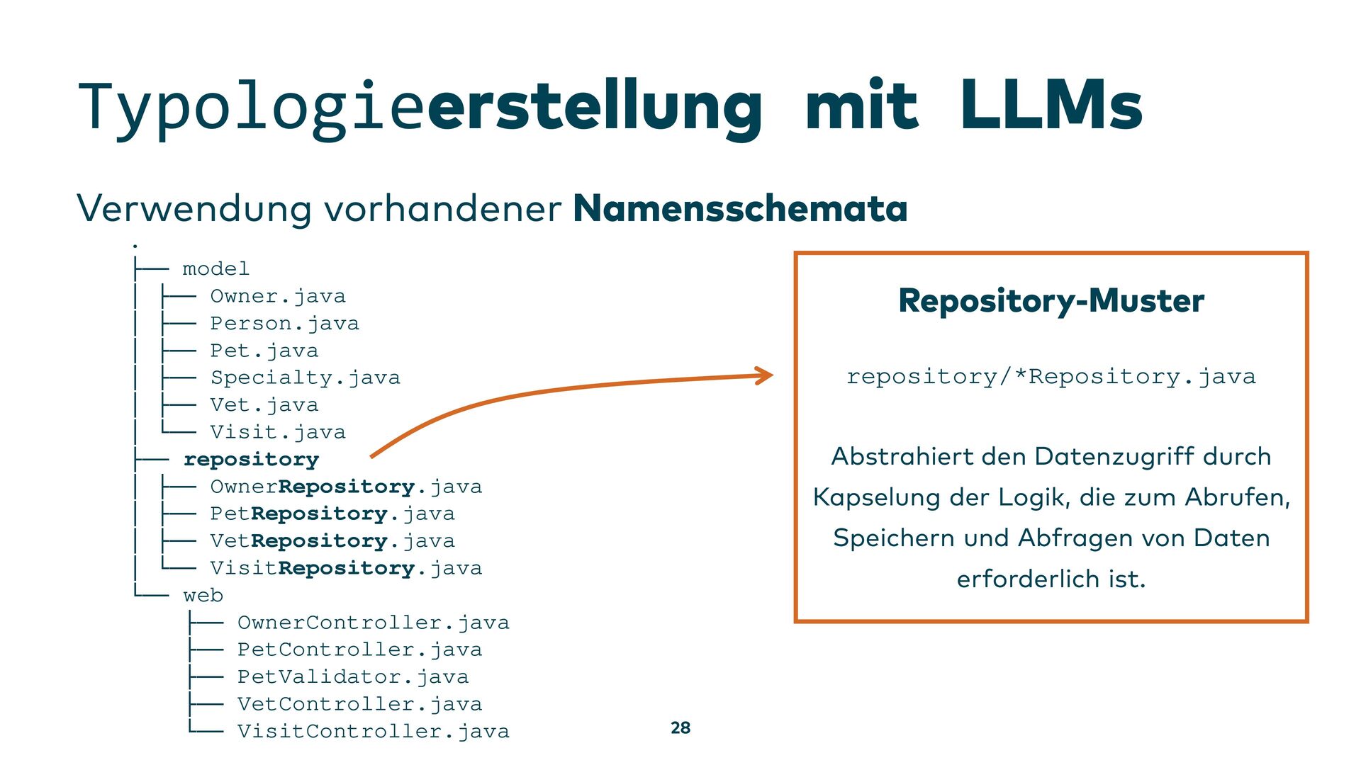 14. Typologieerstellung mit LLMs 28 Verwendung vorhandener Namensschemata Repository-Muster repository/*Repository.java Abstrahiert