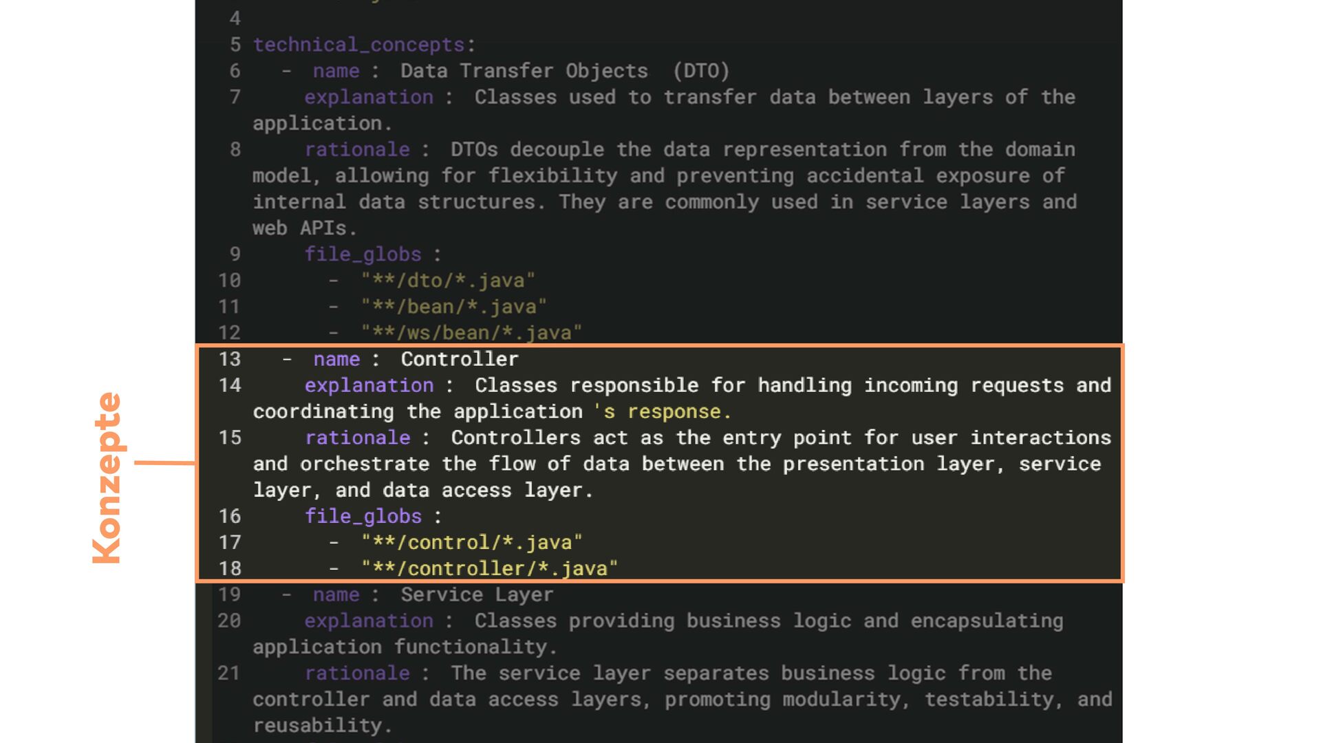 description: "Defines the interfaces for communication between the core business logic (Interactors) and the outer layers (e.g., UI, web services). It includes Request and Response Models." rationale: "Separates the core application from the delivery mechanism, allowing the presentation layer to change independently of the business rules." file_globs: - "**/boundary/*.java" ... business_concepts: - name: "Site" description: "A 'Site' represents a distinct container or context for content like comments, files, and schedules. Most other business concepts are scoped within a specific site." rationale: "The concept of a 'Site' allows for multi-tenancy or partitioning of data, where different users or groups can have their own isolated space within the application." file_globs: - "**/site/**/*.java" Glob-Muster + etwas manuelles Bearbeiten…