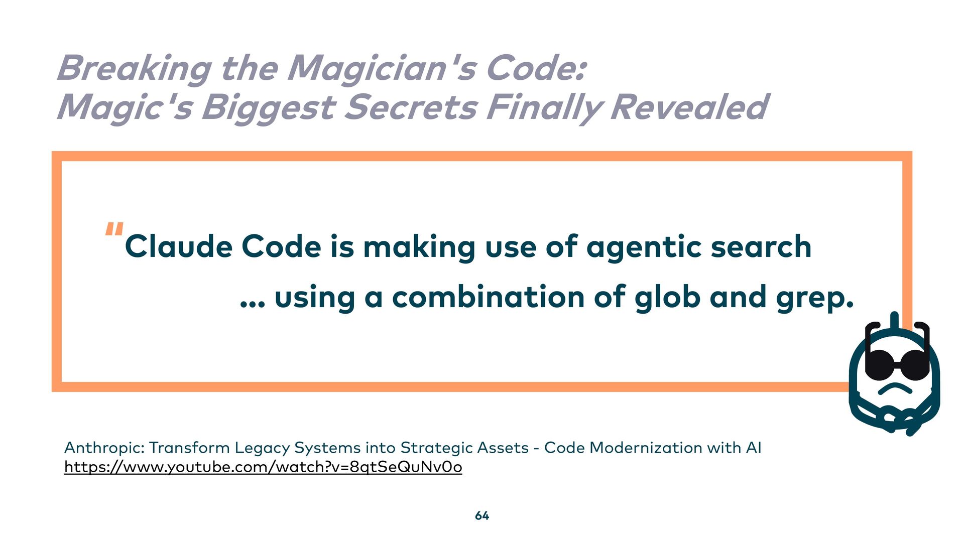 ... using a combination of glob and grep. Claude Code is making use of agentic search “ Anthropic: Transform Legacy Systems into Strategic Assets - Code Modernization with AI https://www.youtube.com/watch?v=8qtSeQuNv0o