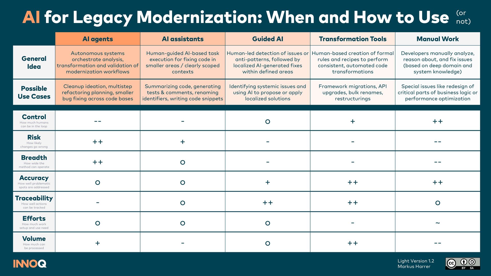 Developers manually analyze, reason about, and fix issues (based on deep domain and system knowledge) Human-based creation of formal rules and recipes to perform consistent, automated code transformations Human-led detection of issues or anti-patterns, followed by localized AI-generated fixes within defined areas Human-guided AI-based task execution for fixing code in smaller areas / clearly scoped contexts Autonomous systems orchestrate analysis, transformation and validation of modernization workflows General Idea Special issues like redesign of critical parts of business logic or performance optimization Framework migrations, API upgrades, bulk renames, restructurings Identifying systemic issues and using AI to propose or apply localized solutions Summarizing code, generating tests & comments, renaming identifiers, writing code snippets Cleanup ideation, multistep refactoring planning, smaller bug fixing across code bases Possible Use Cases ++ + o - -- Control How much humans can be in the loop -- - - + ++ Risk How likely changes go wrong -- - - o ++ Breadth How wide the method can operate ++ ++ + o o Accuracy How well problematic spots are addressed o ++ ++ o - Traceability How well actions can be tracked ~ - o o o Efforts How much work setup and use need -- ++ o - + Volume How much can be processed Light Version 1.2 Markus Harrer AI for Legacy Modernization: When and How to Use (or not)
